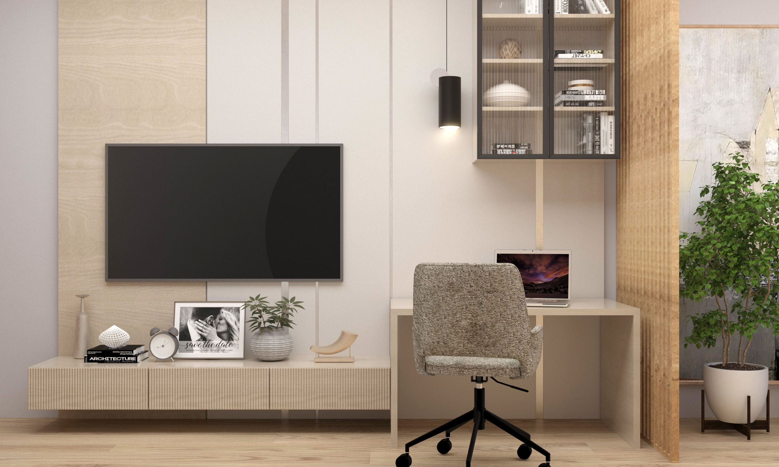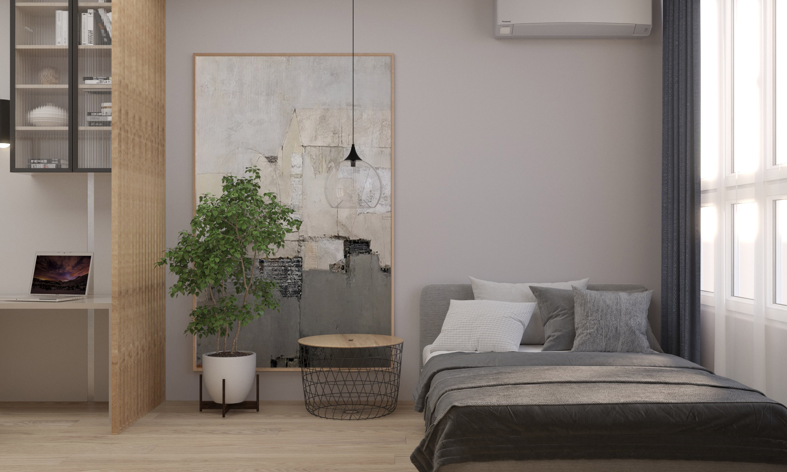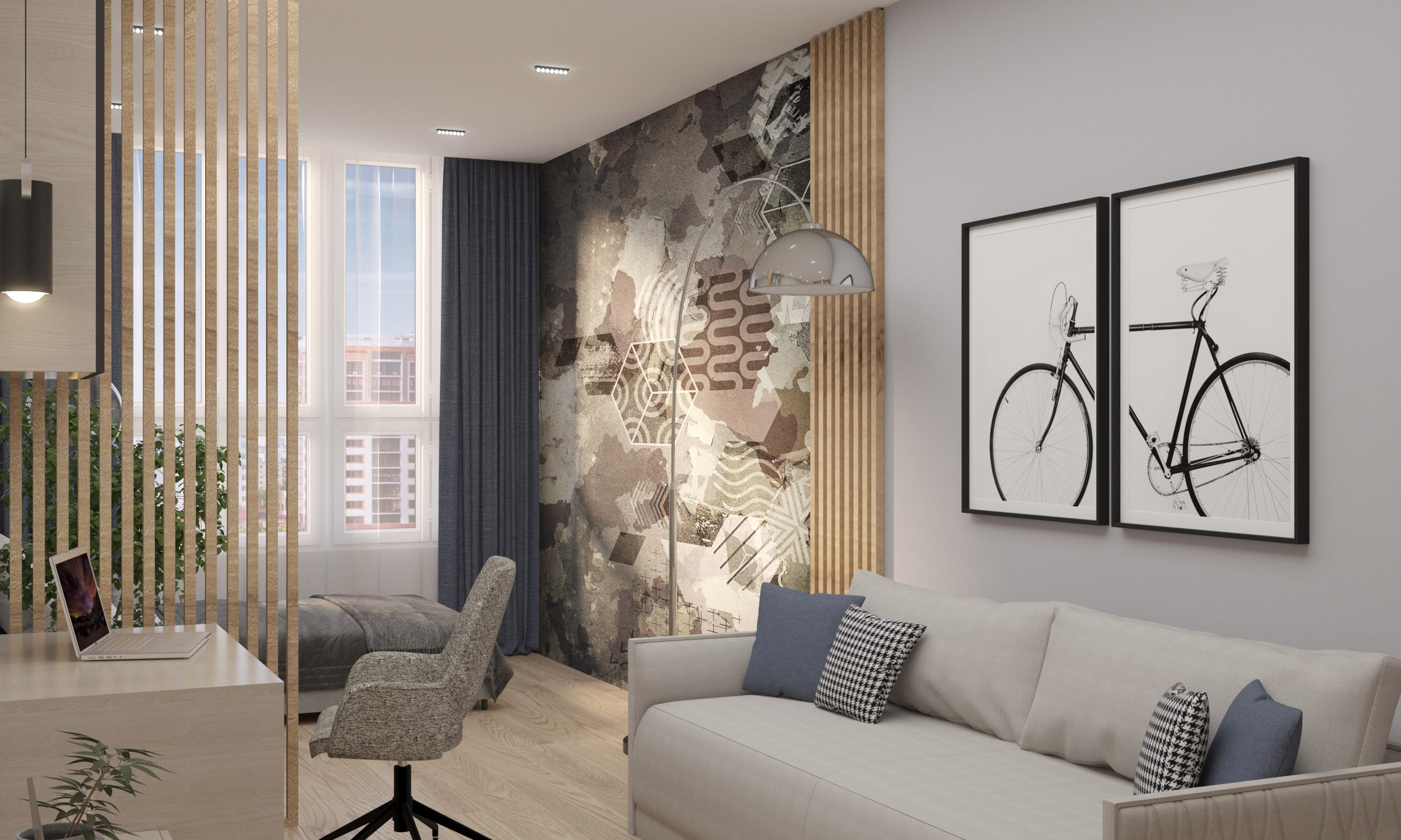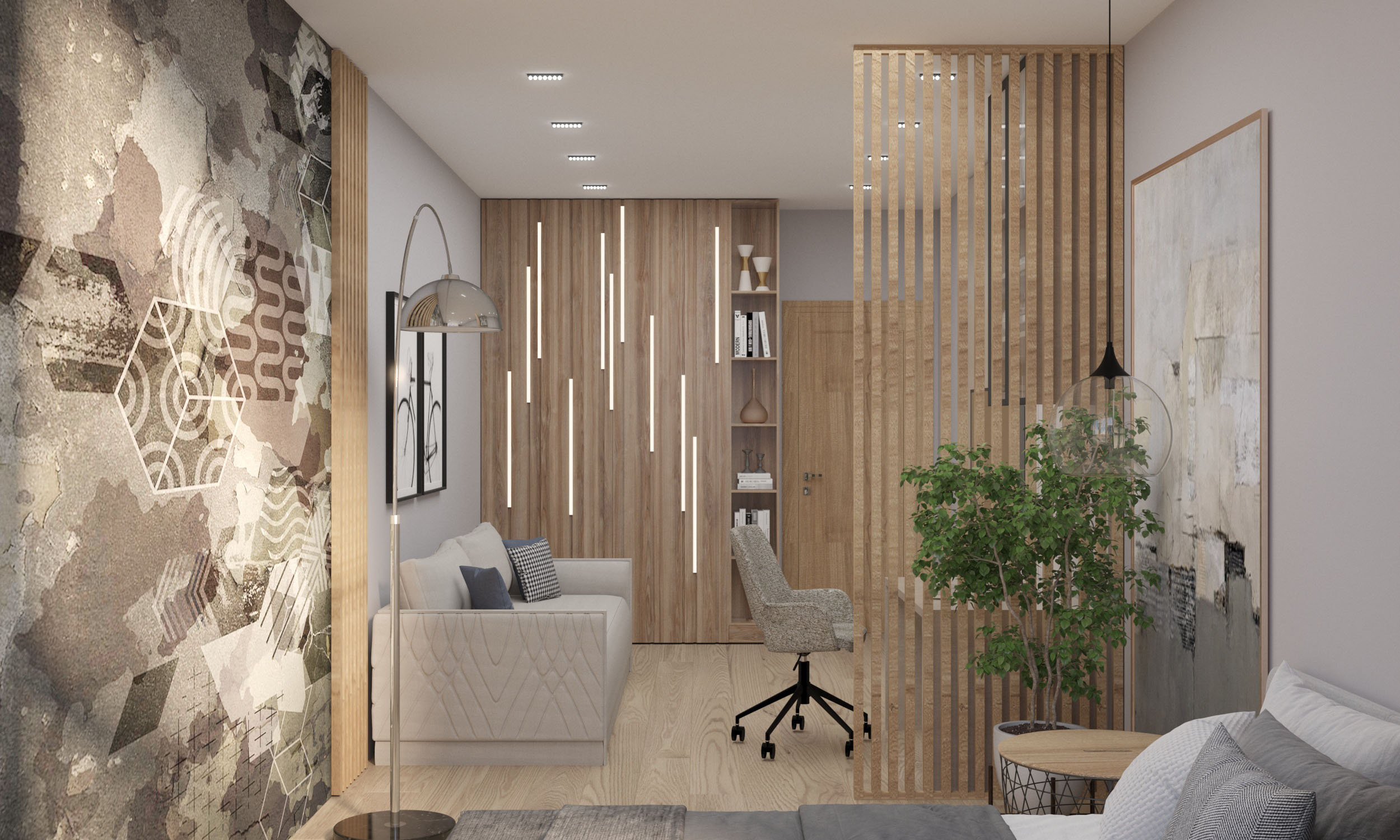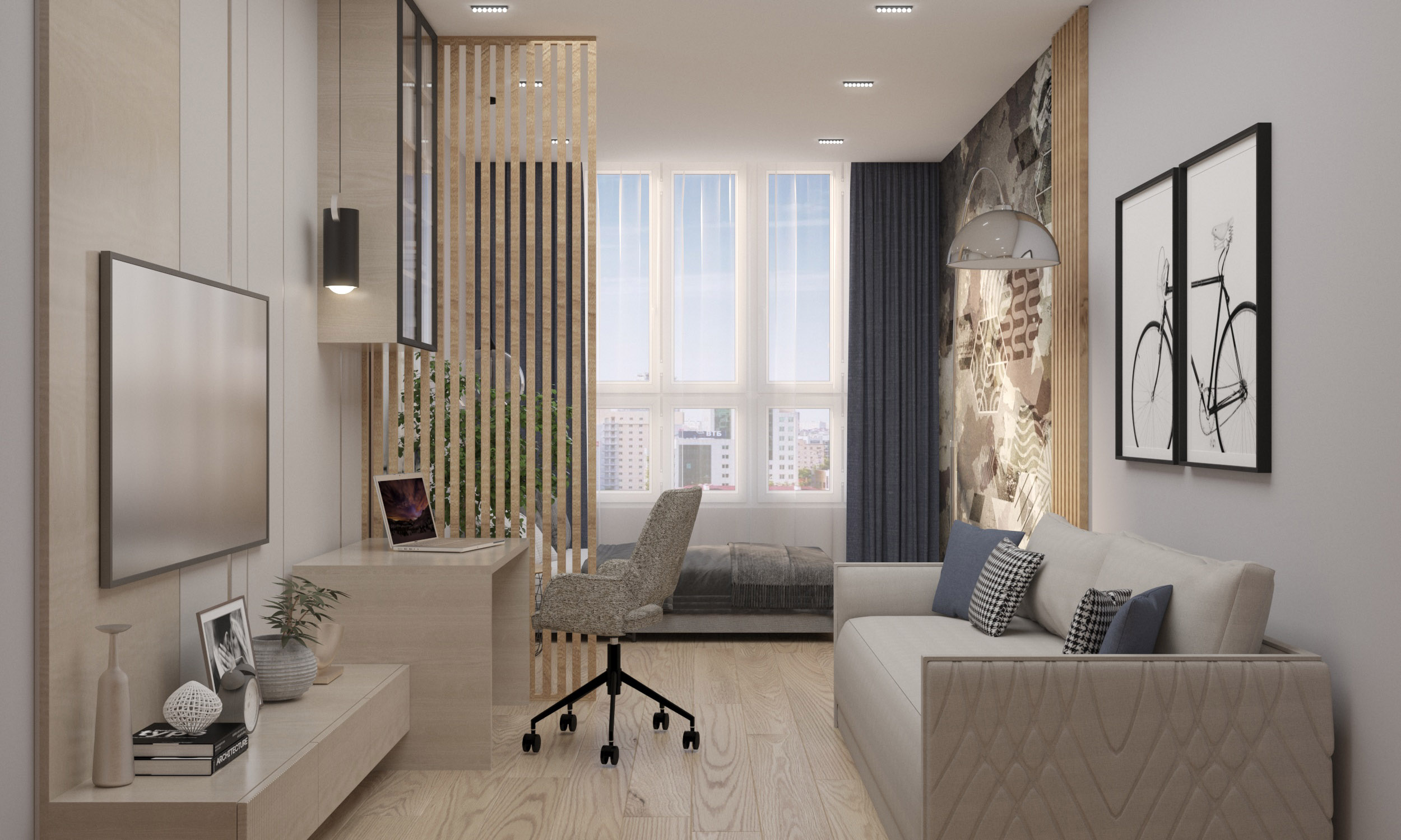 Однокомнатная квартира в г. Краснодар. Общая площадь 52 м². Проект для молодой женщины с сыном подростком. Задача была увеличить площади комнат за счет лоджий и из двух помещений-вагонов сделать разделение на зоны, чтобы и маме, и сыну было комфортно существовать вместе. Комнату отдали под нужды сына, где расположились и зона отдыха, и спальное место, и рабочий уголок.