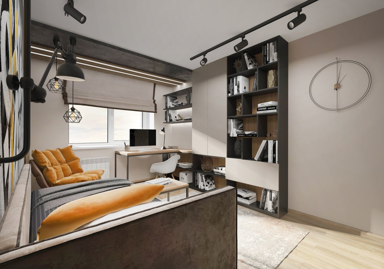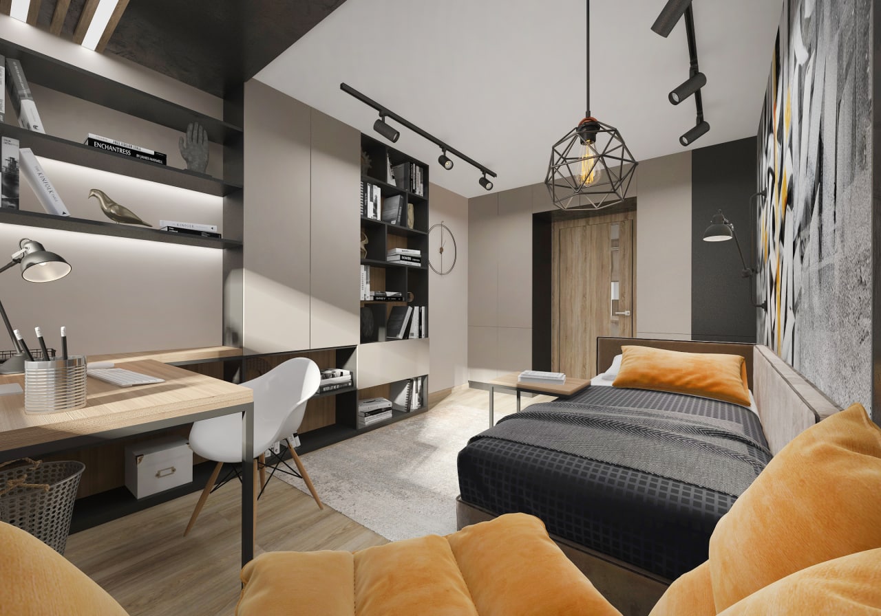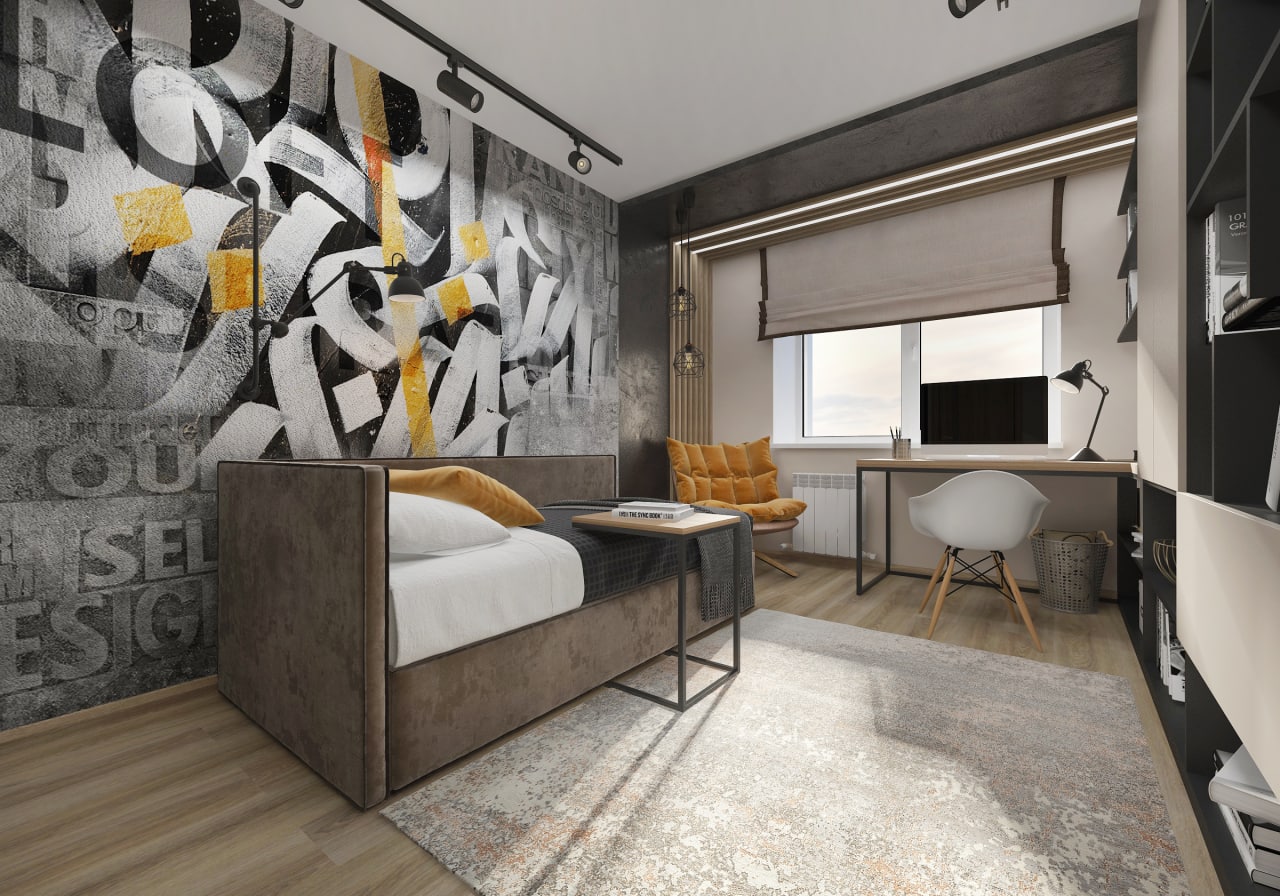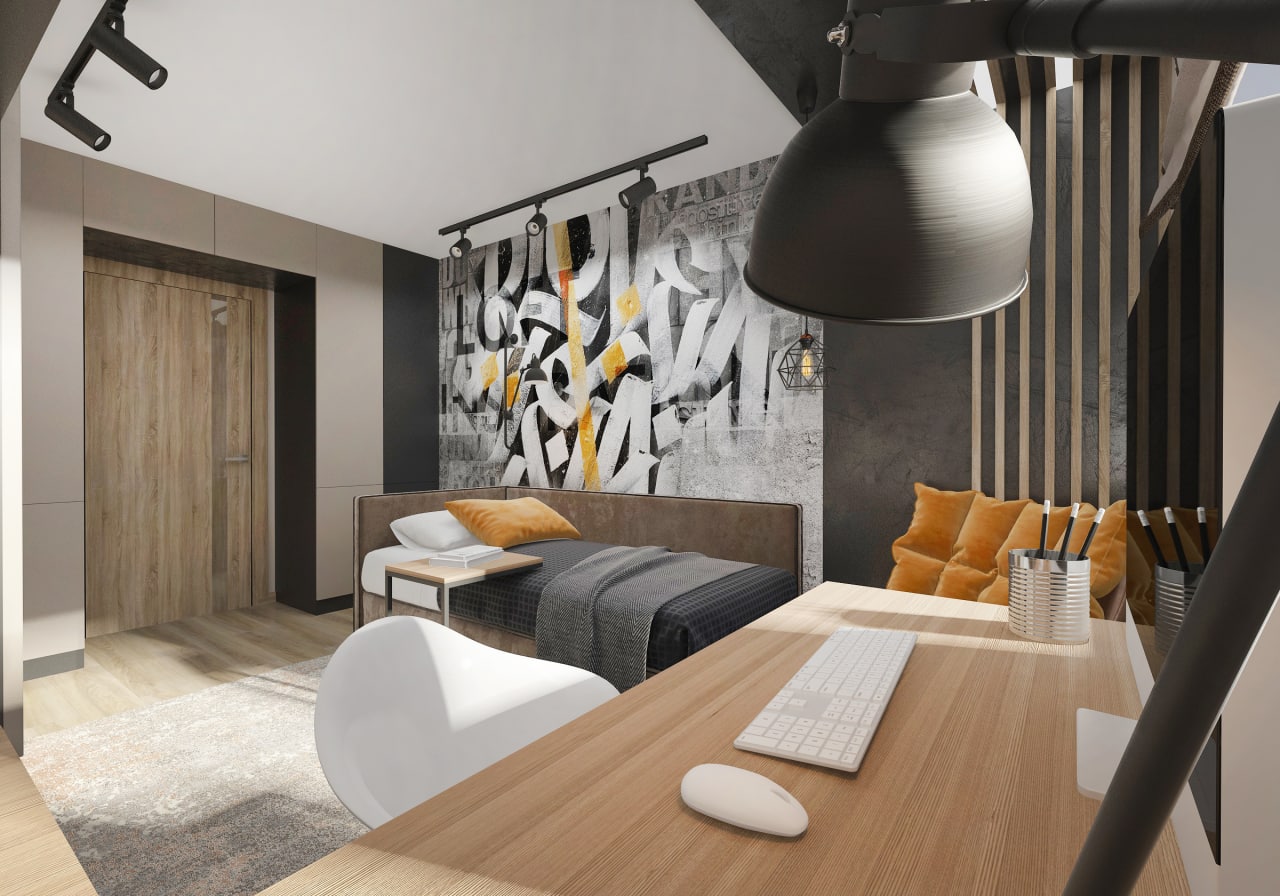 Комната парня 16 лет, почти студент. Заказчику хотелось современный интерьер с элементами лофта, чтобы комната отражала внутренний мир и подчеркивала индивидуальность молодого человека. Поэтому в интерьер выбрали яркую и неординарную фреску из коллекции podLOFT.