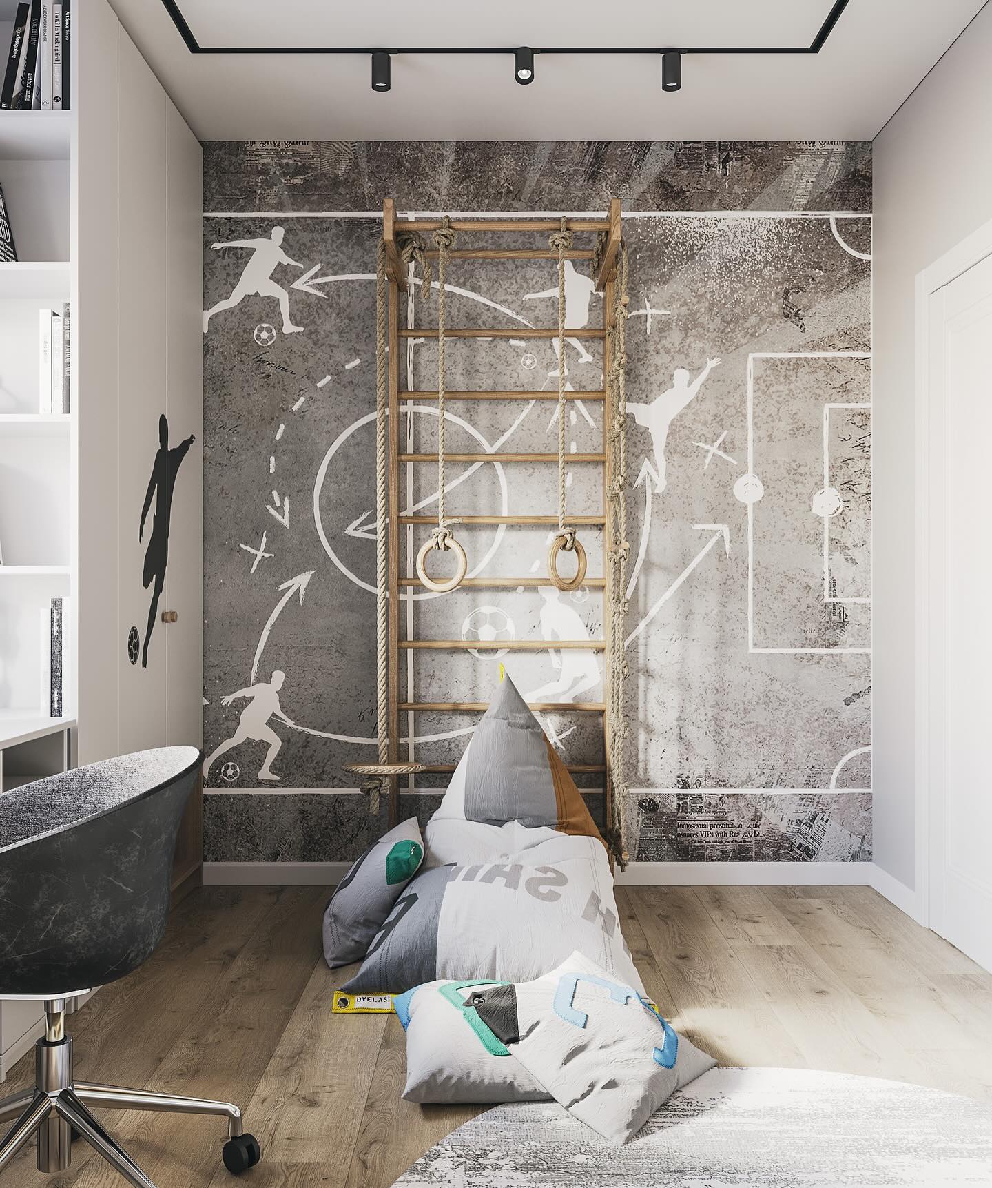 Детская для мальчика в проекте дома в г. Наро-Фоминск. Компьютерные игры, машины, футбол – то, что придется по вкусу мятежному подростку. Поэтому обои PODROST идеально подойдут, чтобы отразить бунтарскую натуру тинейджера.