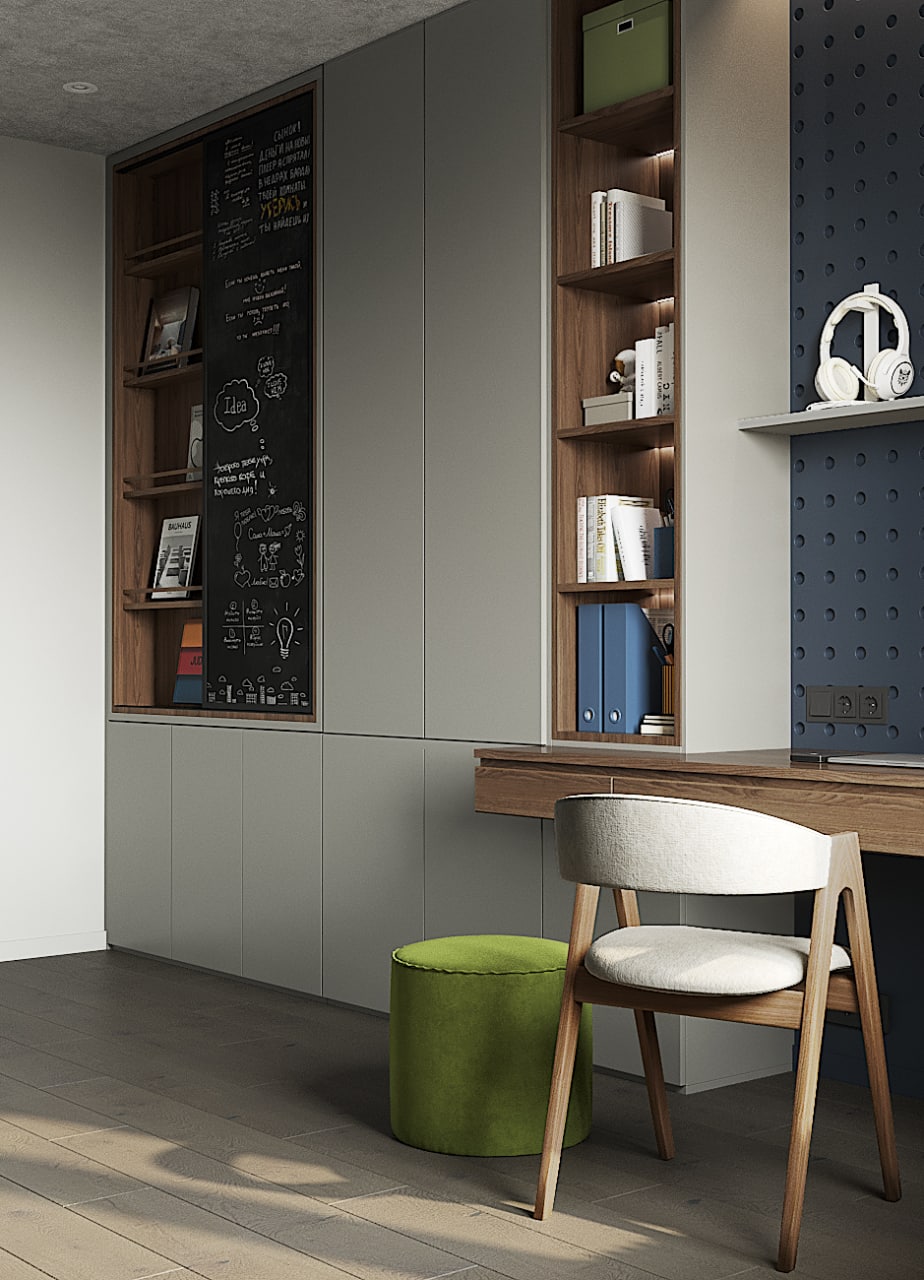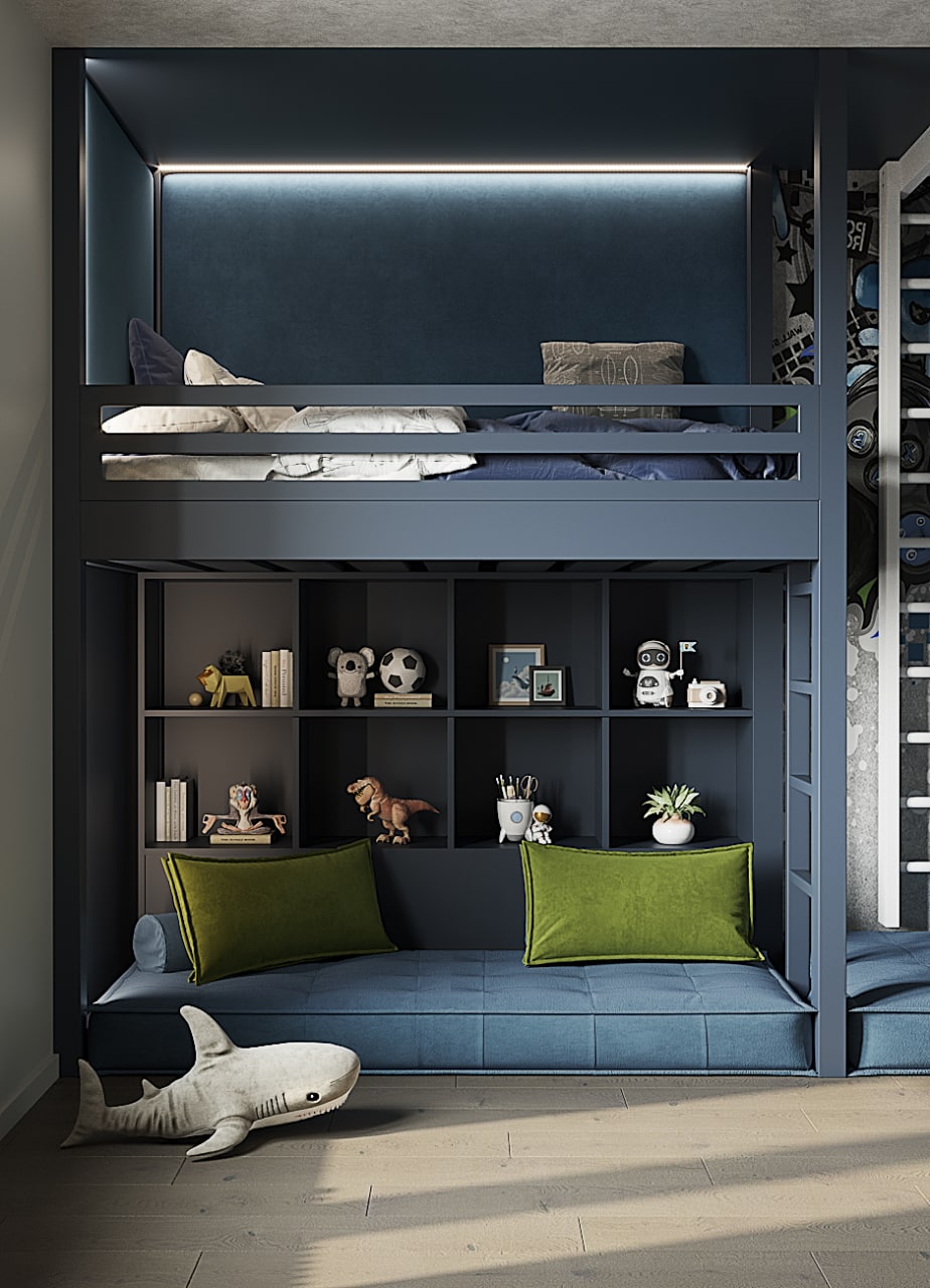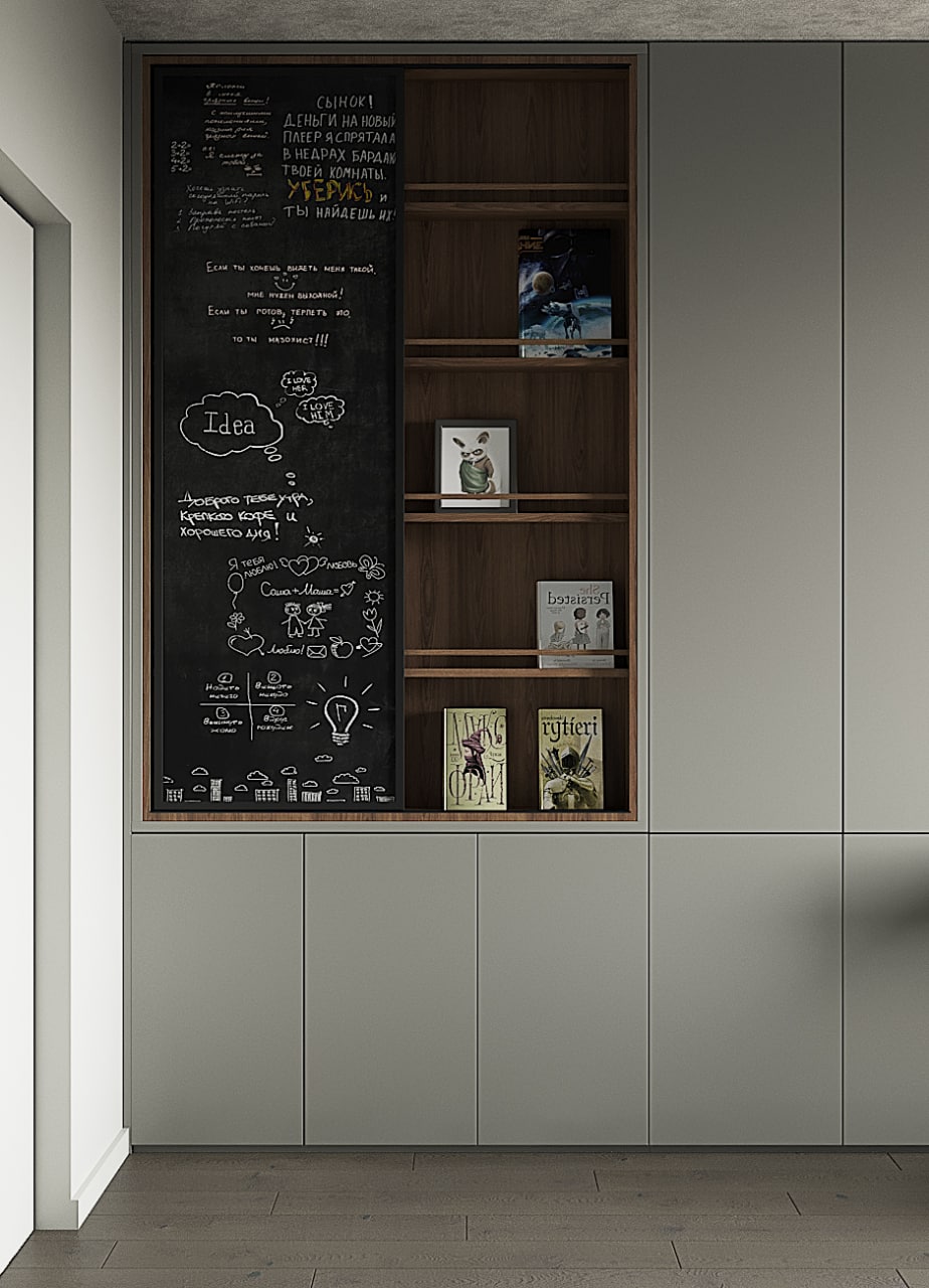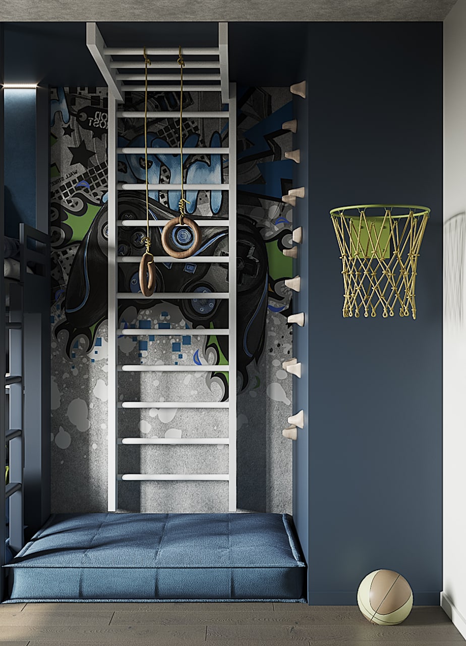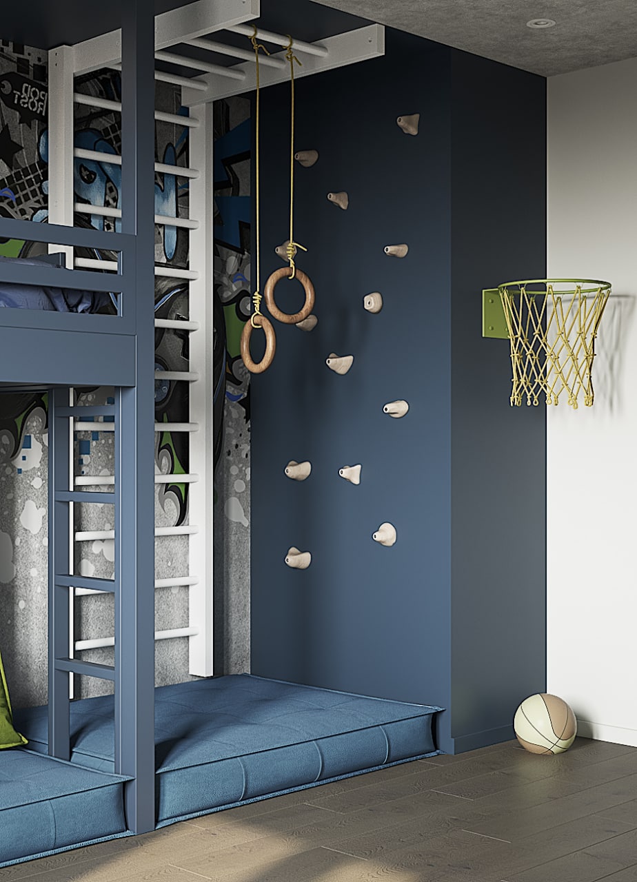 Спальня для мальчика из дизайн-проекта квартиры в ЖК «Книги», г. Нижний Новгород. Для заказчиков было важно выделить игровую зону и спортивный уголок, при которой спальное место будет на втором уровне. При данной конфигурации комнаты удалось спрятать несущую колонну за шкафом, который смотрится как единый цельный объем. На месте колонны сделали неглубокие полки и передвижную грифельную доску, на которой можно рисовать и оставлять себе напоминания)