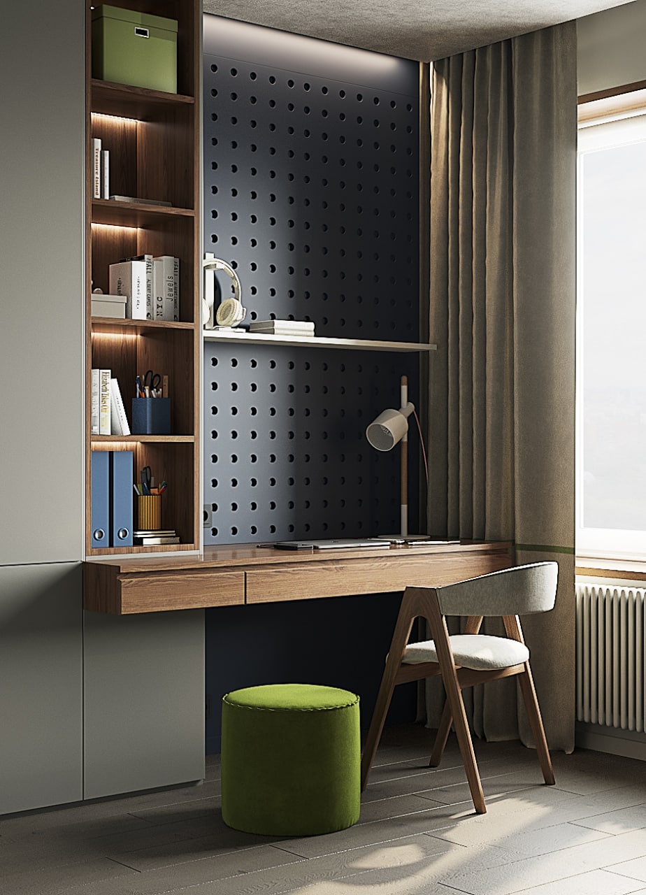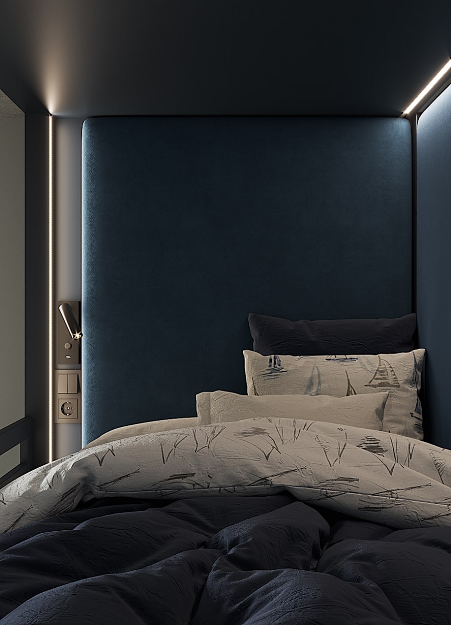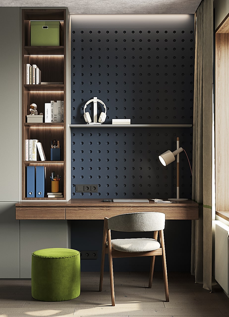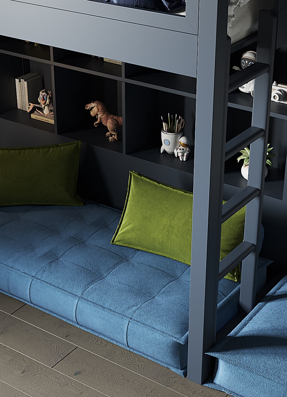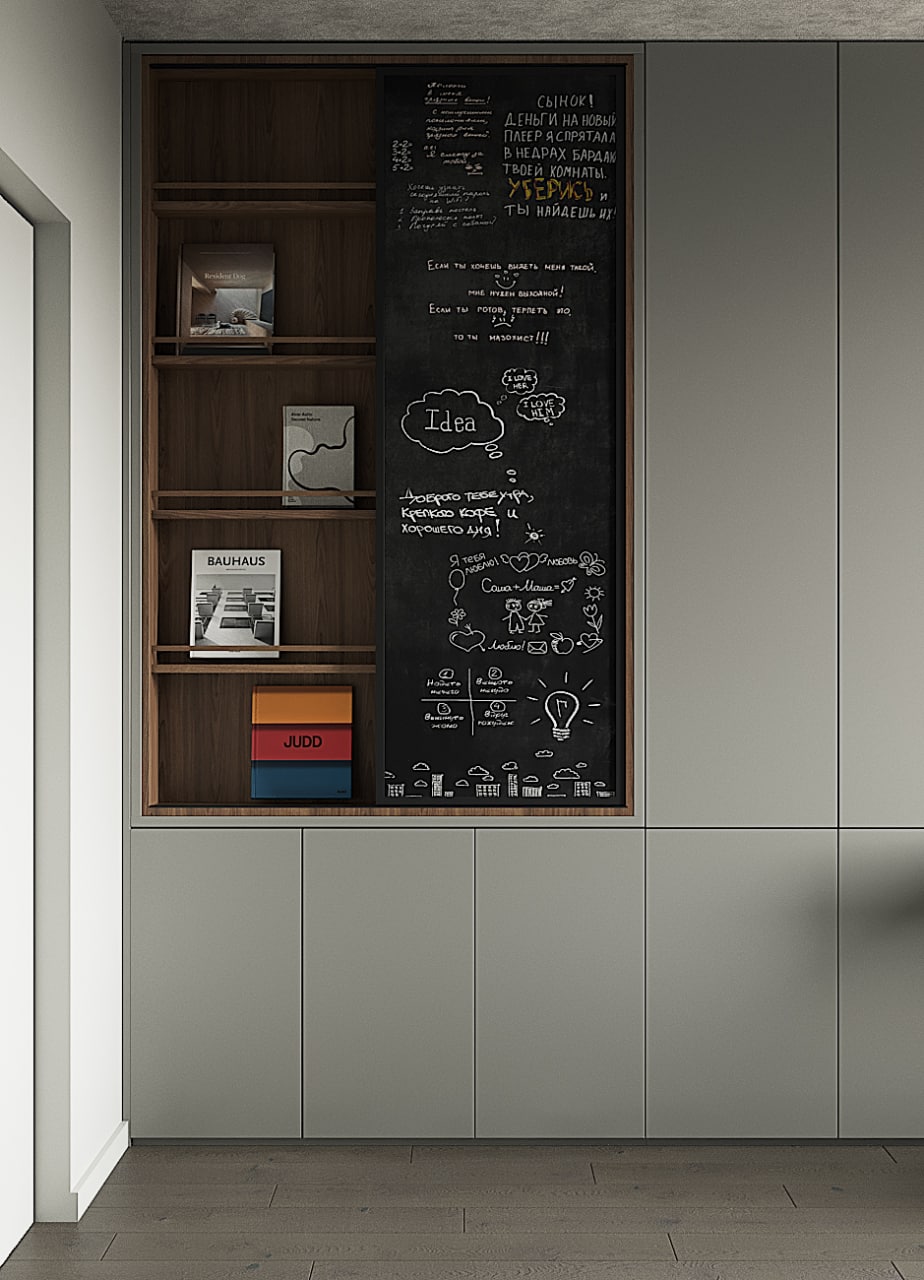Спальня для мальчика из дизайн-проекта квартиры в ЖК «Книги», г. Нижний Новгород. Для заказчиков было важно выделить игровую зону и спортивный уголок, при которой спальное место будет на втором уровне. При данной конфигурации комнаты удалось спрятать несущую колонну за шкафом, который смотрится как единый цельный объем. На месте колонны сделали неглубокие полки и передвижную грифельную доску, на которой можно рисовать и оставлять себе напоминания)