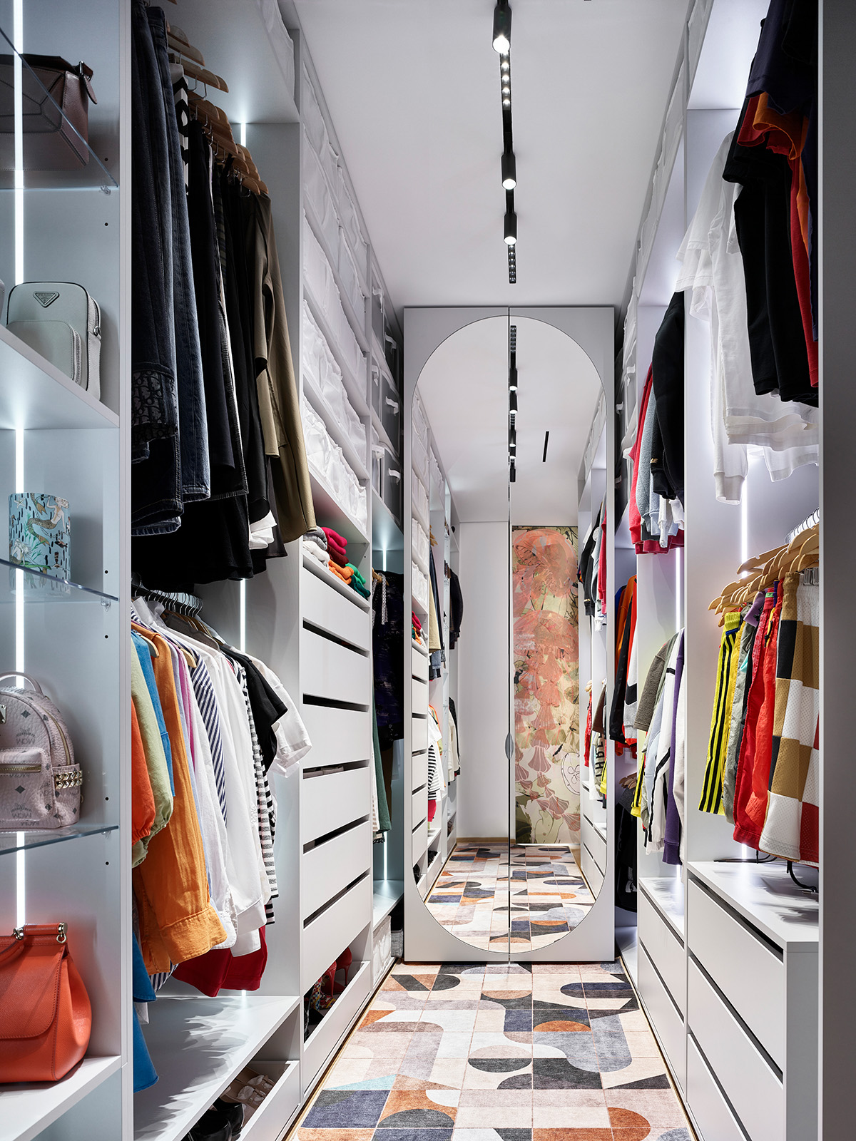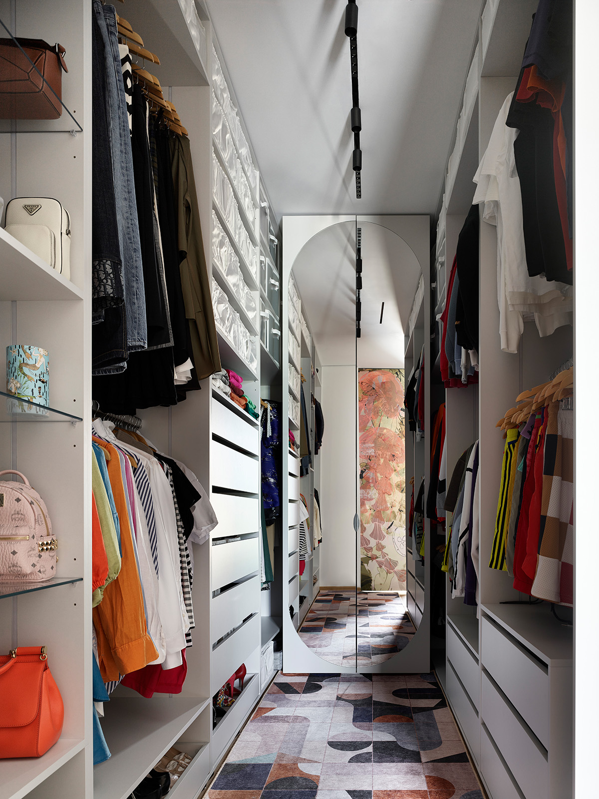 В гардеробную требовался ковер определенного размера с дизайном, который бы подходил общей концепции. И в этом случае опять как нельзя кстати оказался новый продукт Wall Street — НеоКовер, который может быть любой формы, размера и, разумеется, с любым изображением.