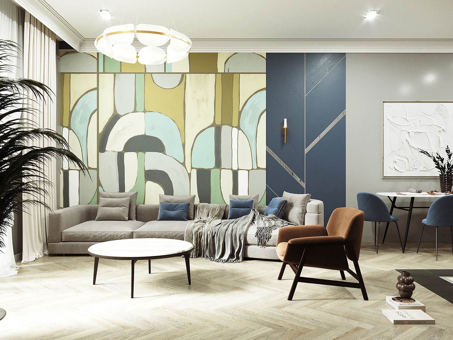 Проект кухни-гостиной с использованием обоев из коллекции «Puzzle». Яркость, экспрессия и капелька тайны сложились вместе, чтобы создать радостную атмосферу и художественную эстетику.