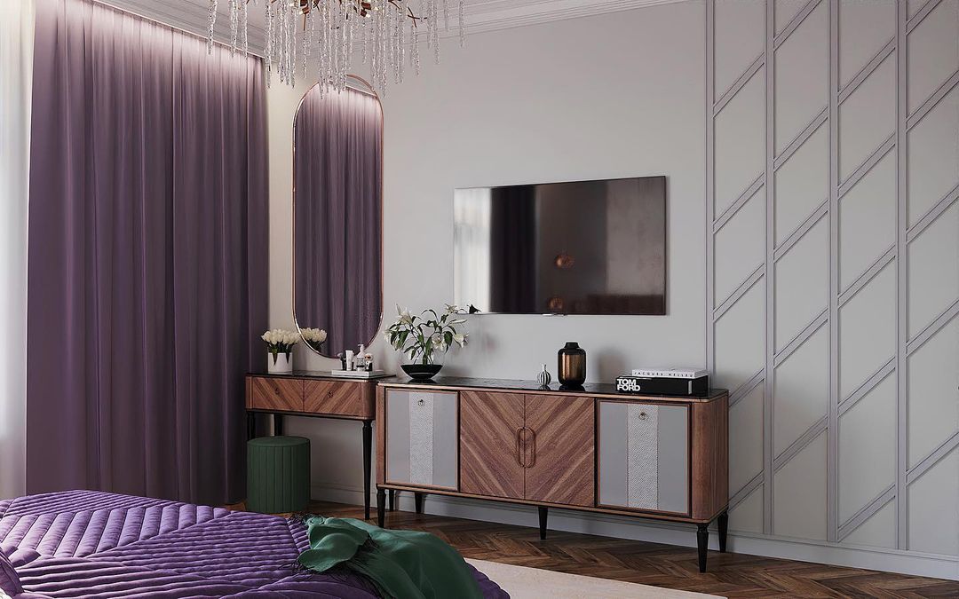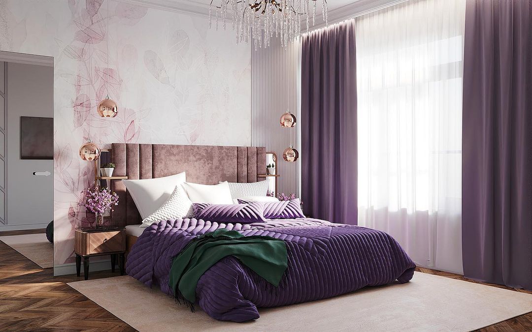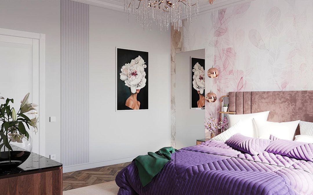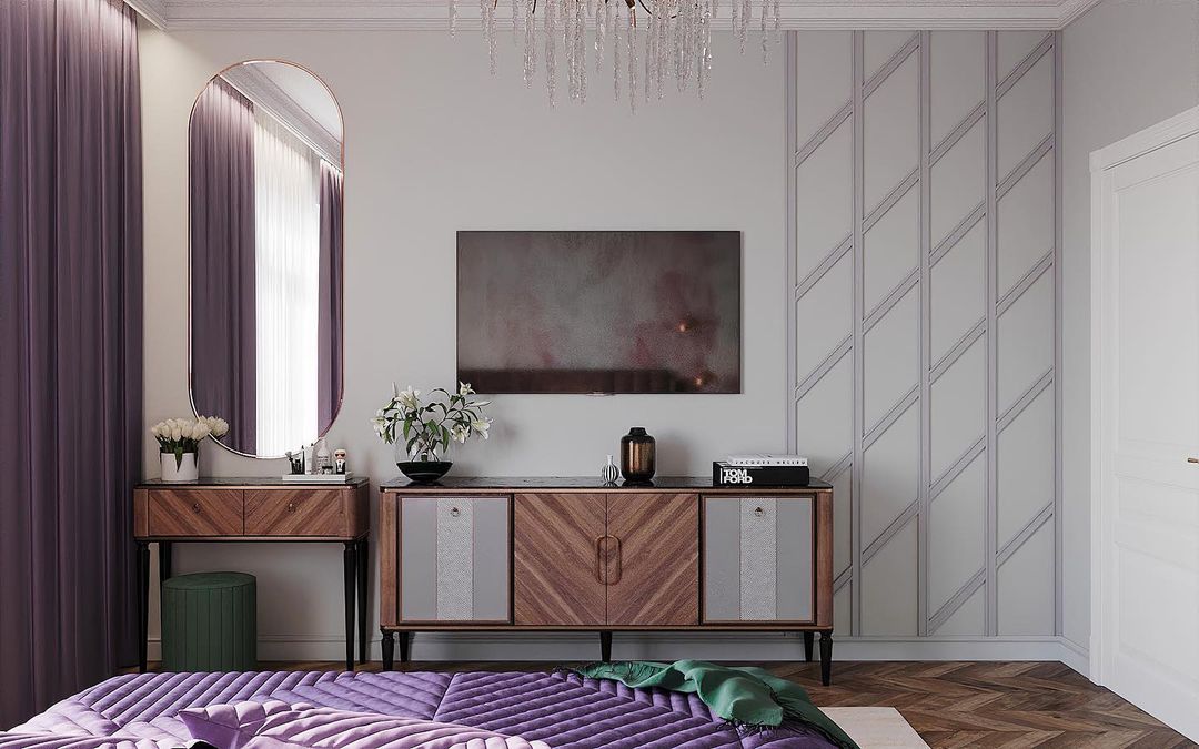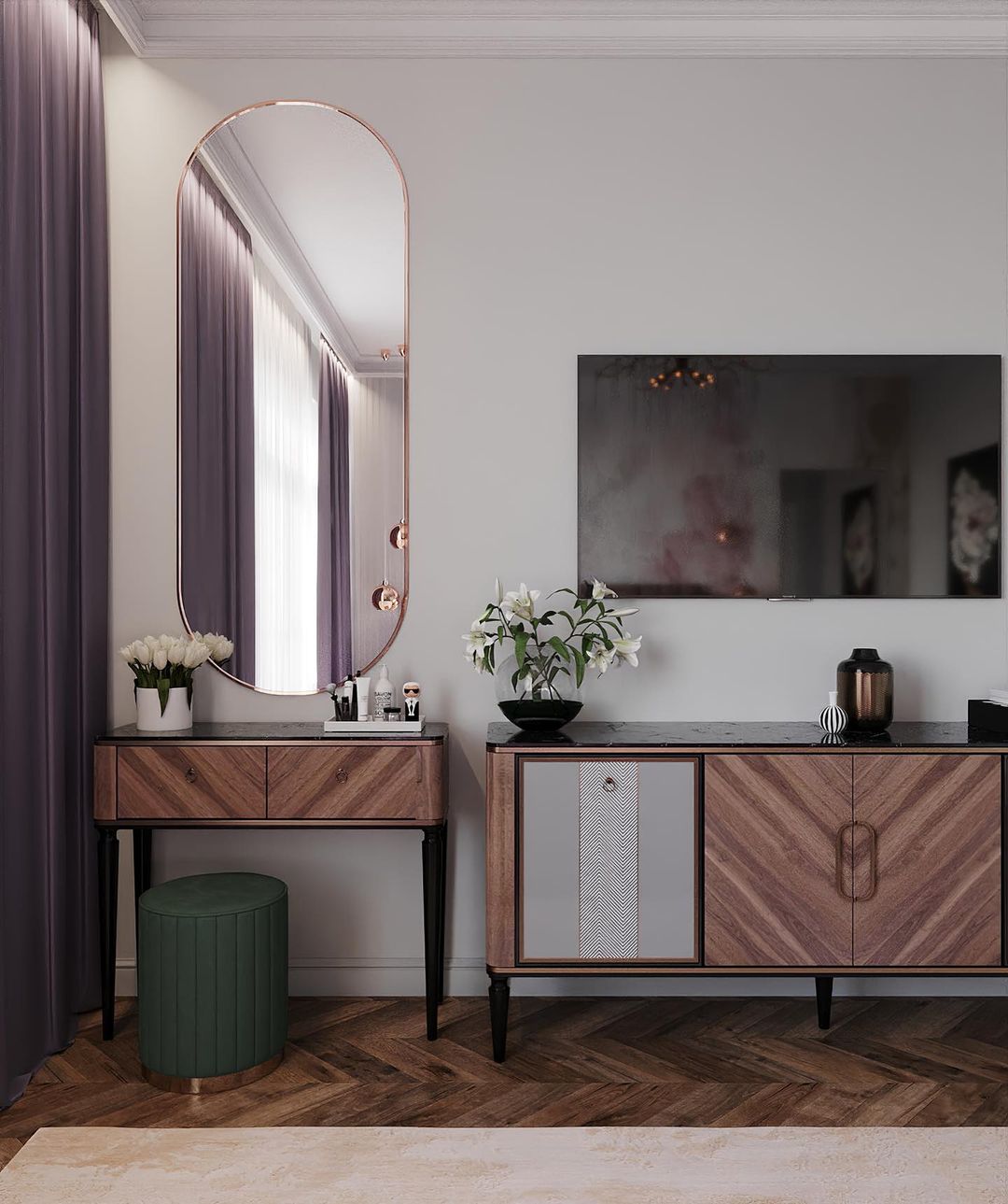 Проект спальни площадью 25,5 м². Вход в гардеробную оформлен зеркальной дверью. Благодаря этому заказчики, выходя из гардеробной, смогут увидеть себя в полный рост. Цвет стен подобран нейтральный, чтобы создать акценты на обоях, текстиле и мебели. Обои «Selva-2019» добавили помещению нежности и воздушности.