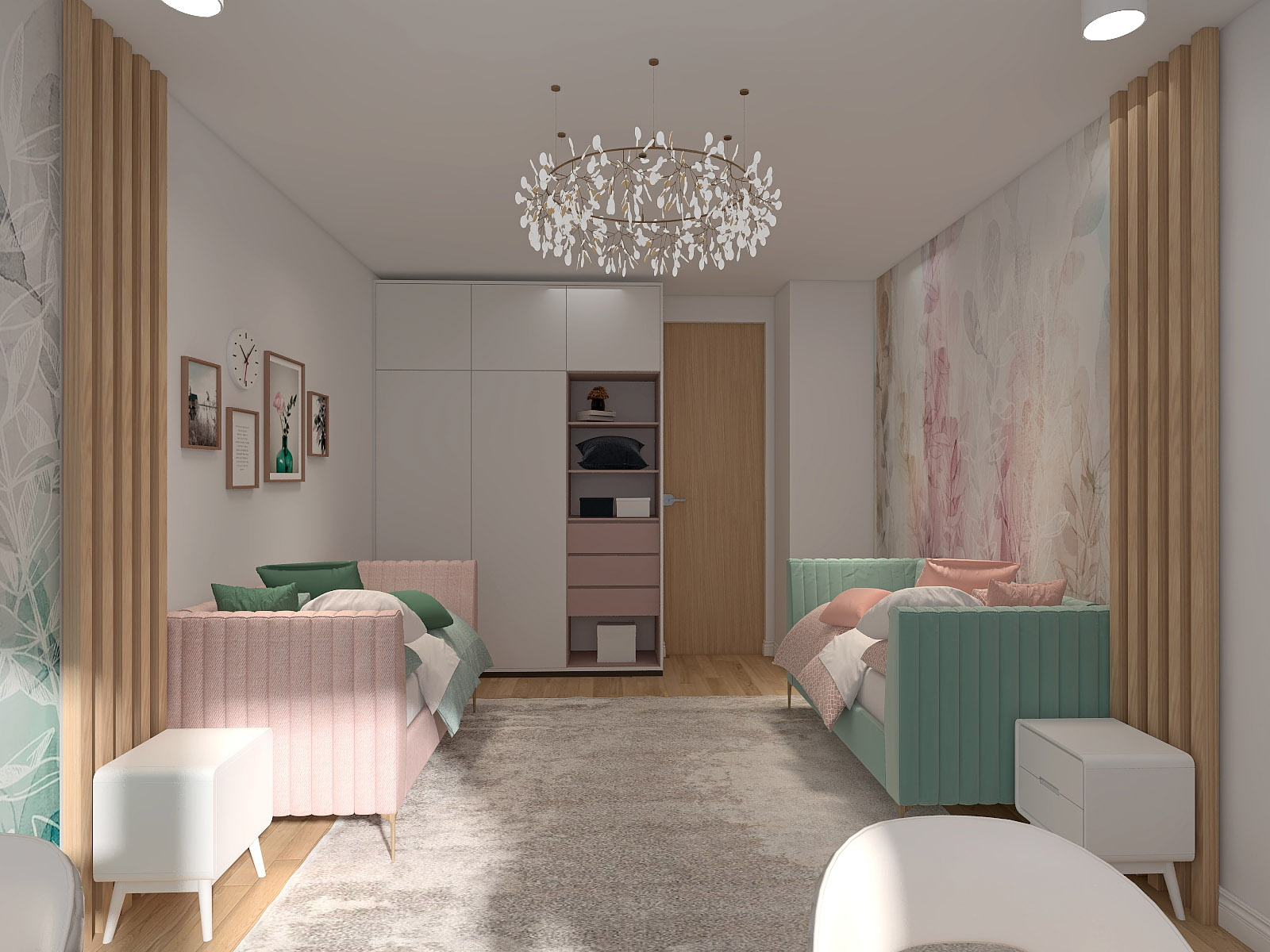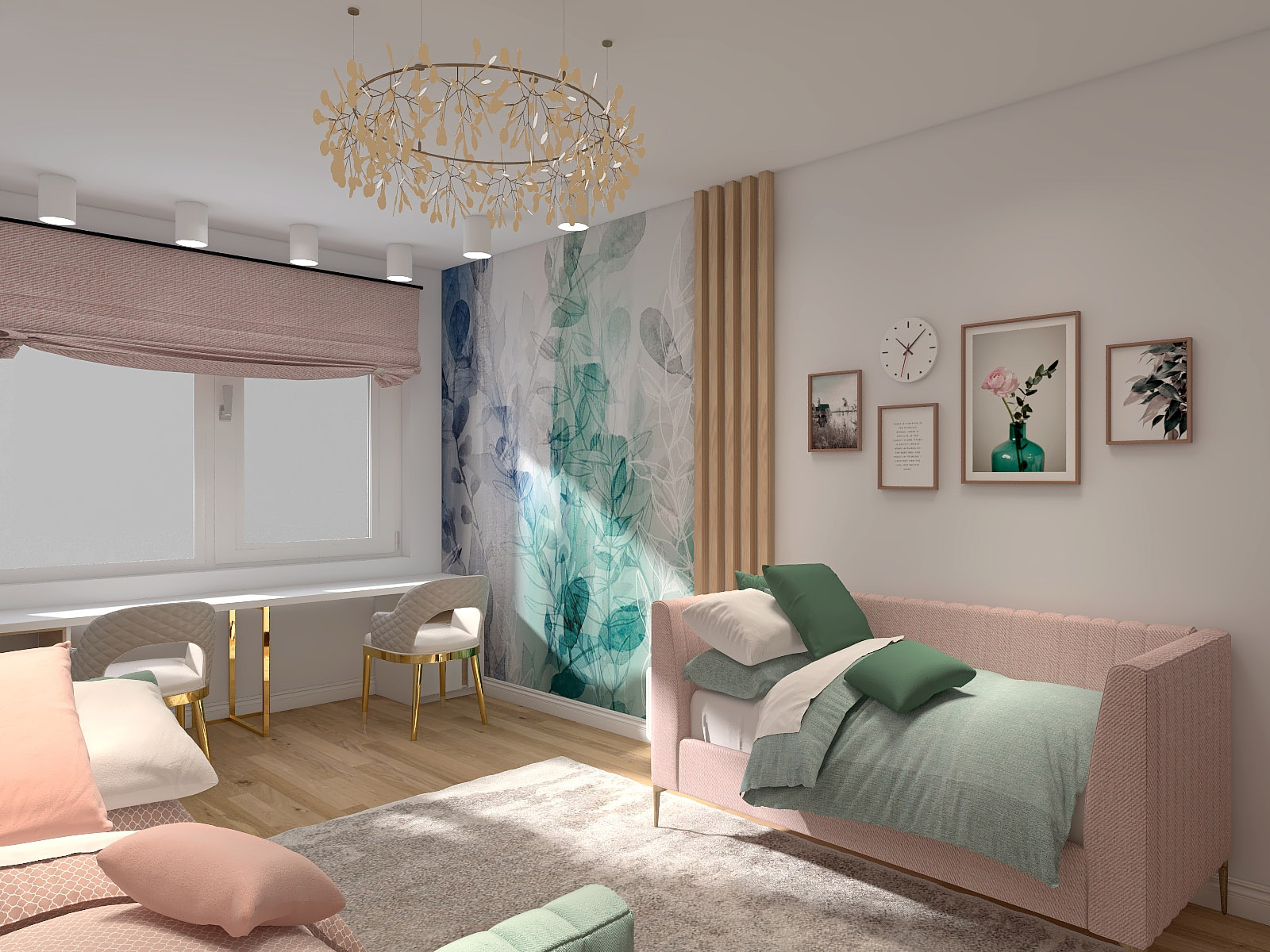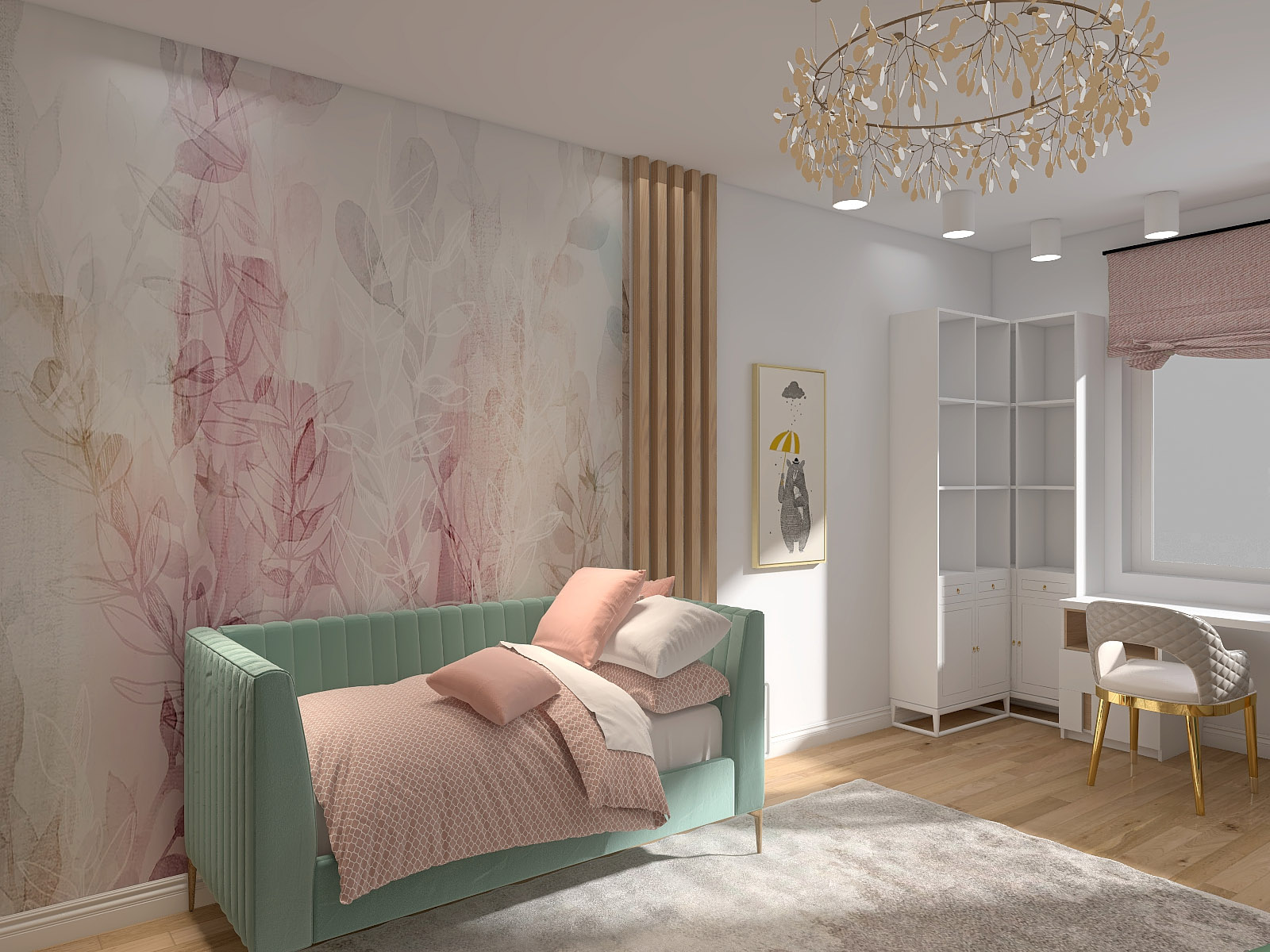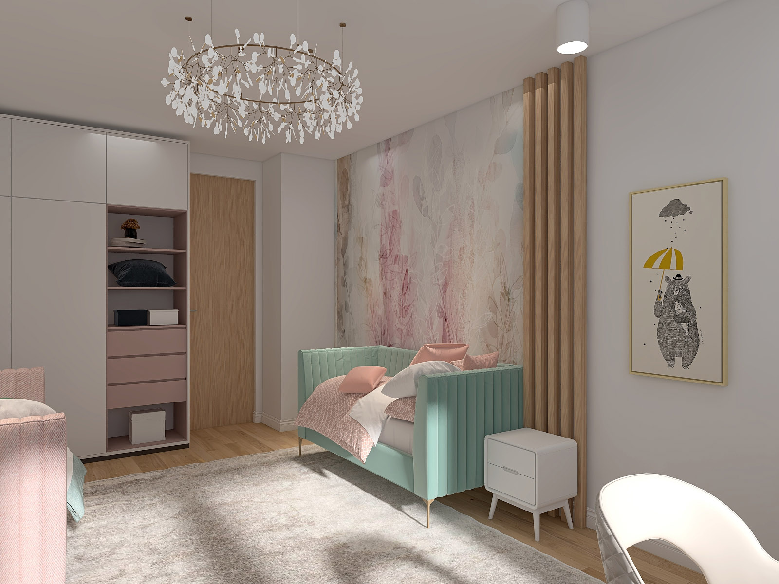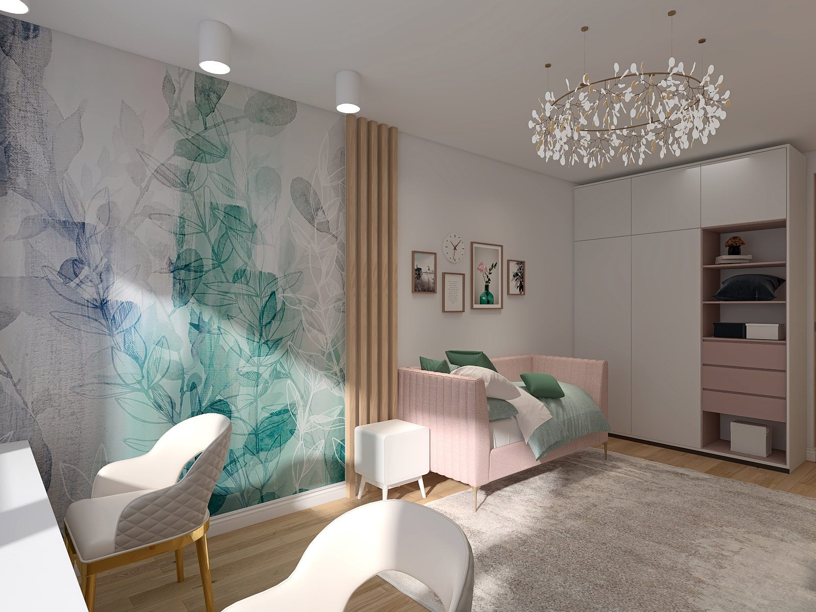 В декоре использовались дизайнерские обои нежных волшебных растительных принтов из коллекции «Selva-2019» разного цвета, много сценариев освещения и деление стен декоративными рейками. Особенности проекта — много милоты и нежности)