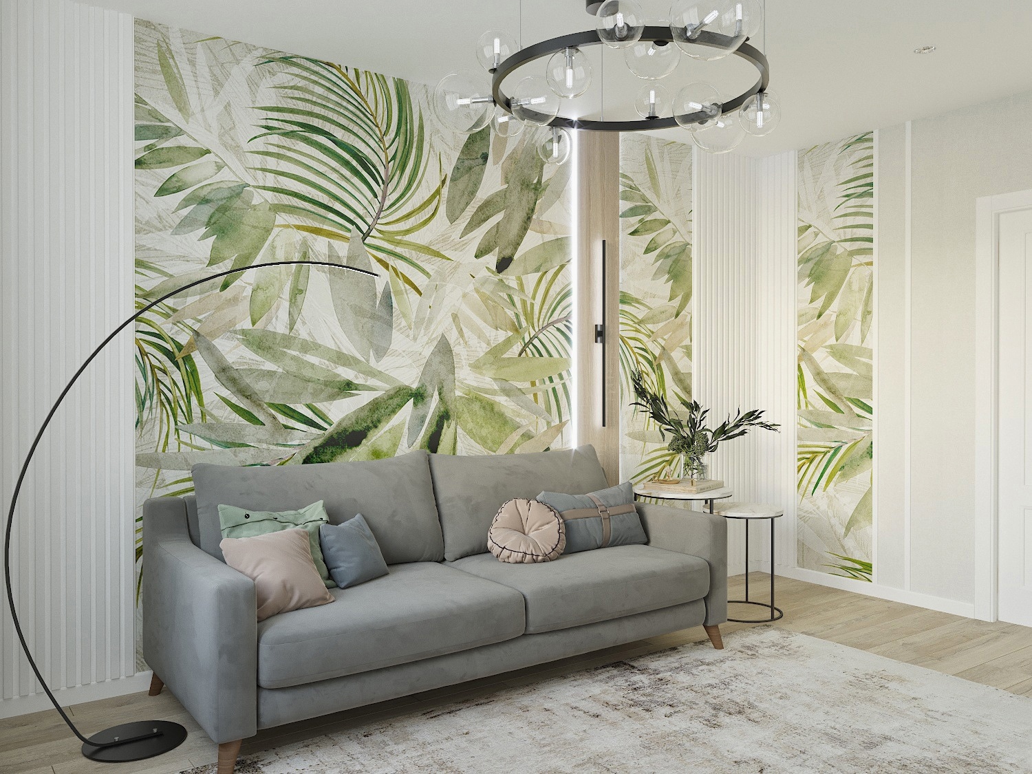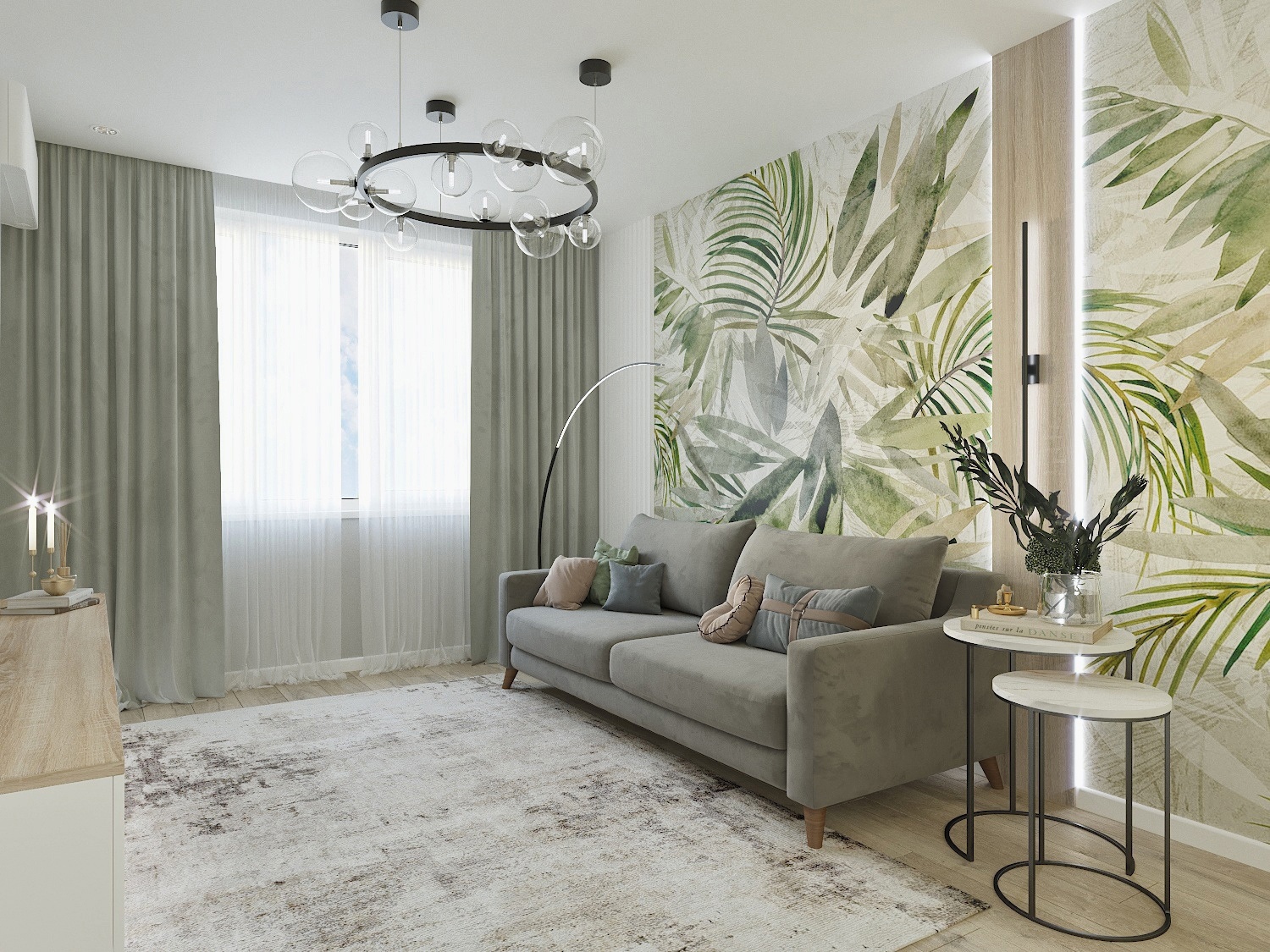 Гостиная в спокойных тонах с тропическими обоями