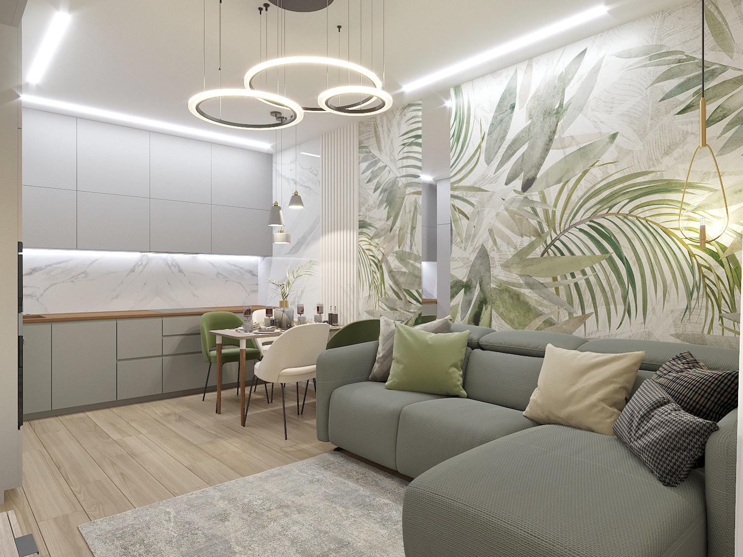 Кухня-гостиная площадью 17,3 м² из проекта двухкомнатной квартиры для мамы и девочки-подростка, г. Санкт-Петербург. Запрос был на серо-бежево-оливковые цвета в сочетании с мрамором и золотом. Обои из коллекции SELVA-2019 создали нежный акцент и добавили помещению легкости и воздушности.