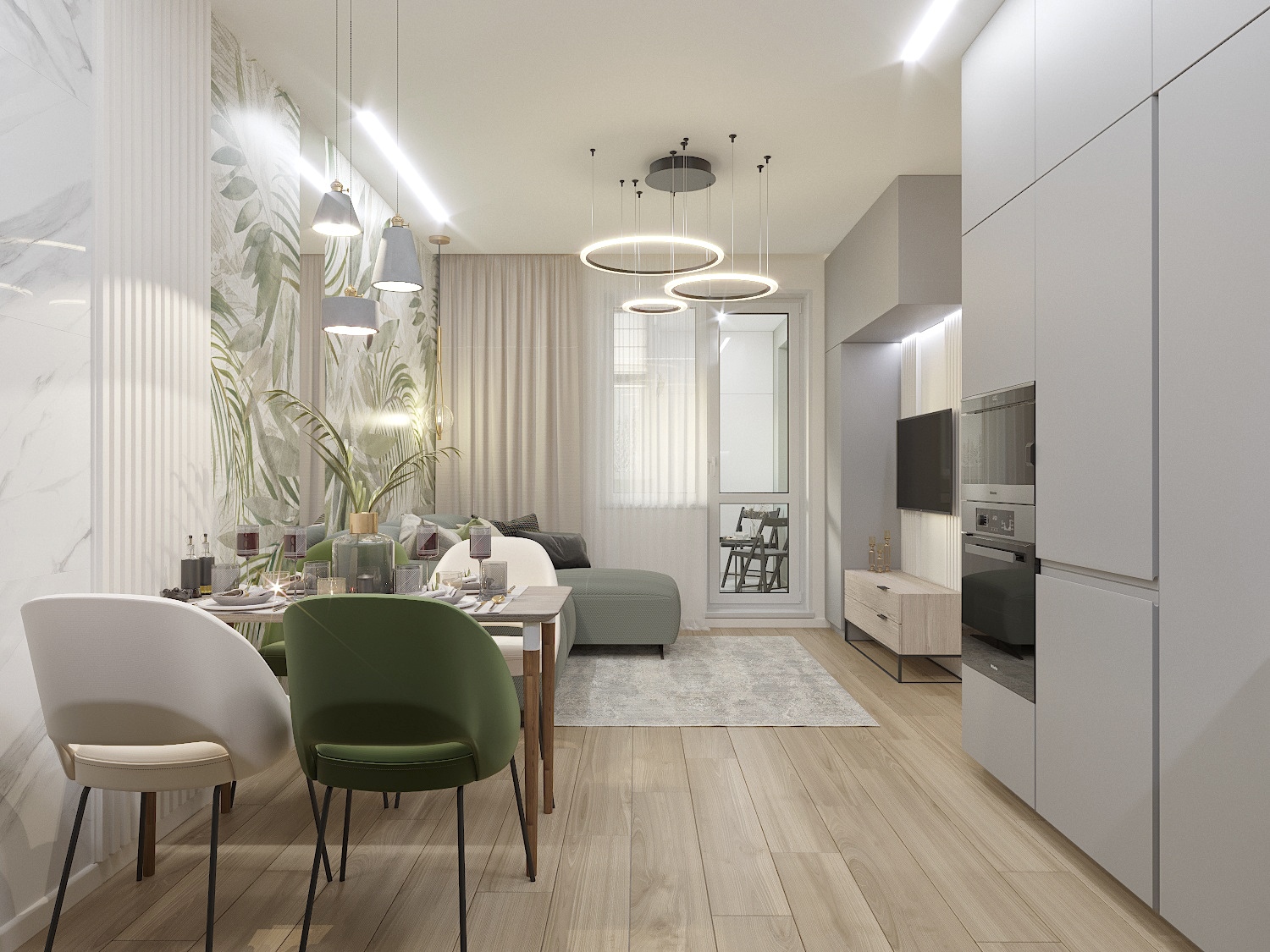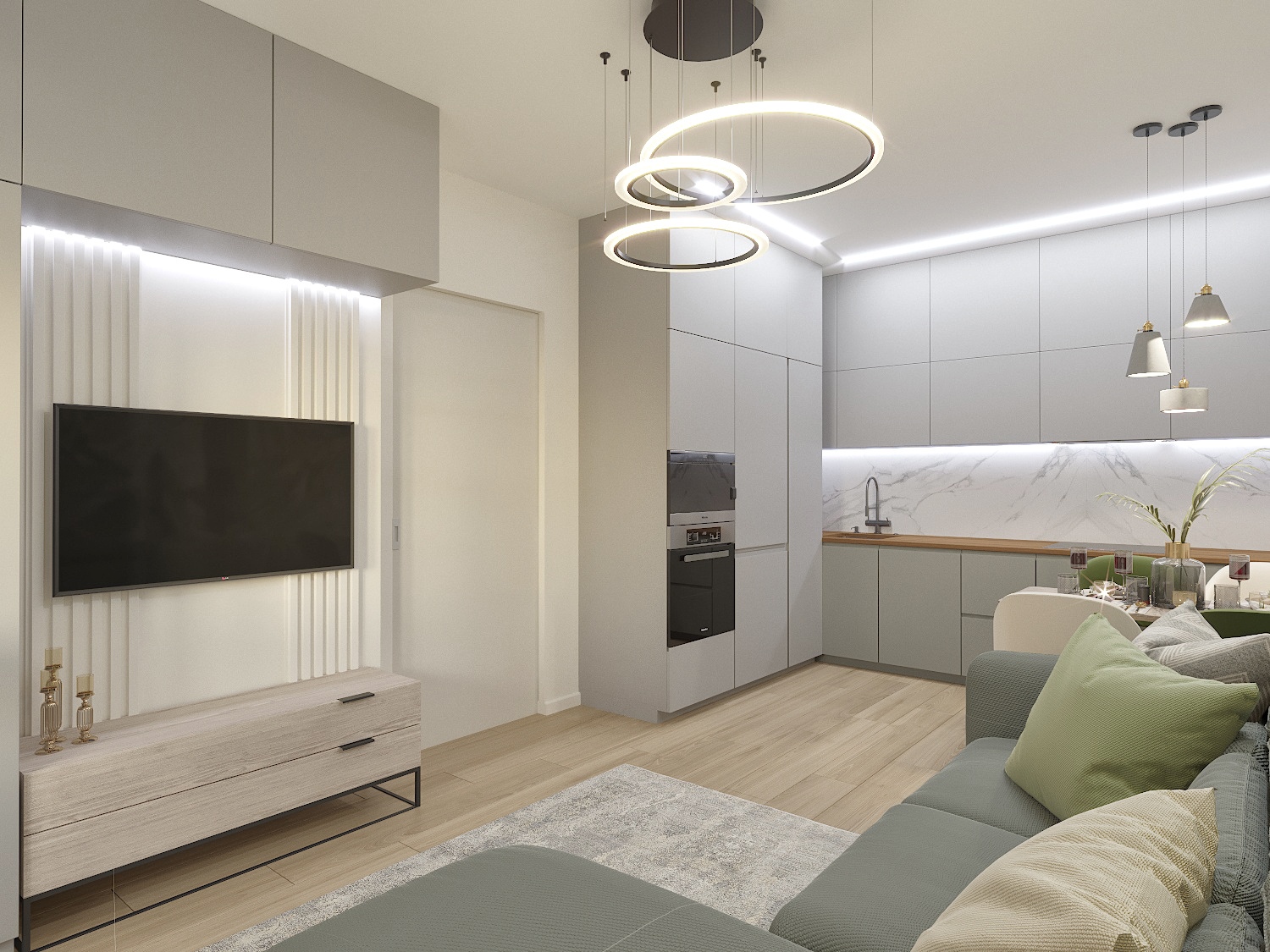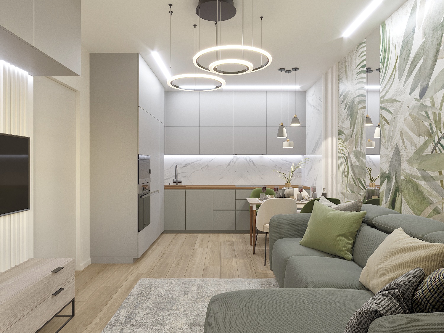 Кухня-гостиная в серо-зеленых тонах