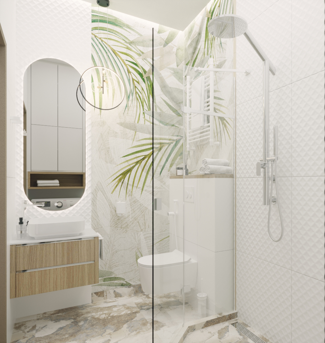 Для оформления этой ванной комнаты использовались обои из коллекции «Selva 2019». Нежные вручную прорисованные принты этой коллекции позволяют вам создать в вашем интерьере настоящие тропики. Несмотря на яркие акценты, в ней очень много воздуха, растительности и свежести. Взглянув на них, мгновенно погружаешься в приятные грёзы. В таком интерьере очень легко сохранять спокойствие и внутреннюю гармонию.