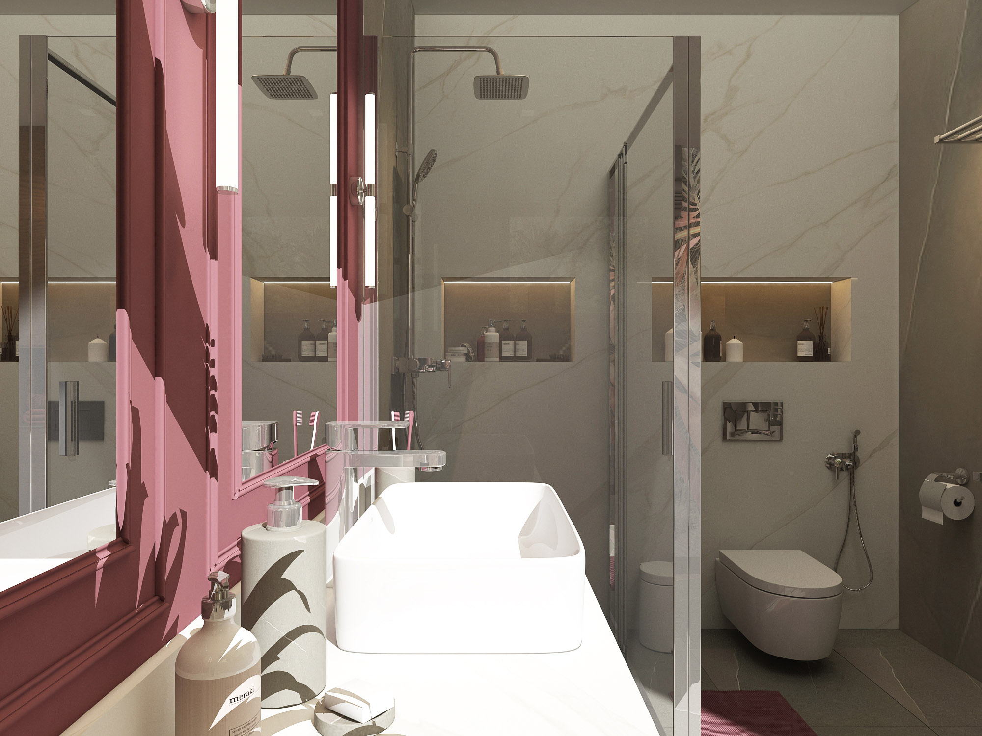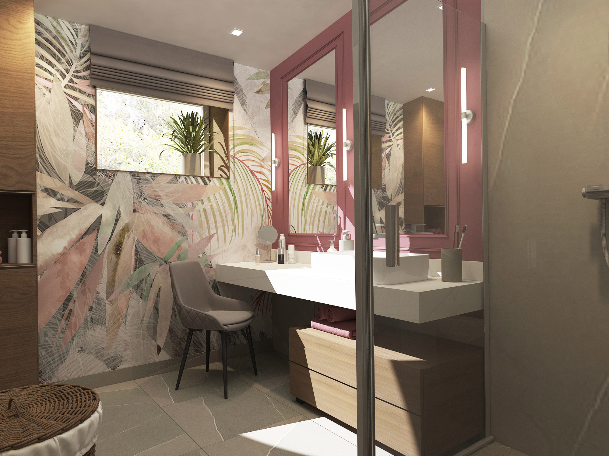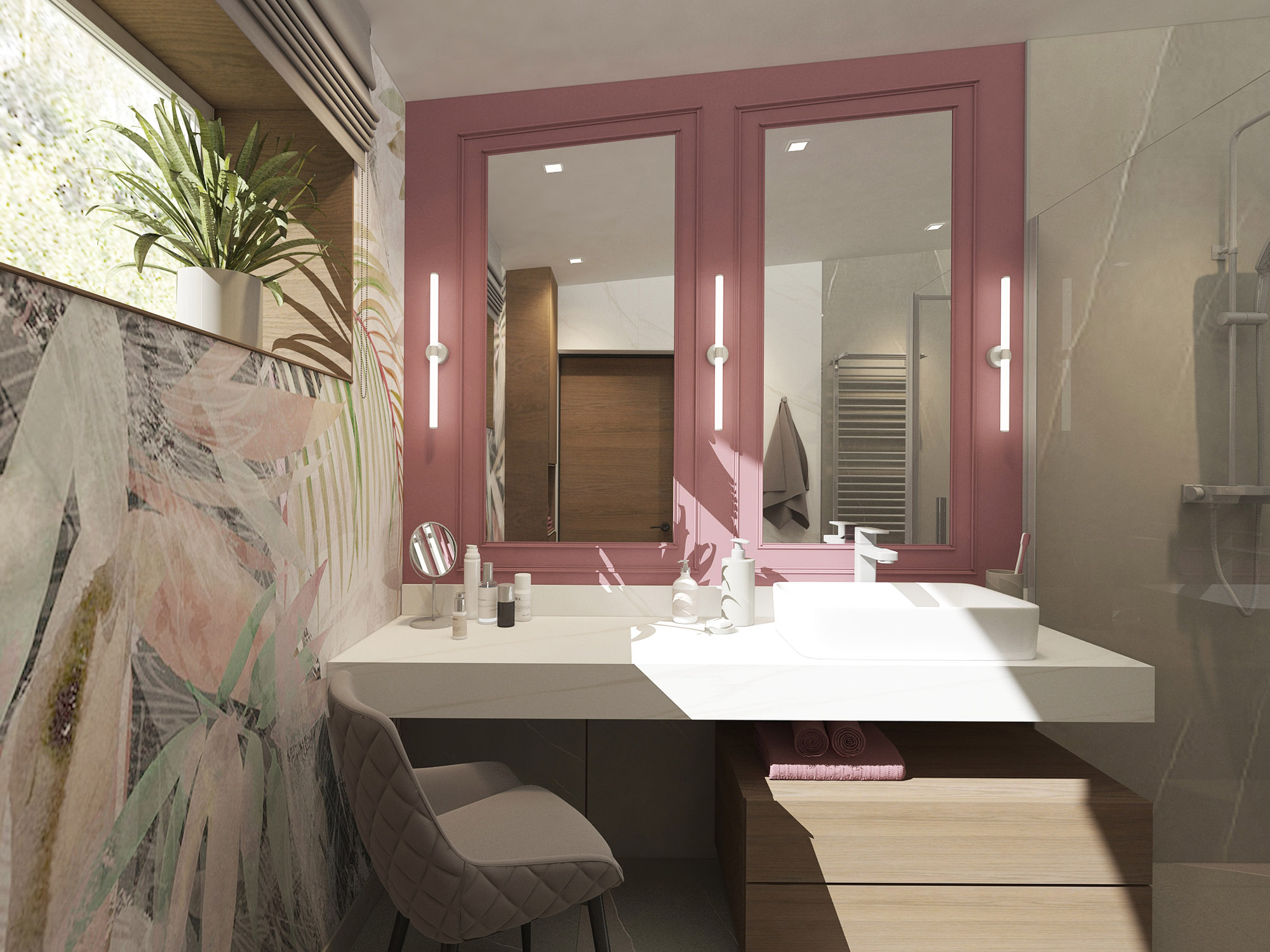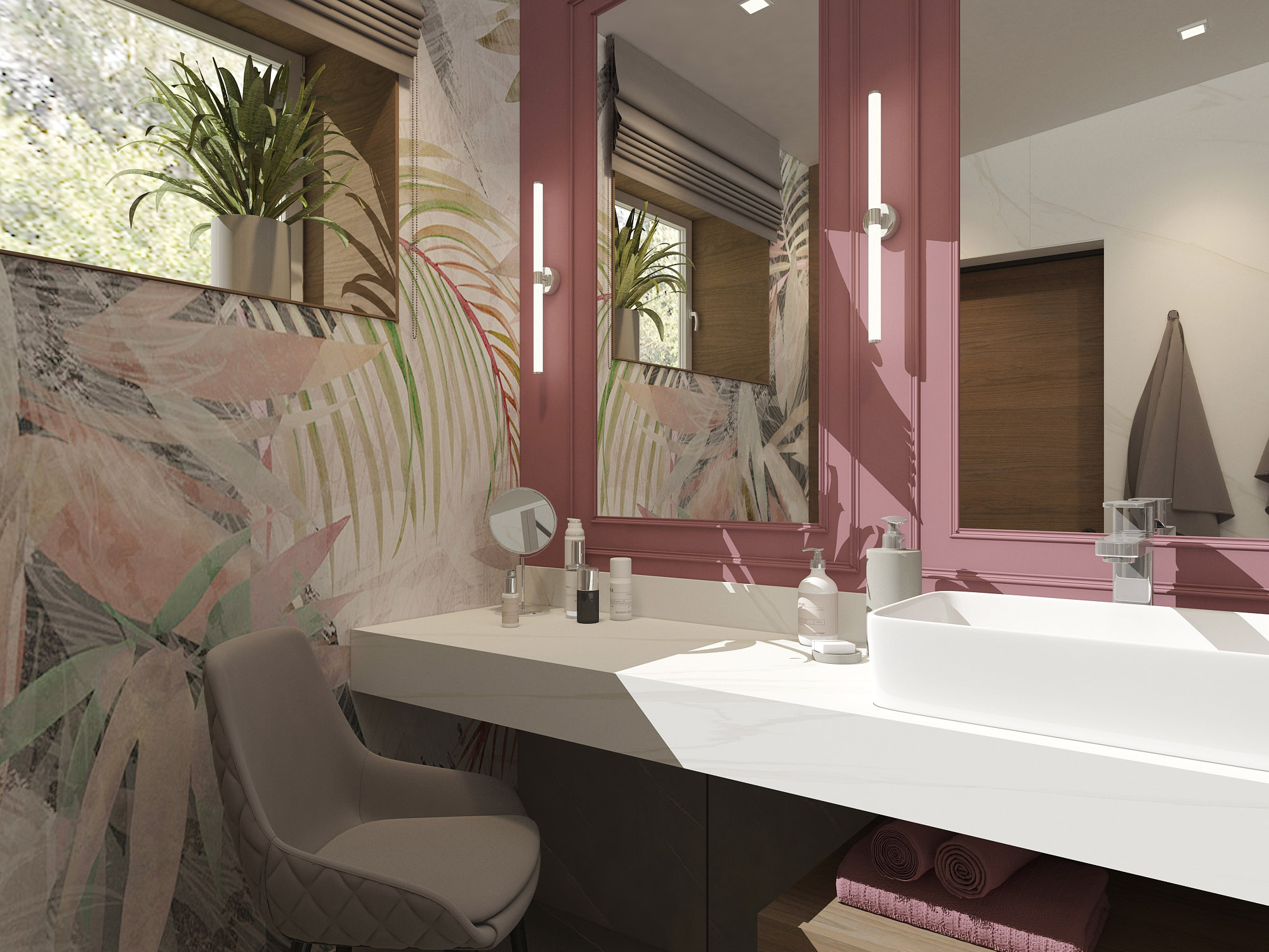 Туалетный столик — мечта многих девушек всех возрастов. Чаще всего его размещаем в спальне или гардеробной. В этом проекте дизайнеры решили организовать будуарную зону в ванной комнате. И это выглядит отличным решением!