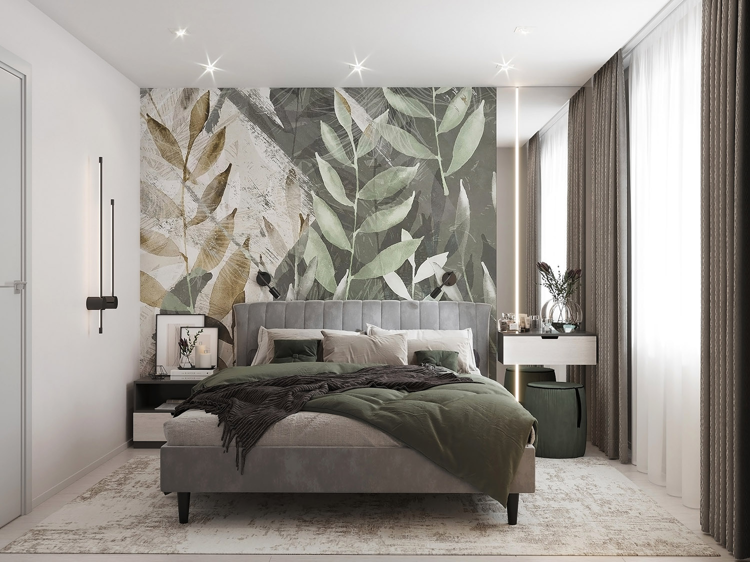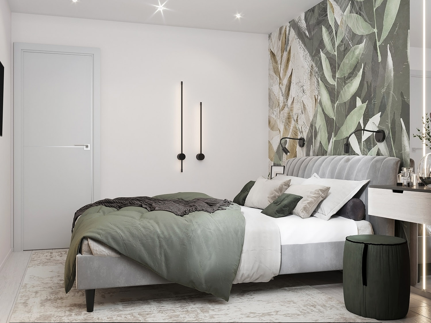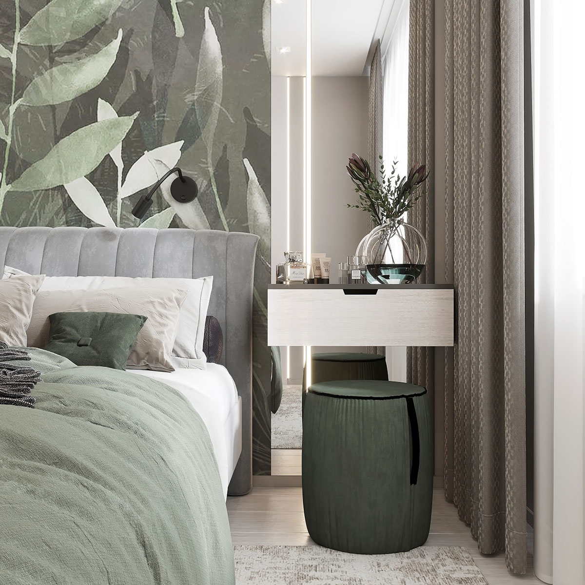 Спальня площадью 9 м² из проекта квартиры в городе Кинешма. Заказчики полностью полагались на мнение дизайнера при оформлении интерьера и поддержали идею с авторскими обоями. Очень понравились акварельные листья из коллекции Selva-2019 в приглушенной зеленой цветовой гамме. Со светлым спокойным фоном получился классный акцент.