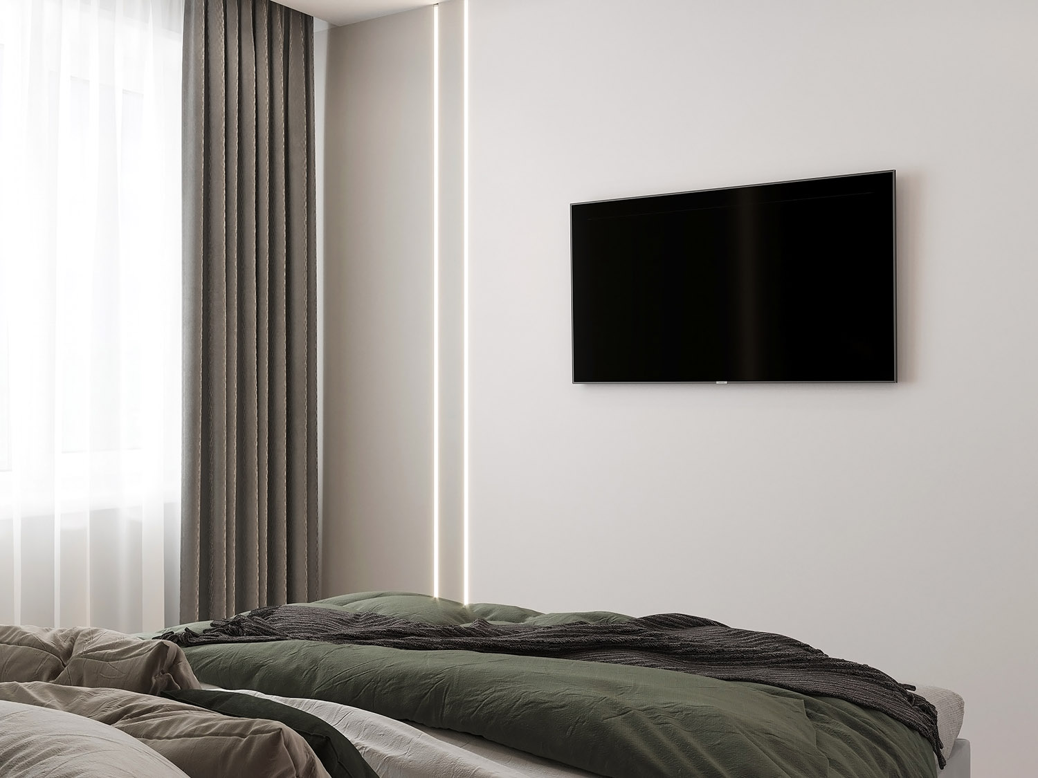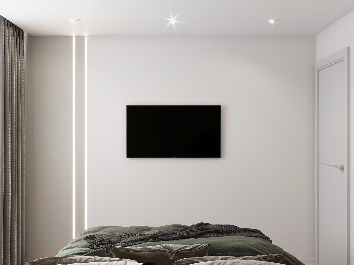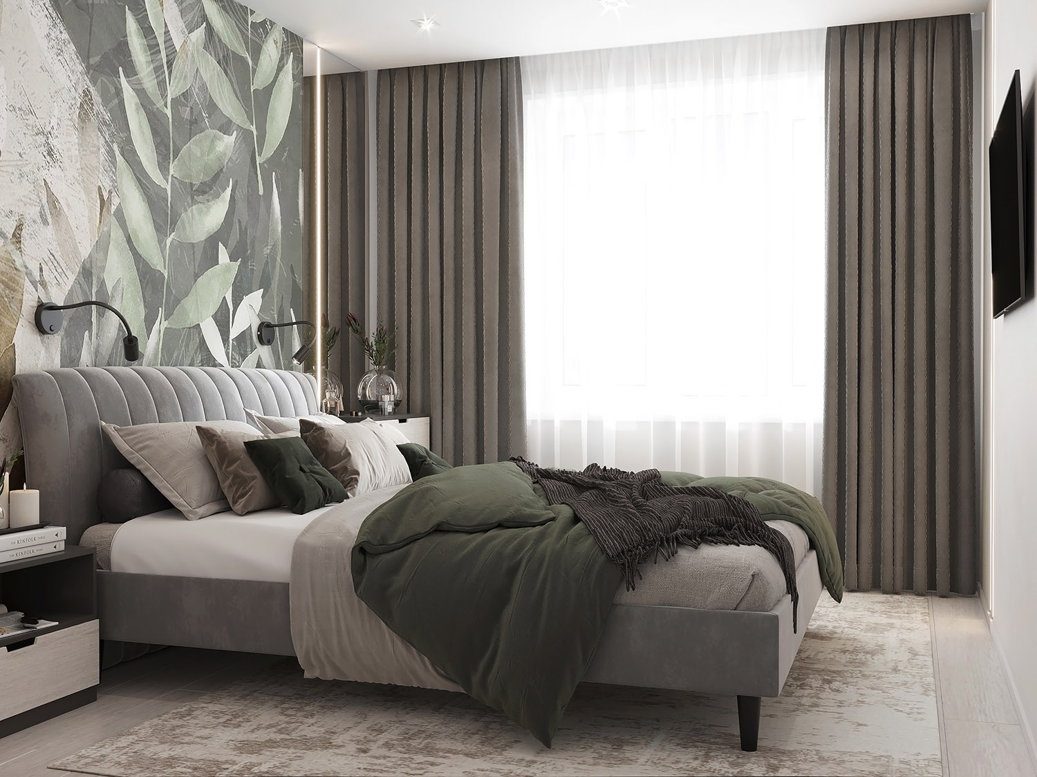 Спальня площадью 9 м² из проекта квартиры в городе Кинешма. Заказчики полностью полагались на мнение дизайнера при оформлении интерьера и поддержали идею с авторскими обоями. Очень понравились акварельные листья из коллекции Selva-2019 в приглушенной зеленой цветовой гамме. Со светлым спокойным фоном получился классный акцент.