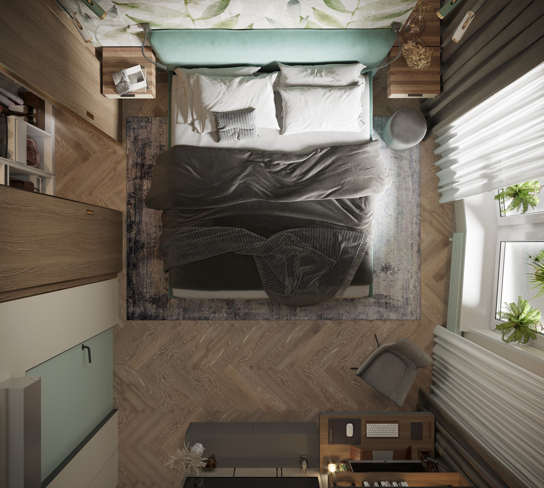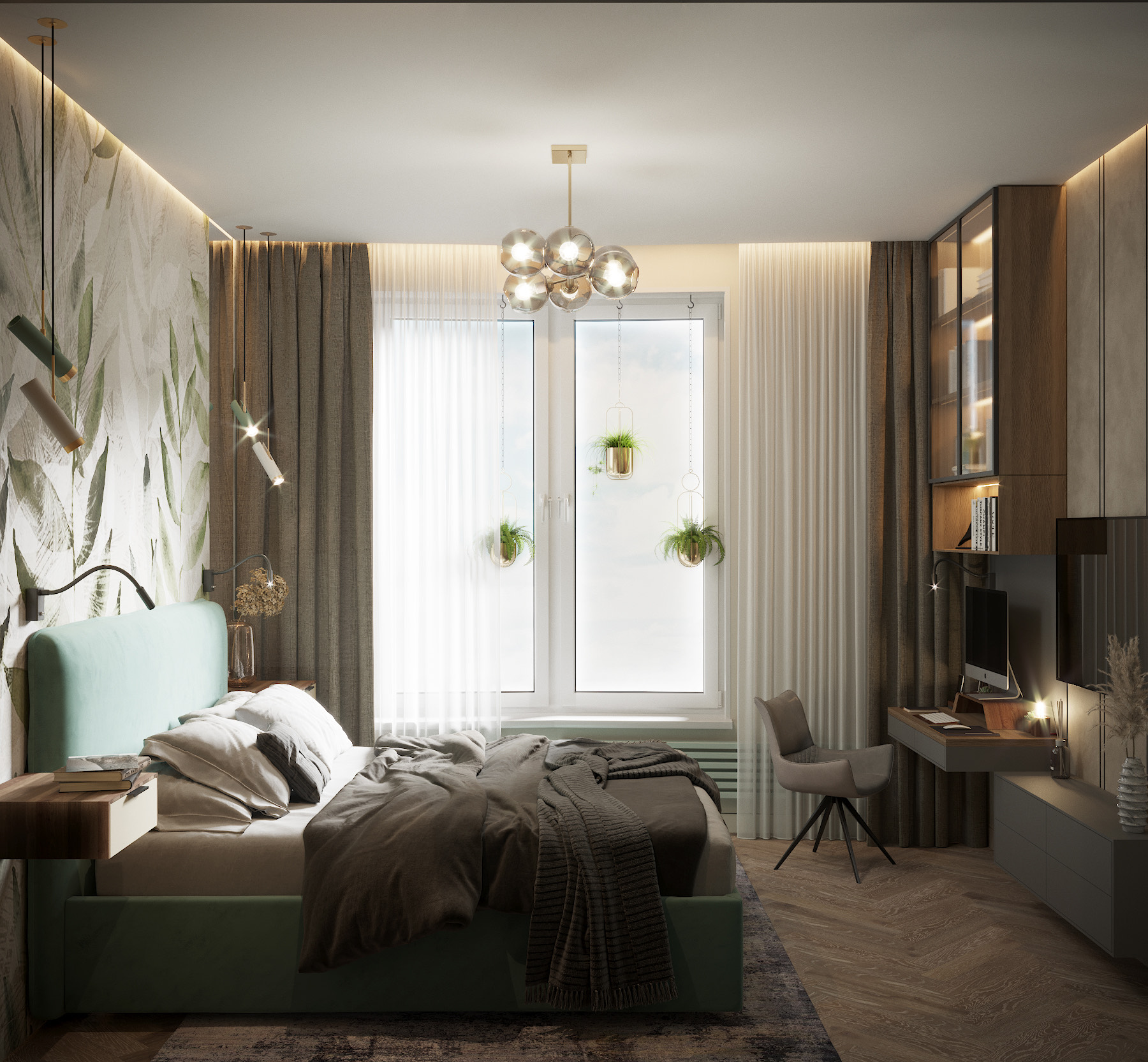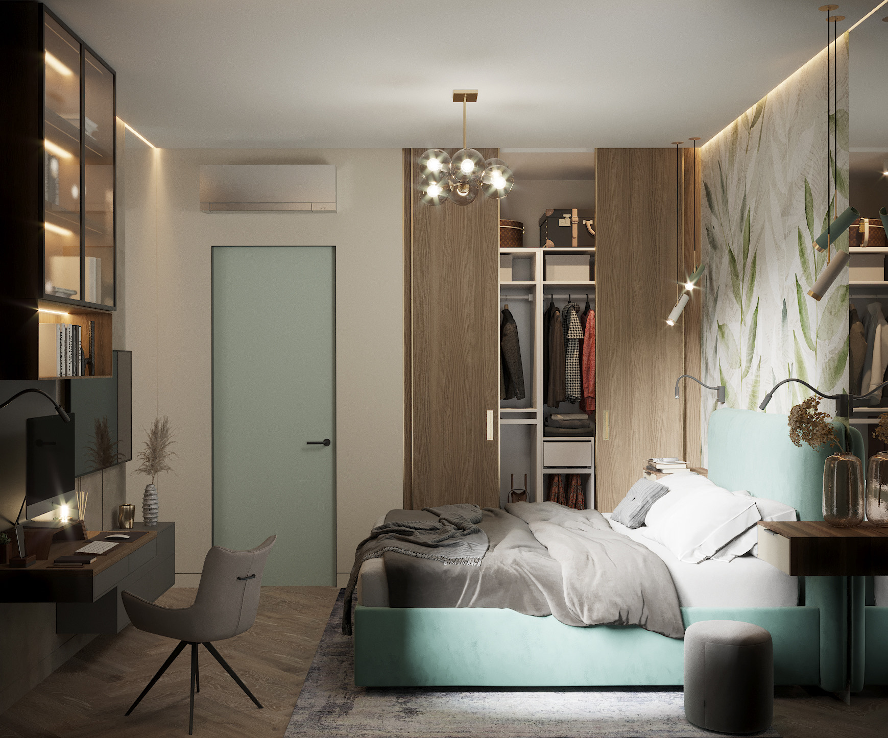 Проект разрабатывался для молодой семьи. Заказчице безумно нравится один цвет, который присутствует в каждом помещении. Но помимо визуальной части, для пары было важно сохранить практичность и функциональность всех элементов проекта. Множество сценариев освещения, рабочая зона и система хранения — все это как раз соответствует запросу.