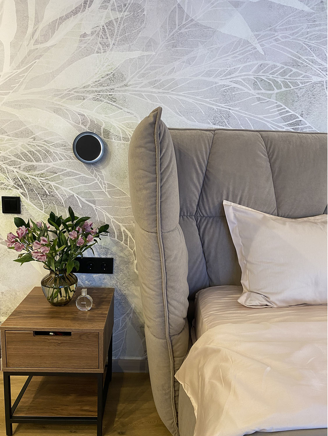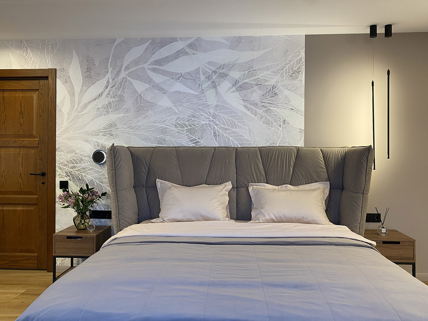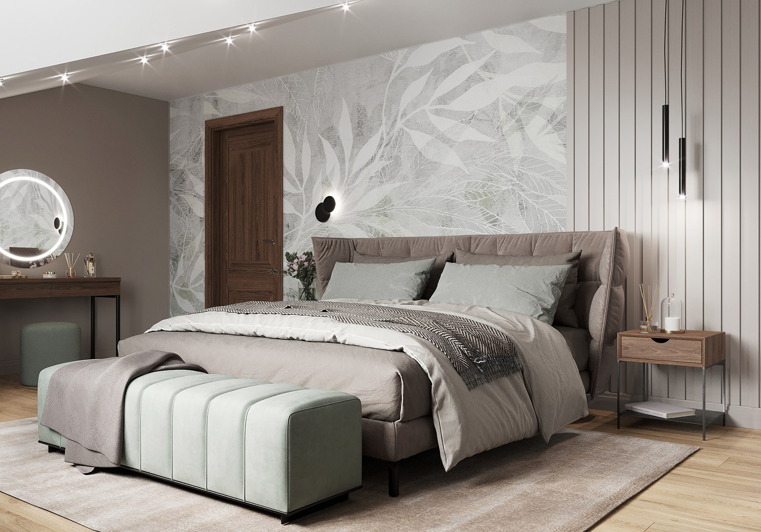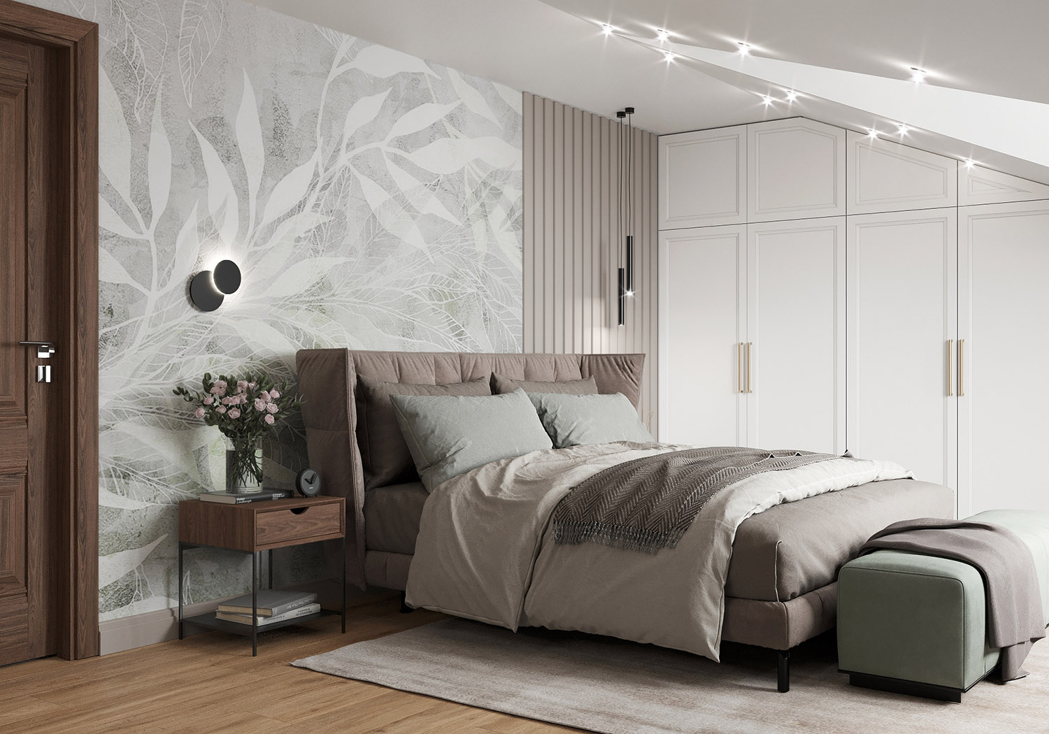 Спальня в большой мансардной квартире. Площадь комнаты - 22 м². Заказчикам хотелось нежных природных оттенков. И обои из коллекции SELVA-2019 помогли воплотить задуманное в жизнь, создав невероятную атмосферу спокойствия и гармонии.
