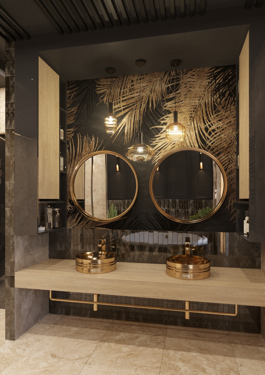 Концепция дизайна ванной комнаты для загородного дома. Обои из коллекции «Selva». Нежные вручную прорисованные принты с тропическими растениями, созданные заботливыми руками наших дизайнеров, позволяют вам создать в вашем интерьере настоящие тропики. Подарите себе вечное лето в пространстве вашего дома!