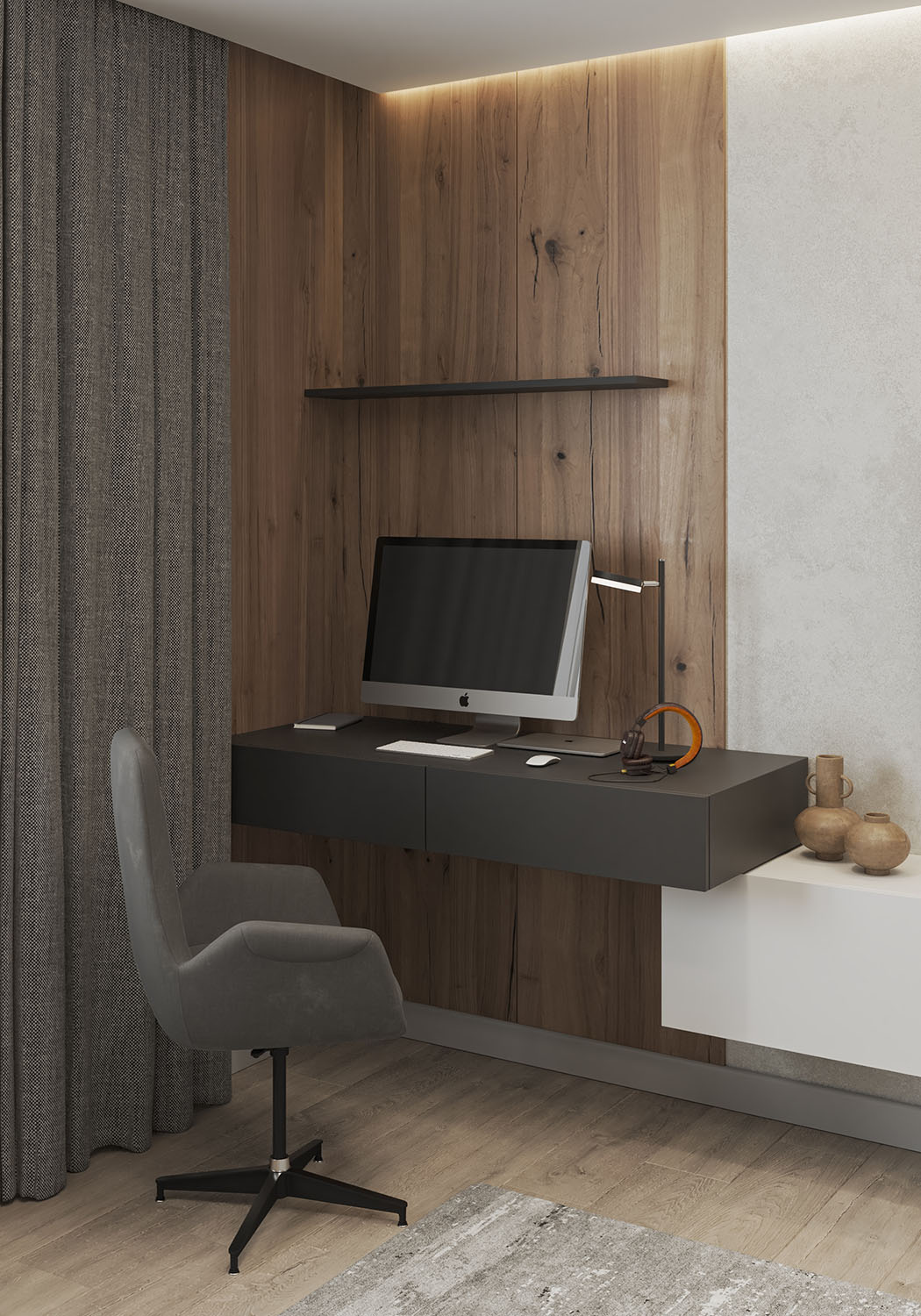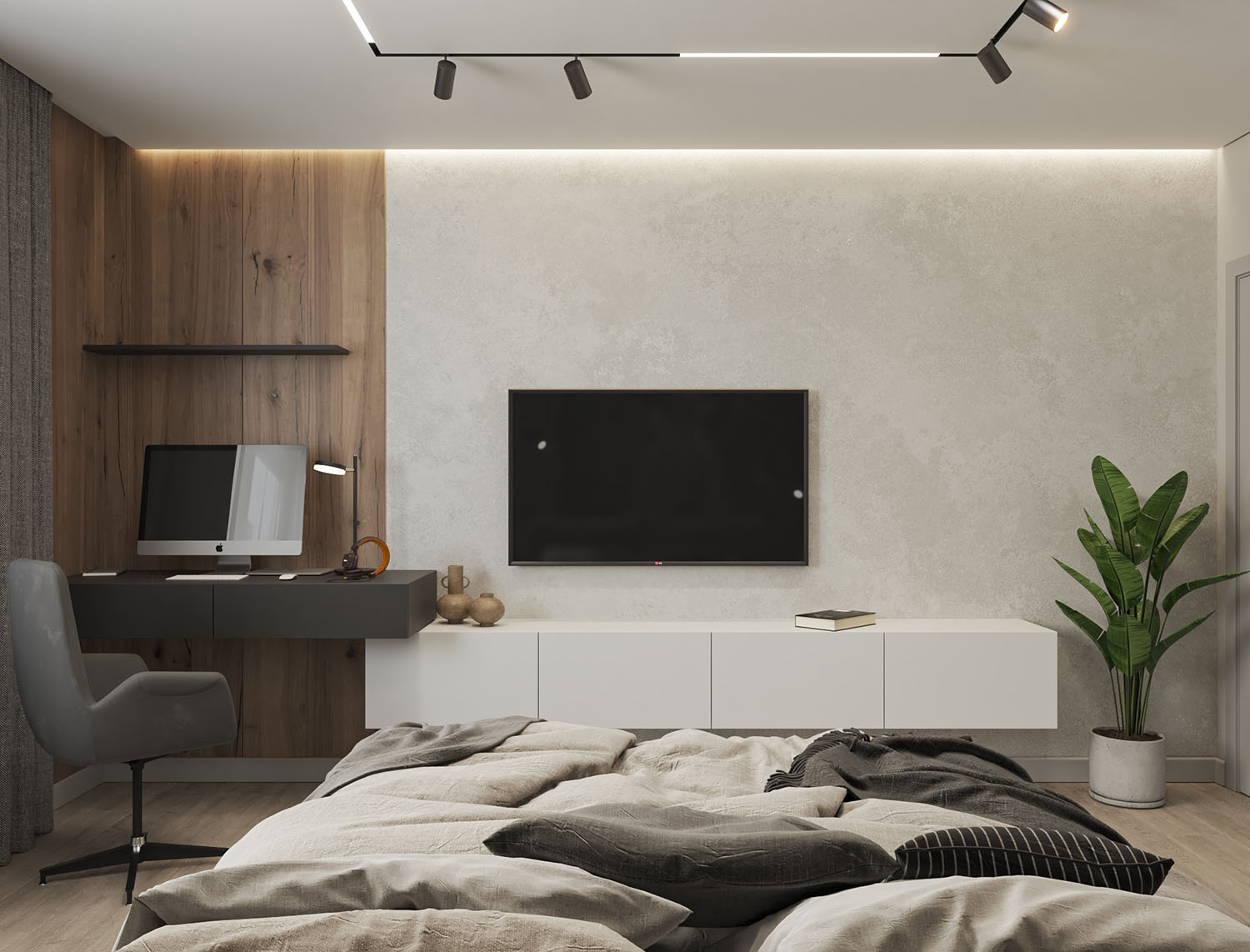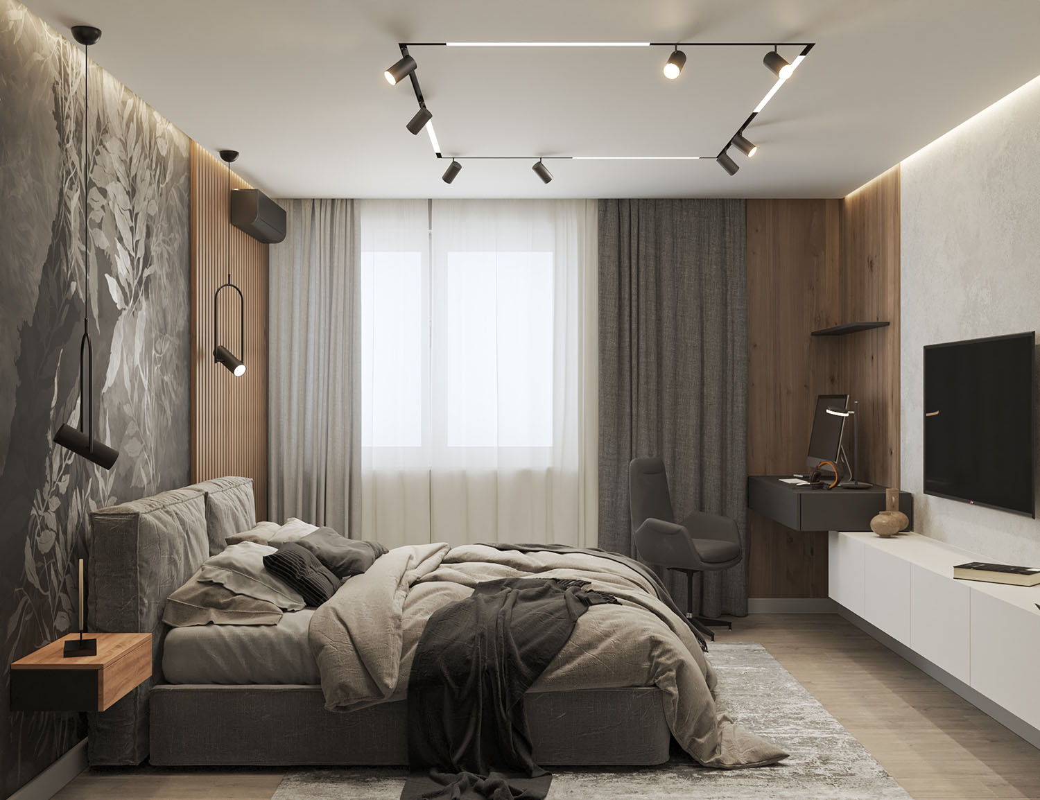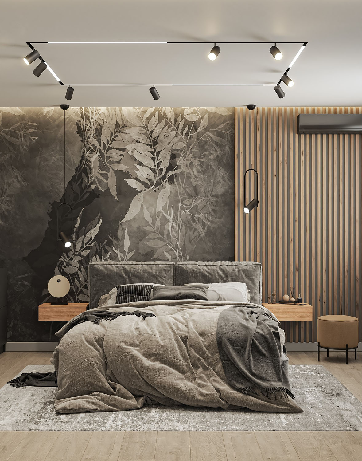 Этот проект создавался для молодого человека двадцати трех лет, который планирует заехать в новую квартиру вместе с девушкой. Дизайн комнаты устроен так, чтобы в случае прибавления в семействе можно было легко поменять интерьер с помощью замены темных акцентных обоев с листьями на более светлые.