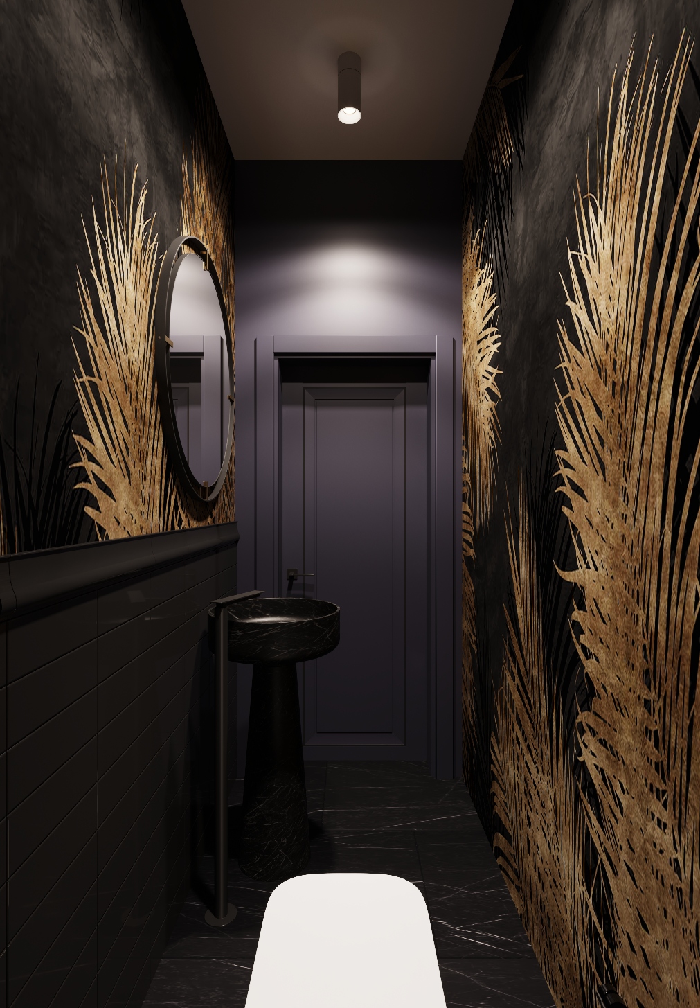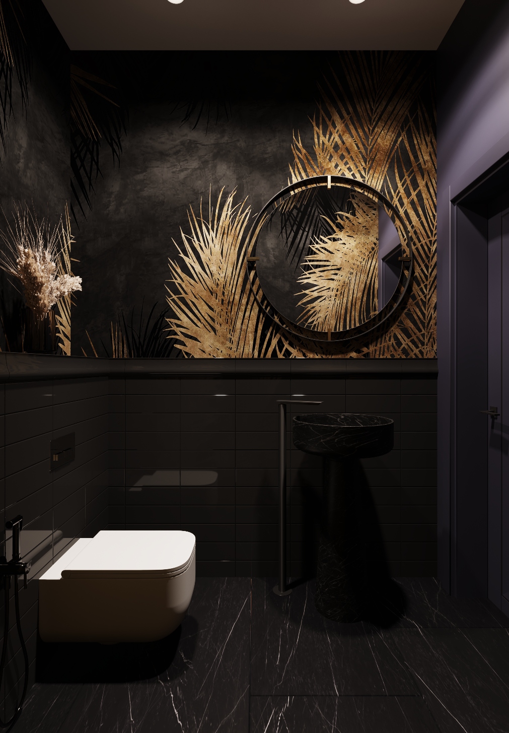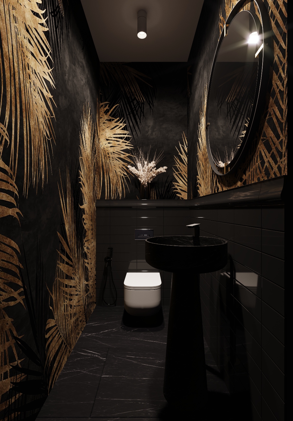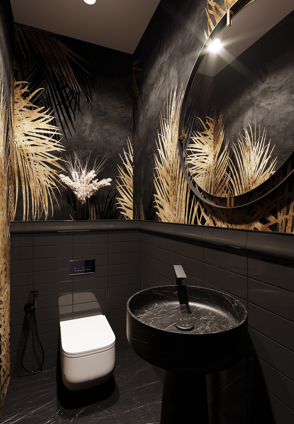 Дизайн санузла в ресторане, г. Краснодар. Обои из коллекции «Selva» идеально вписались в проект по стилю и цветовому решению, добавив тропической тематики этому небольшому помещению.
