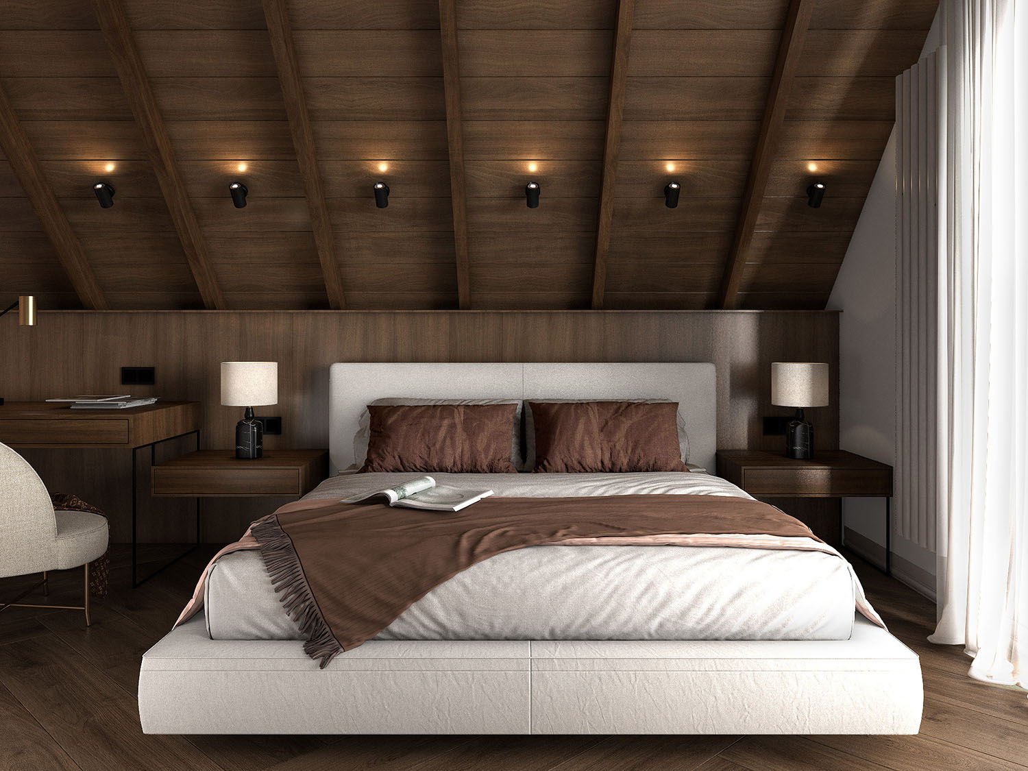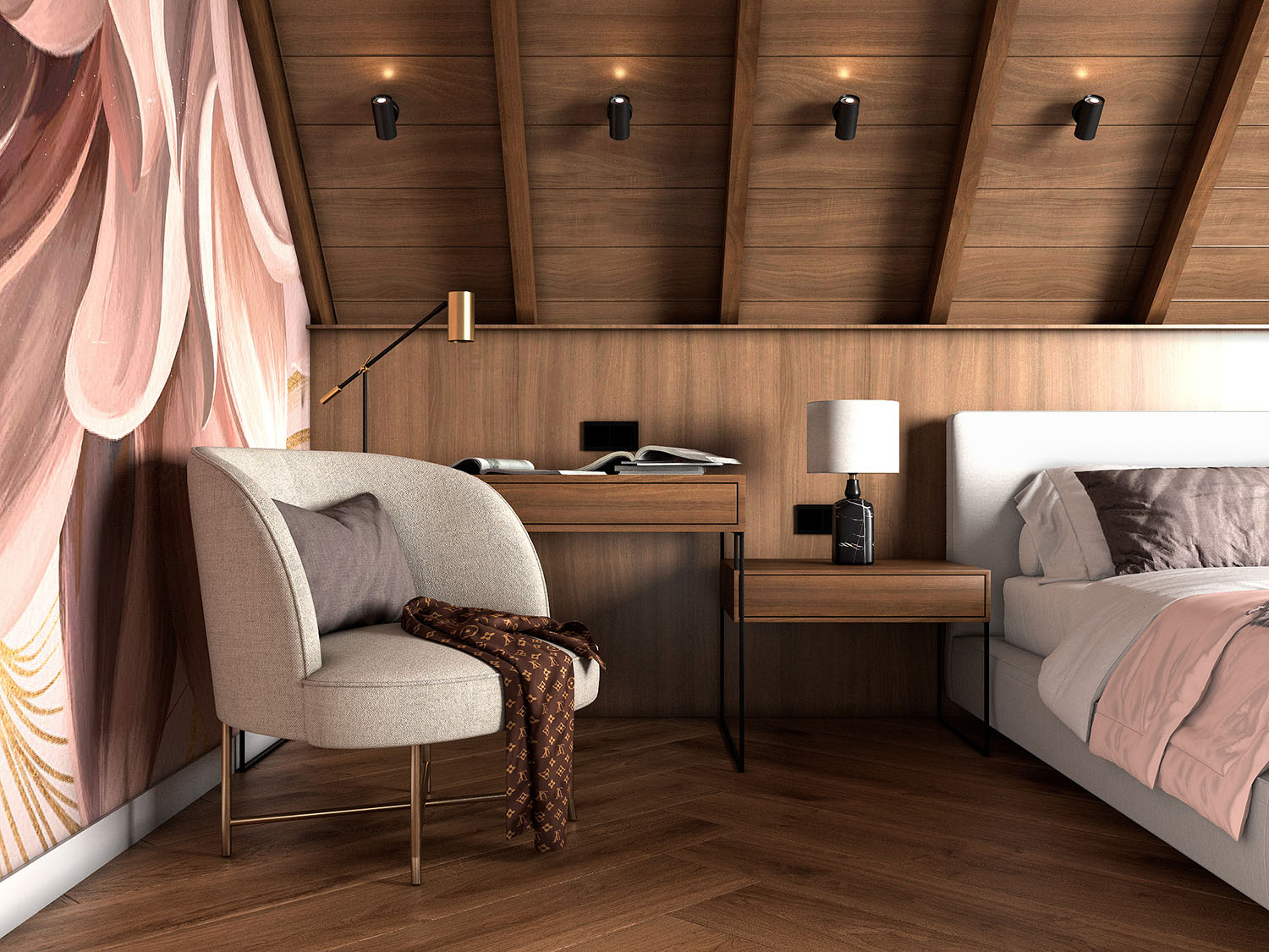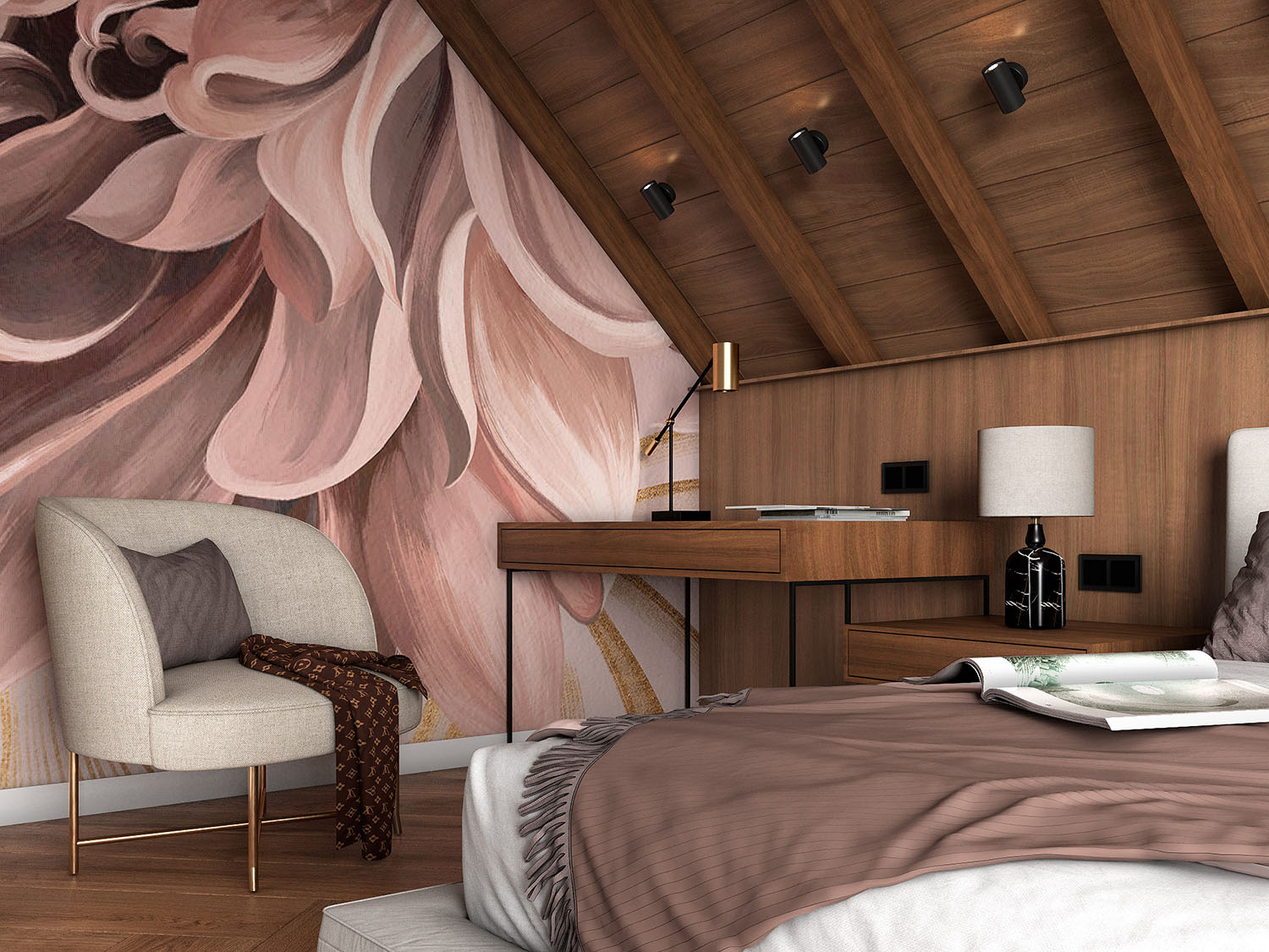 Дизайн спальни на мансардном этаже. Обои из коллекции SOLO 22. Крупные бутоны в пастельных тонах уже распустились и готовы украсить интерьер любой комнаты. Это не просто обои, а целая картина из широких мазков кисти и нежных красок. «SOLO22» — это акцент с душой и эстетикой.