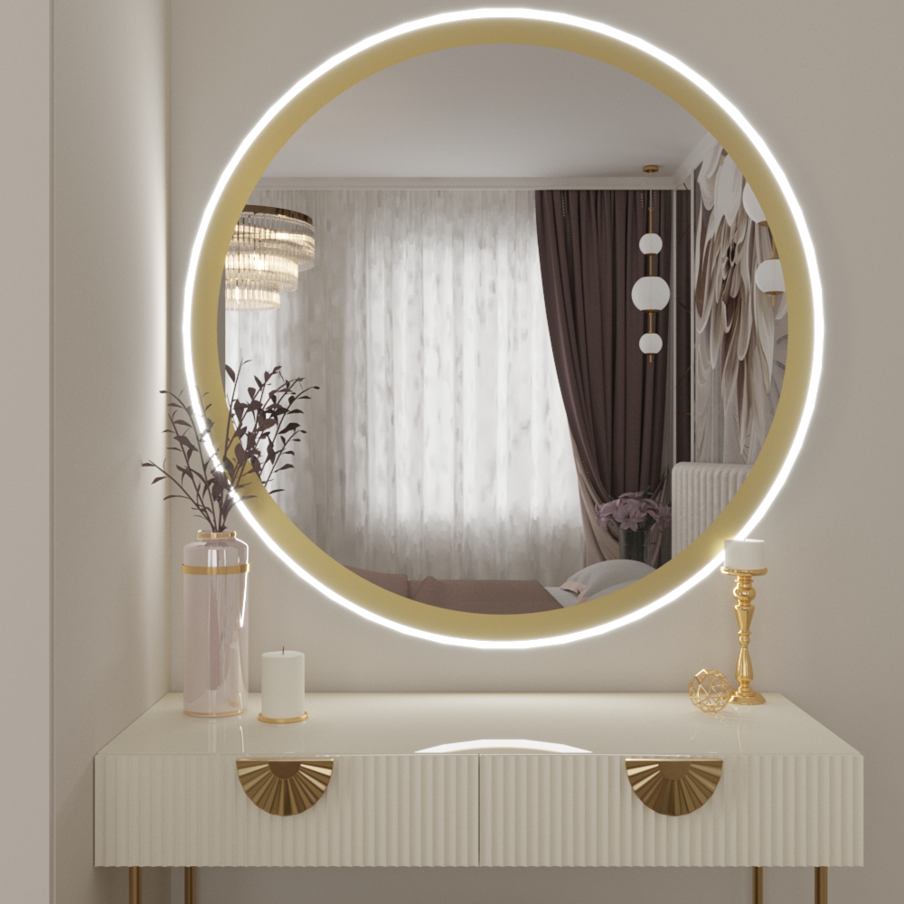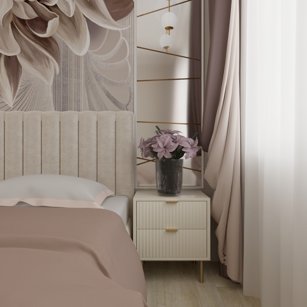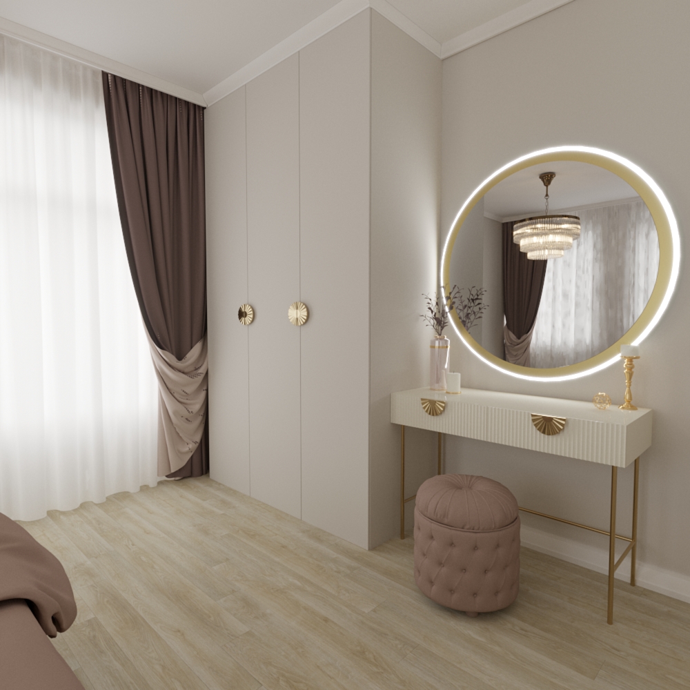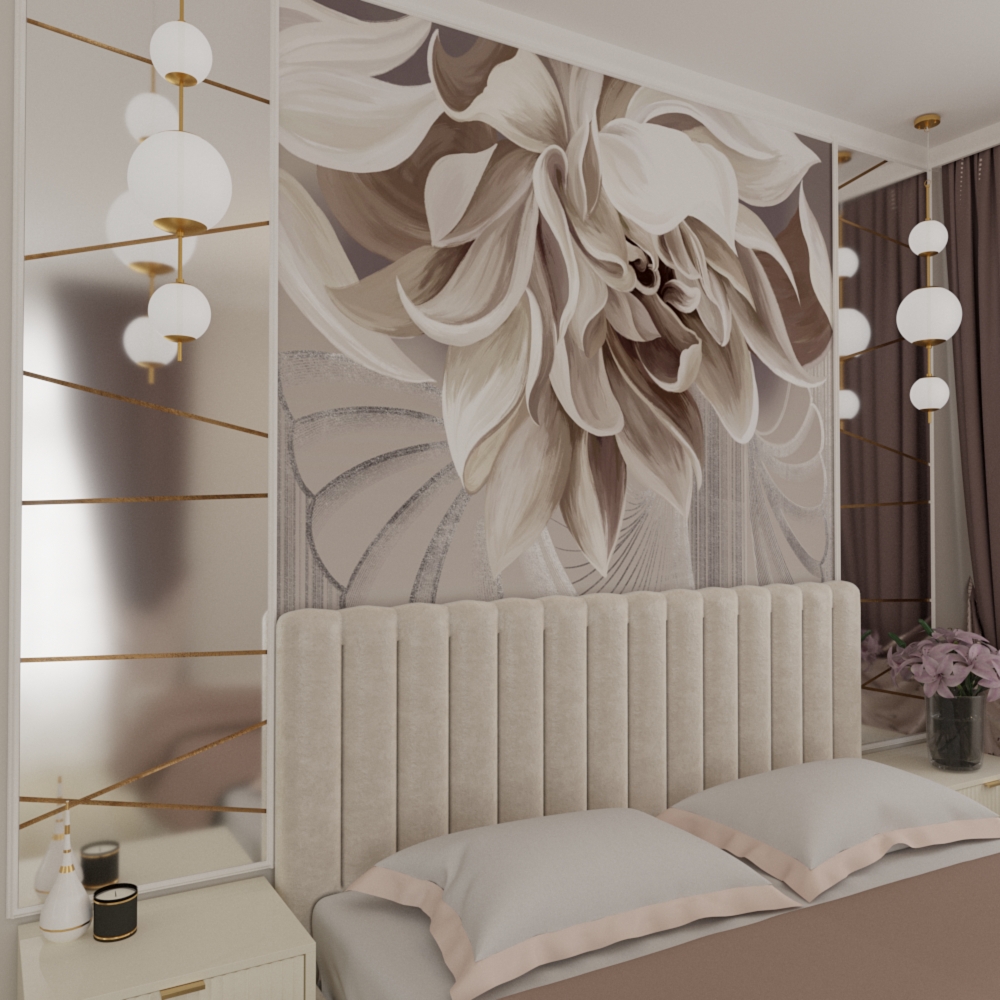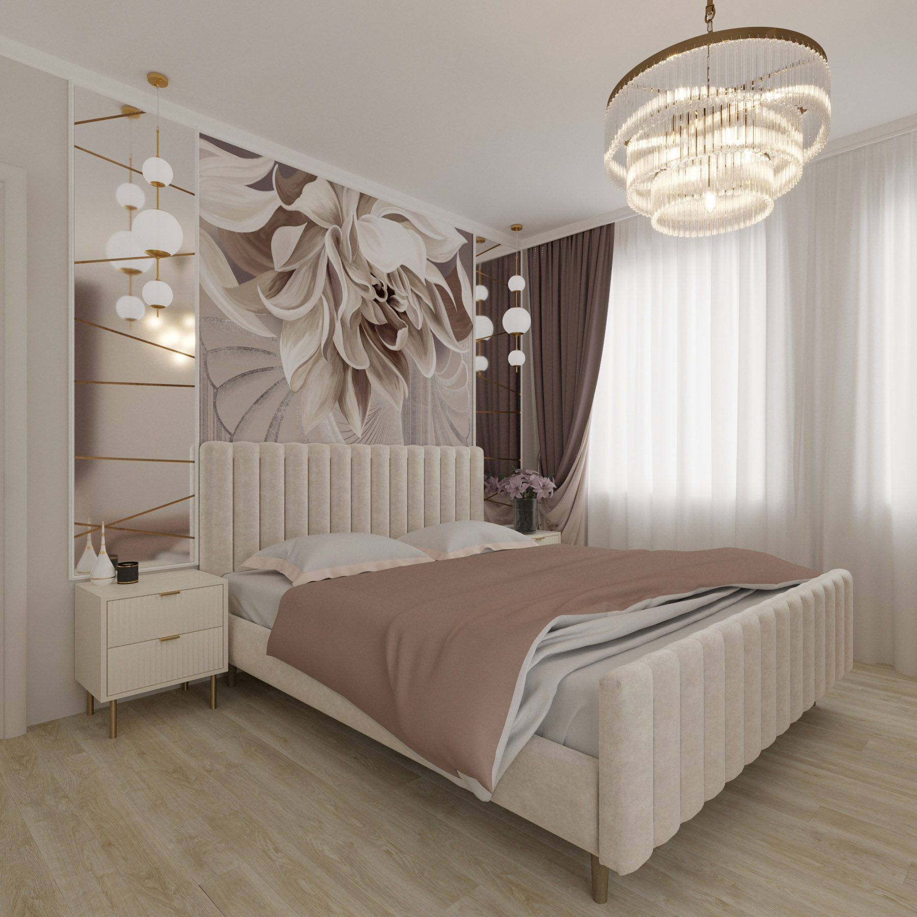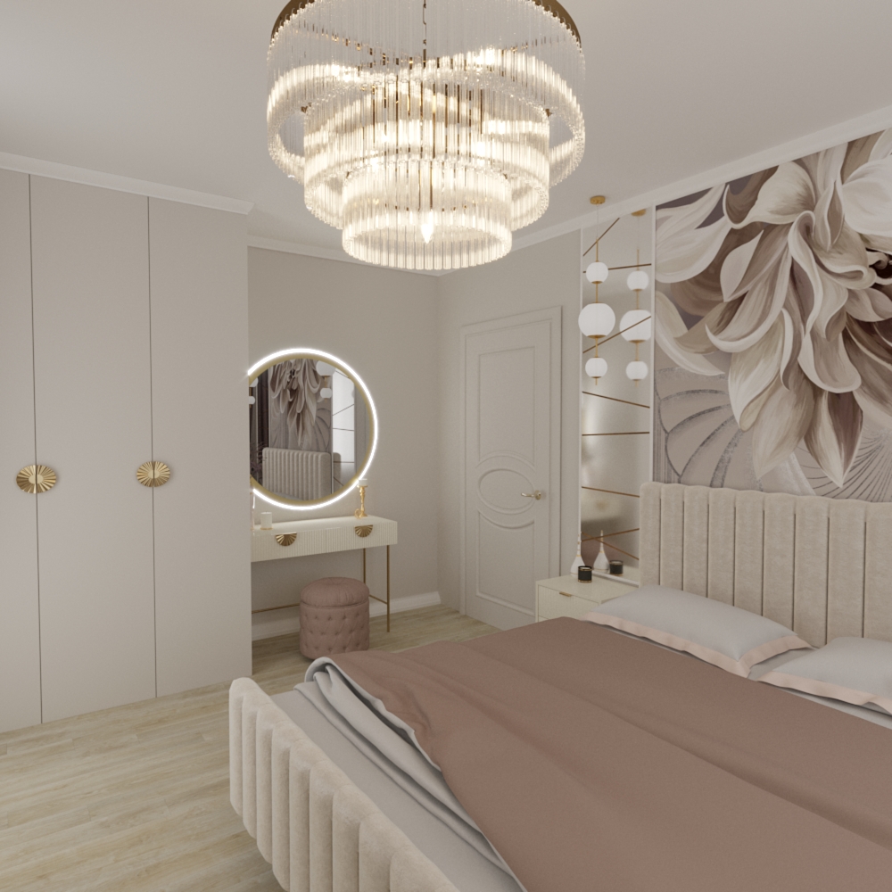 Красивая спальня — мечта каждой женщины, ведь это место тишины, спокойствия, романтики. Словом, здесь присутствует приятная и необходимая камерность. Именно такой получилась эта спальня. Она очень декоративна и изящна, стены украшают молдинги, фреска, дизайнерские зеркала с патиной. Особую роль в интерьере играет свет — шикарная хрустальная люстра и подвесы шарики. Фасады мебели и спинка кровати рельефные, а ручки гардероба и туалетного столика — как целое произведение искусства.