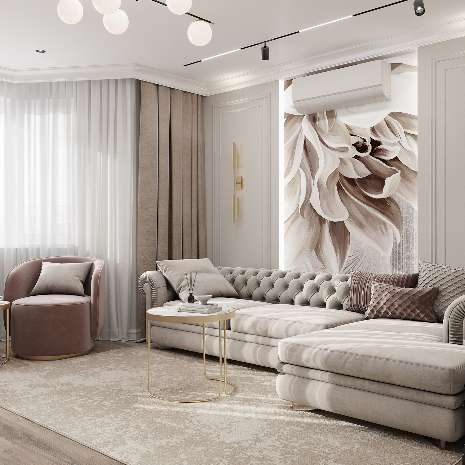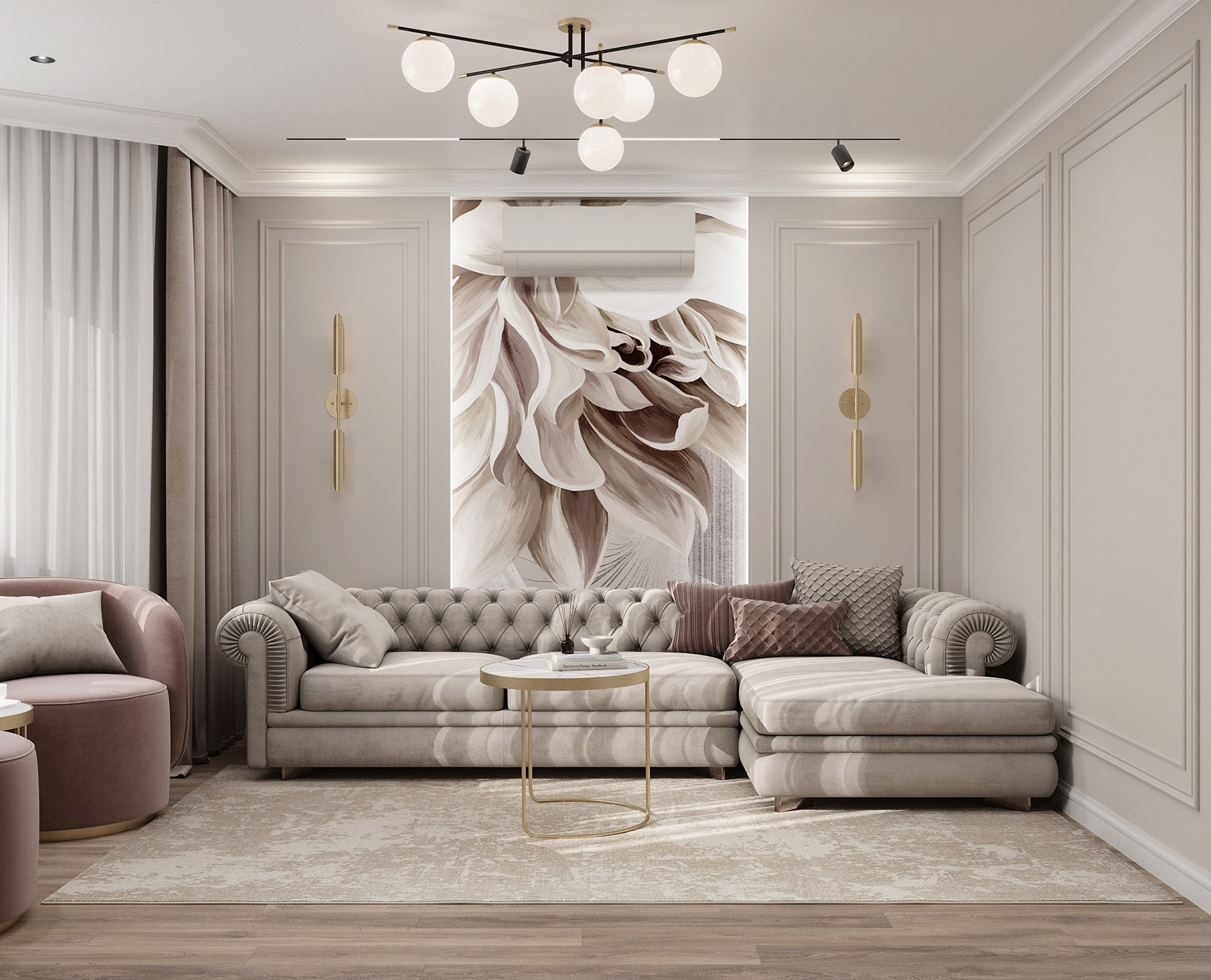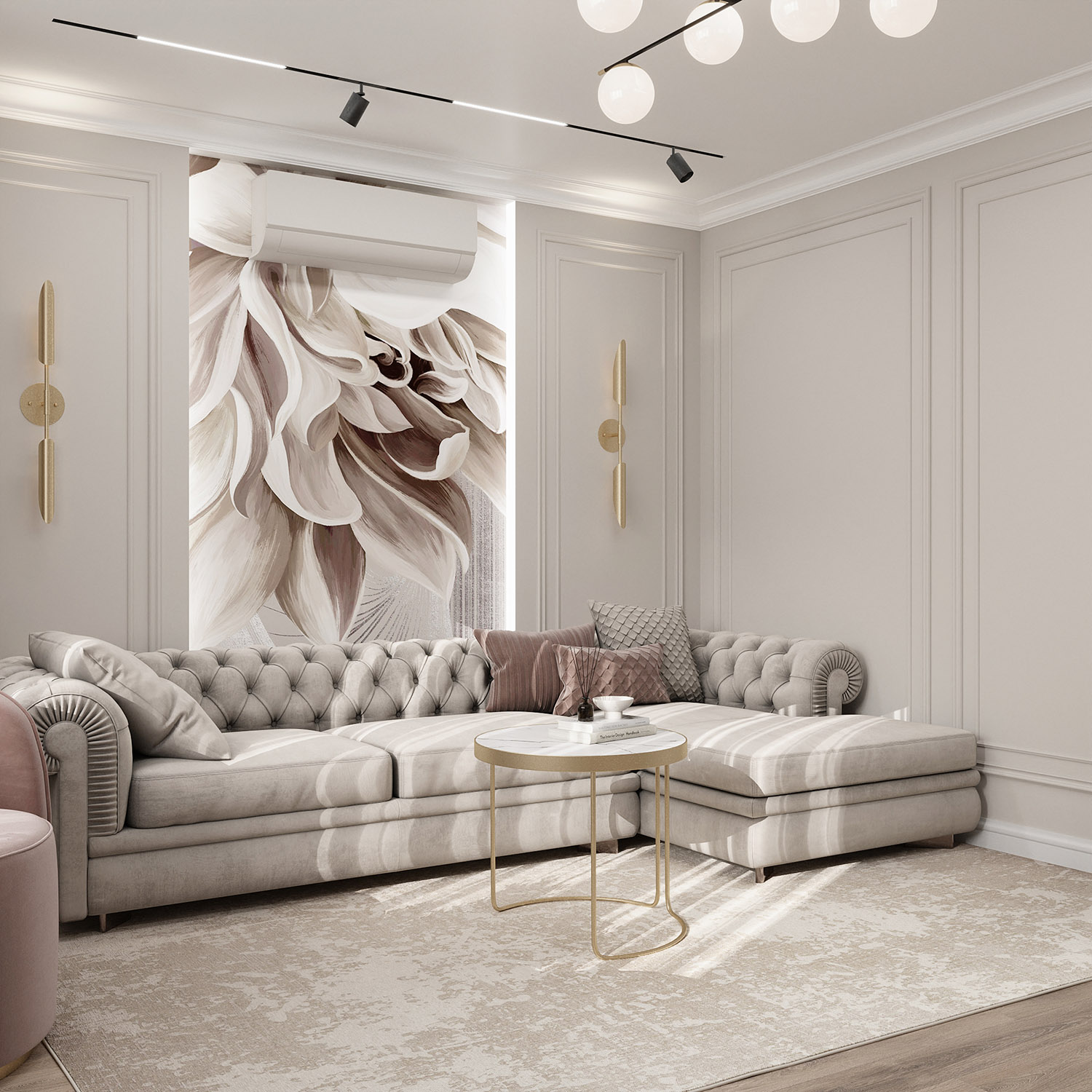 Акцентом в дизайне этой гостиной стало панно из коллекции Solo 22. Крупные бутоны в пастельных тонах уже распустились и готовы украсить интерьер любой комнаты. Это не просто обои, а целая картина из широких мазков кисти и нежных красок. «SOLO22» - это акцент с душой и эстетикой!