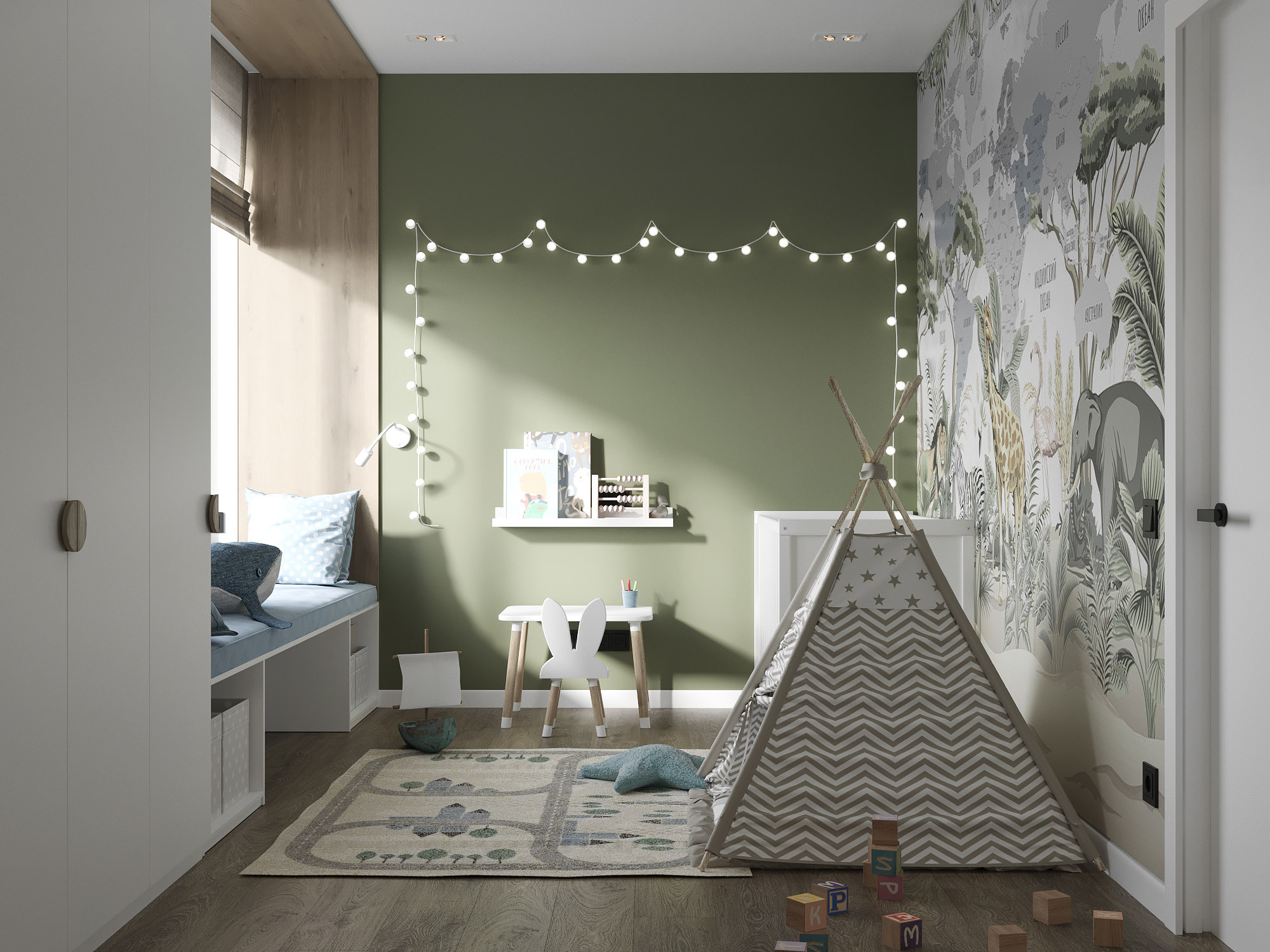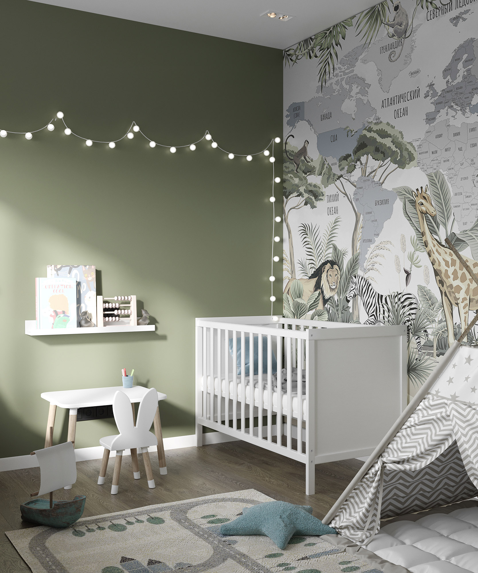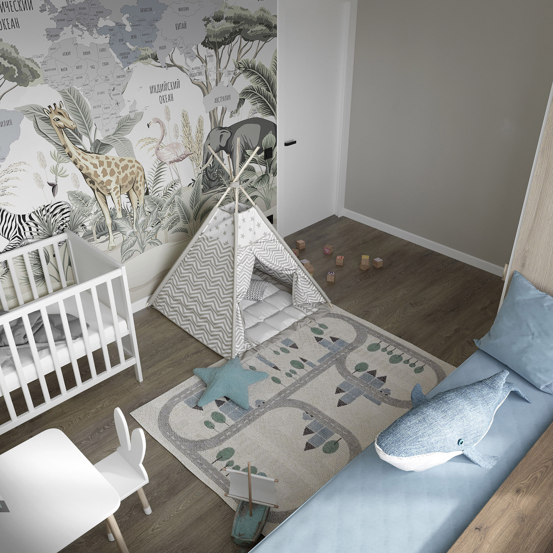 Проект детской комнаты площадью 11 м² для маленького мальчика. Обои из коллекции «Travel Kids». Карта мира в коллекции TRAVEL KIDS — это не просто точное отображение стран и городов, но и яркое тематическое оформление! Стиль можно подобрать под интересы и вкусы юного первооткрывателя: рисованные принты с динозаврами, которые показывают Землю в доисторический период, или стилизованные изображения достопримечательностей — Эйфелевой и Пизанской башен, Биг Бена, Статуи Свободы и других.