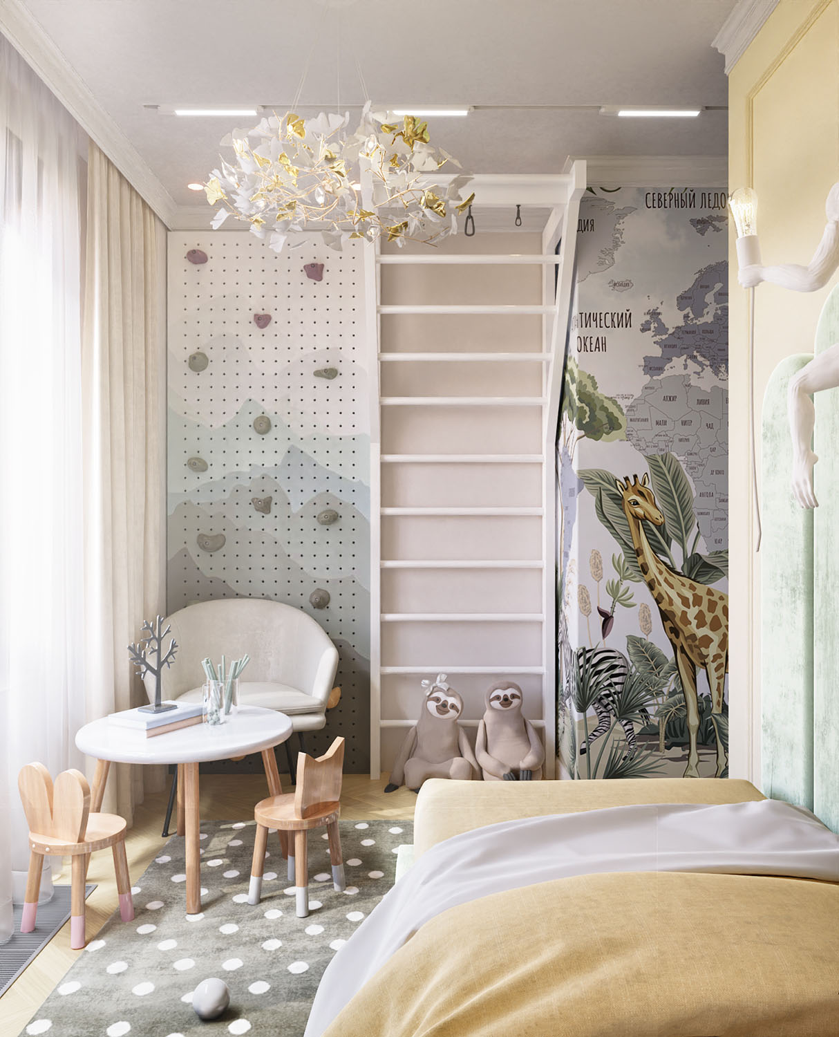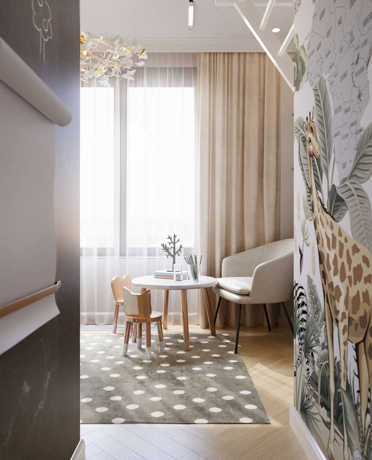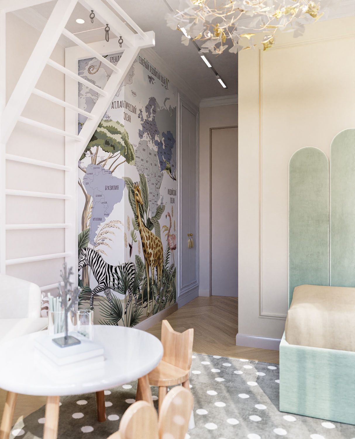 Детская комната в ЖК «JAZZ kvartal», для оформления которой были выбраны обои их коллекции Travel Kids. Малыш ещё только в проекте, и родители не знают, кто это будет, поэтому запрос был на универсальную комнату, которая подойдет как мальчику, так и девочке. А чудесные обои Travel Kids расскажут ребёнку о различных животных и о странах мира, что очень познавательно и увлекательно!