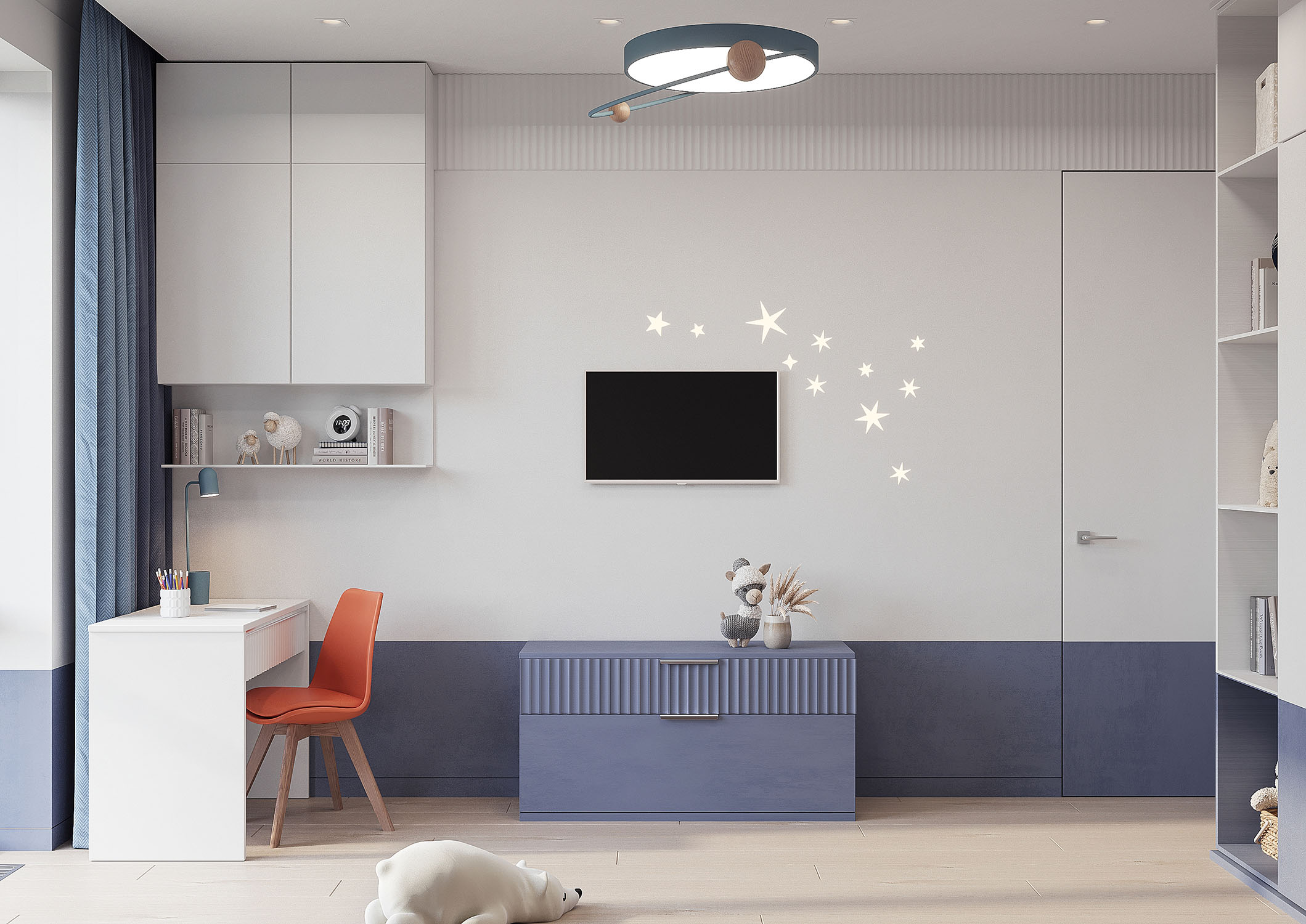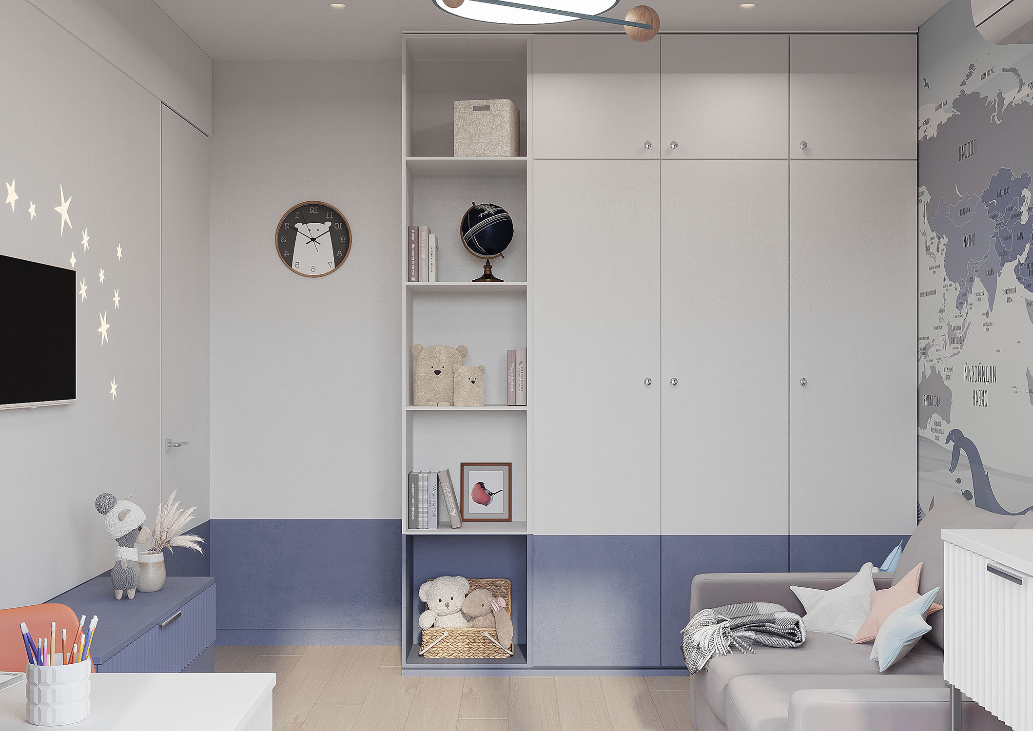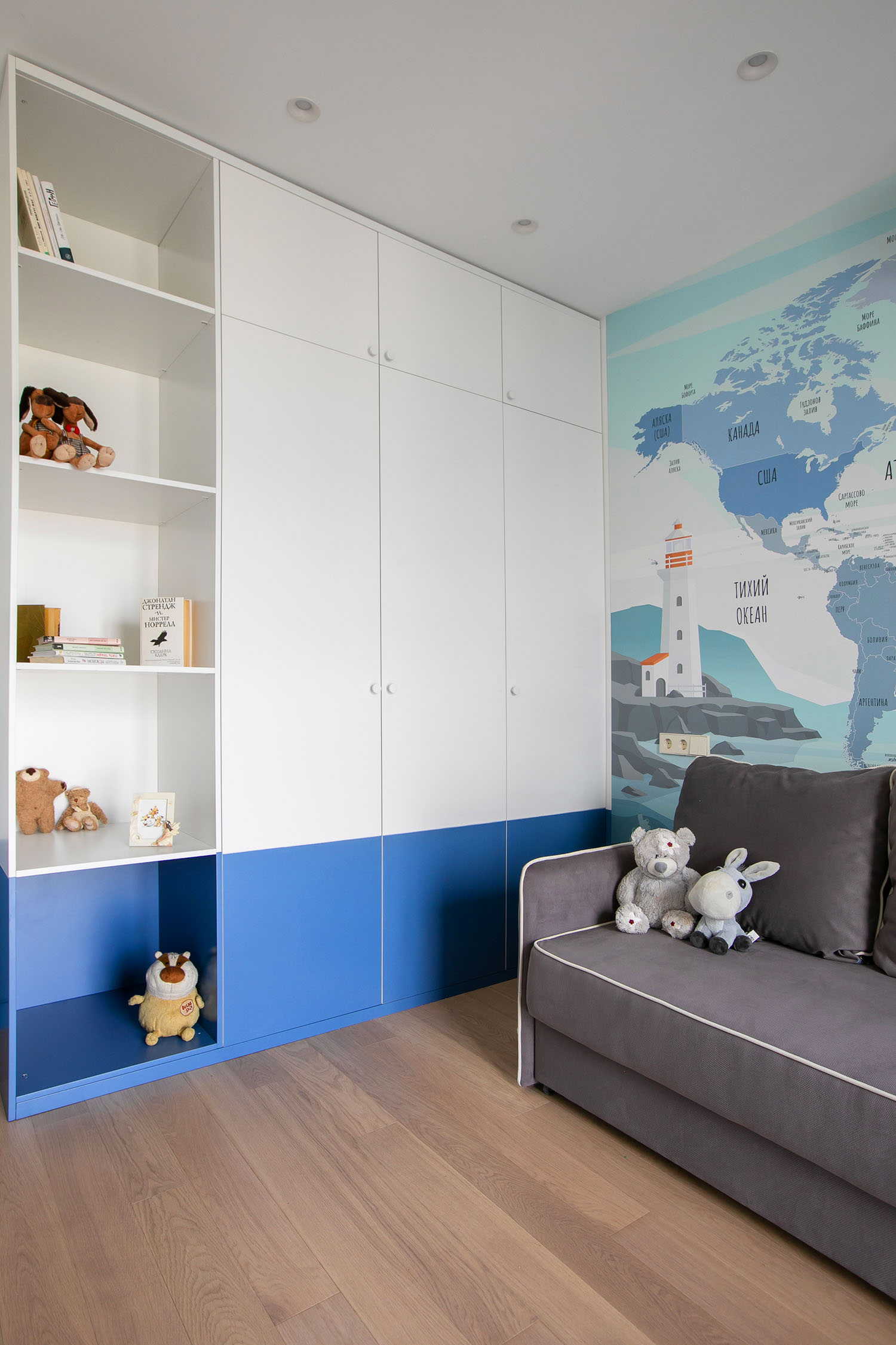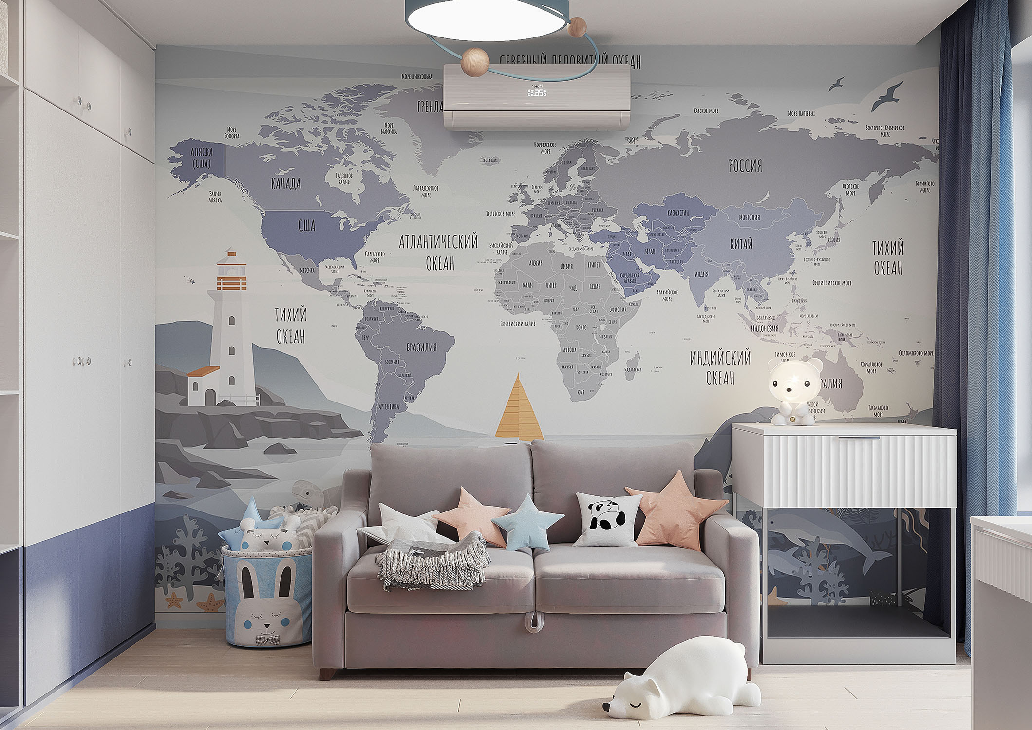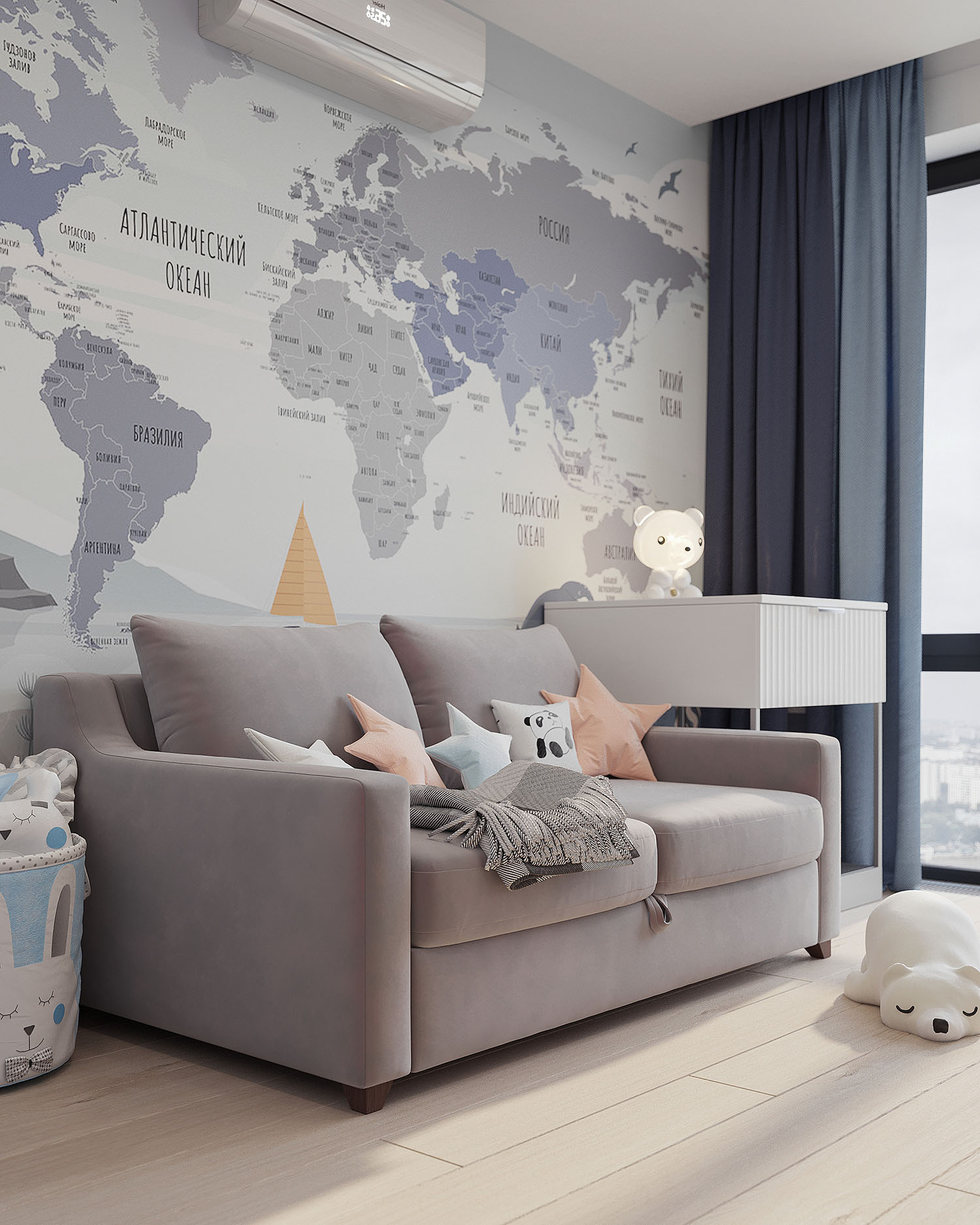 Проект и реализация детской комнаты для мальчика, г. Москва, ЖК Дискавери Парк. Обои из коллекции Travel Kids. Карта мира – довольно частый атрибут в комнате ребенка, ведь благодаря ей он может учиться легко и играючи. А карта мира в коллекции TRAVEL KIDS – это не просто точное отображение стран и городов, но и яркое тематическое оформление! Она показывает не только внешний мир на карте, но и внутренний мир маленького хозяина. А с такими обоями по географии точно сулит пятерка!