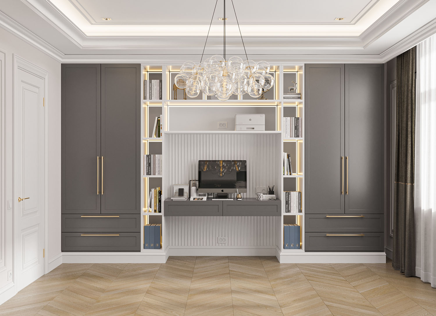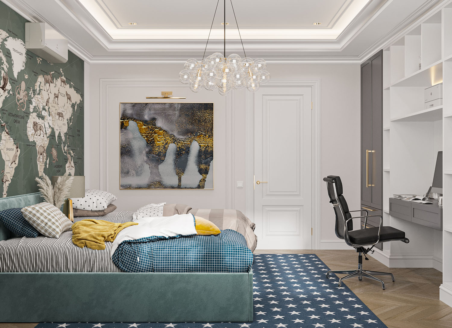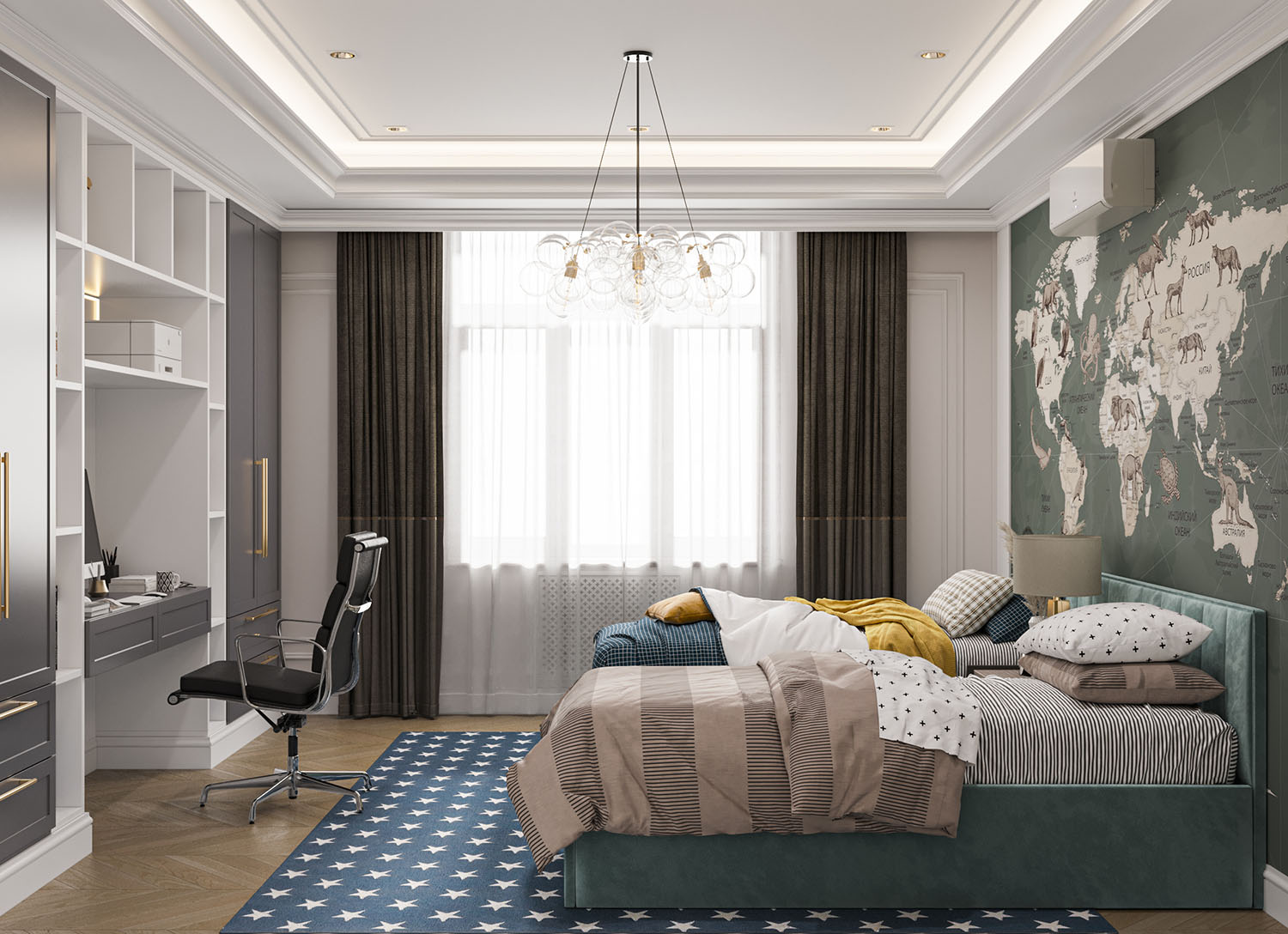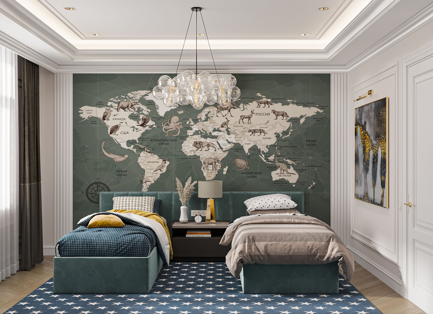 Детская комната площадью 18 м² для двух мальчиков в городе Душанбе, оформленная в современном стиле. Центральное место занимает стена с дизайнерскими обоями с крупным изображением карты мира, на которой отмечены океаны и изображены животные разных континентов. Карта выполнена в приглушенных зелёных и серых тонах, что создает спокойную и познавательную атмосферу.