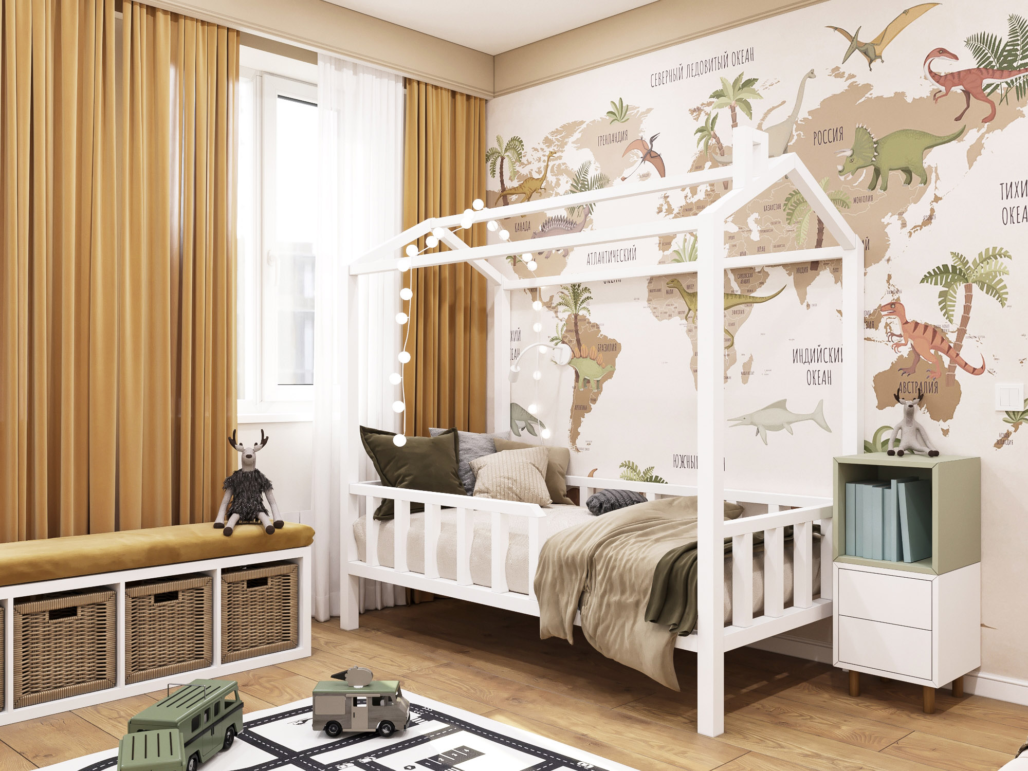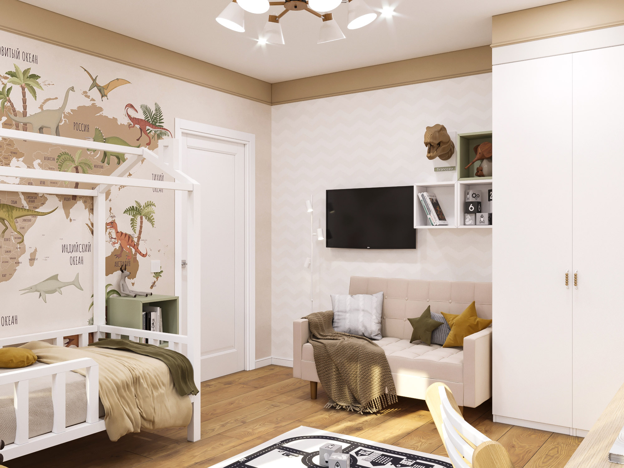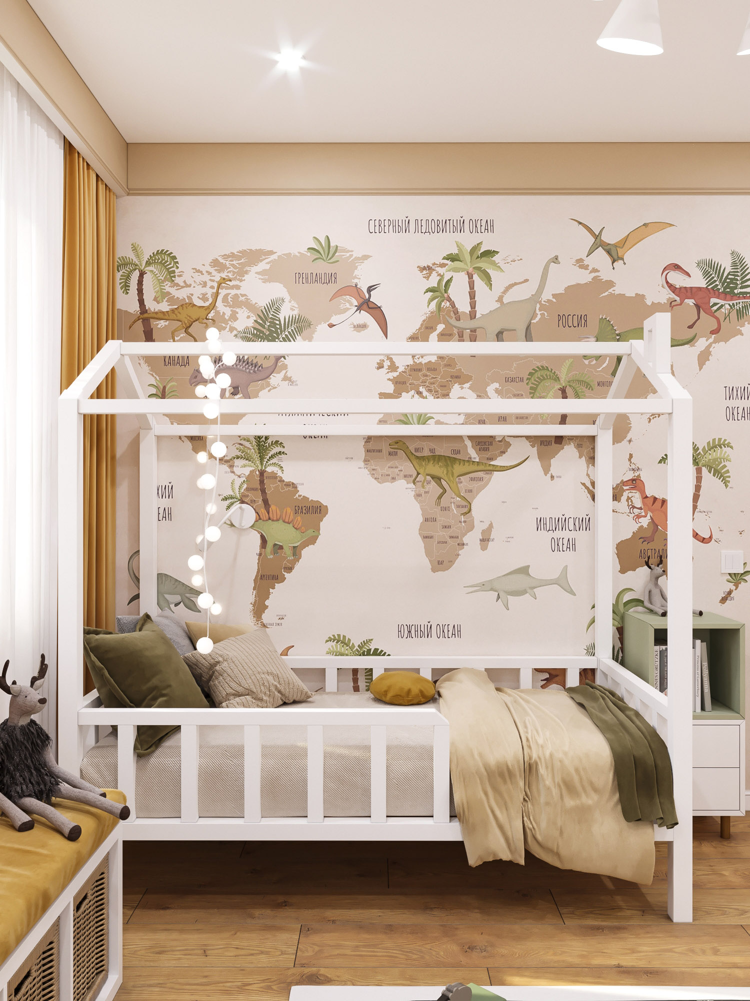 Для детской были выбраны теплые охристые оттенки с зелеными акцентами и молочно-белой базой. Основной тематикой комнаты стали динозавры. Стену в зоне сна оформили обоями с картой мира «Travel Kids». Карту масштабировали и расположили таким образом, чтобы малышу было удобно изучать самые мелкие детали, а все подписи были хорошо читаемы.