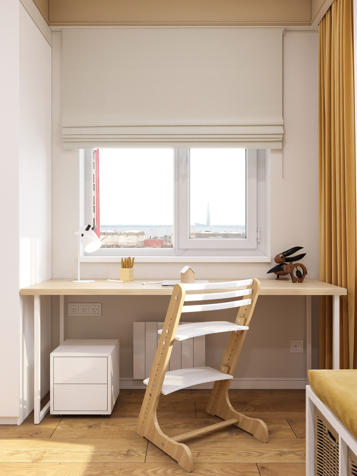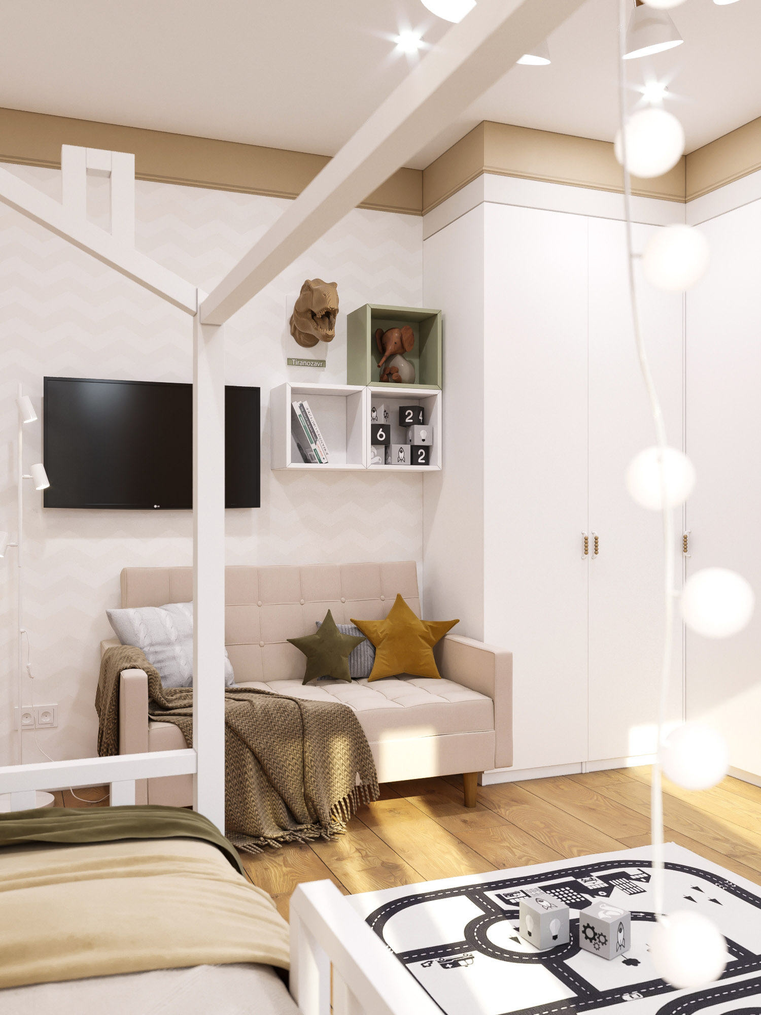 Квартира для молодой семьи в Санкт-Петербурге, общая площадь 83 м². Проект детской для пятилетнего мальчика, площадь комнаты — 16,4 м². Основной задачей было грамотно использовать пространство с учетом того, что в будущем в семье планируется пополнение. Ребенок увлекается динозаврами и любит конструкторы, поэтому в центре комнаты много свободного места для активных игр.
