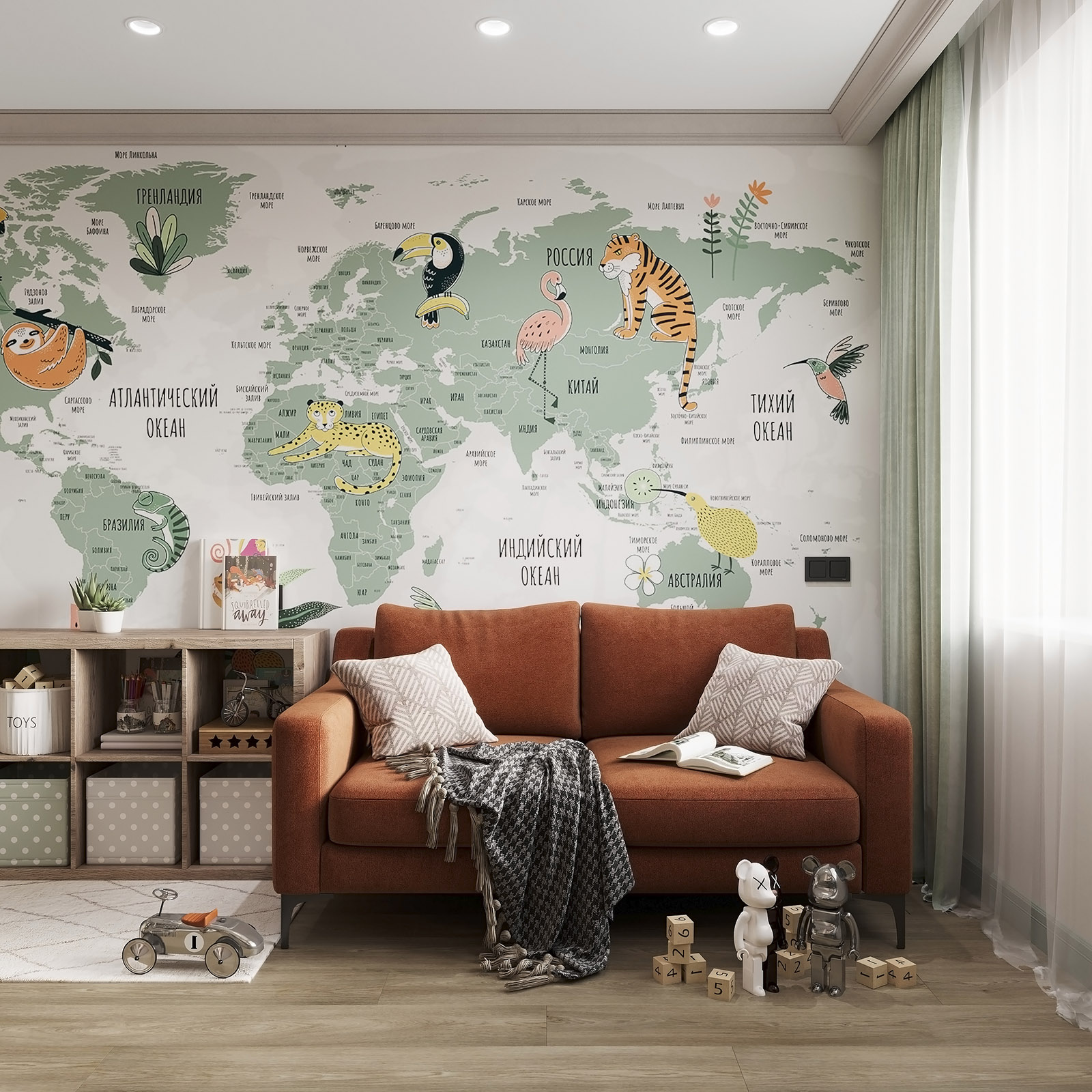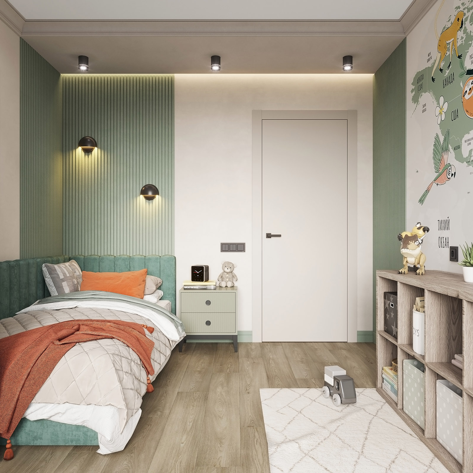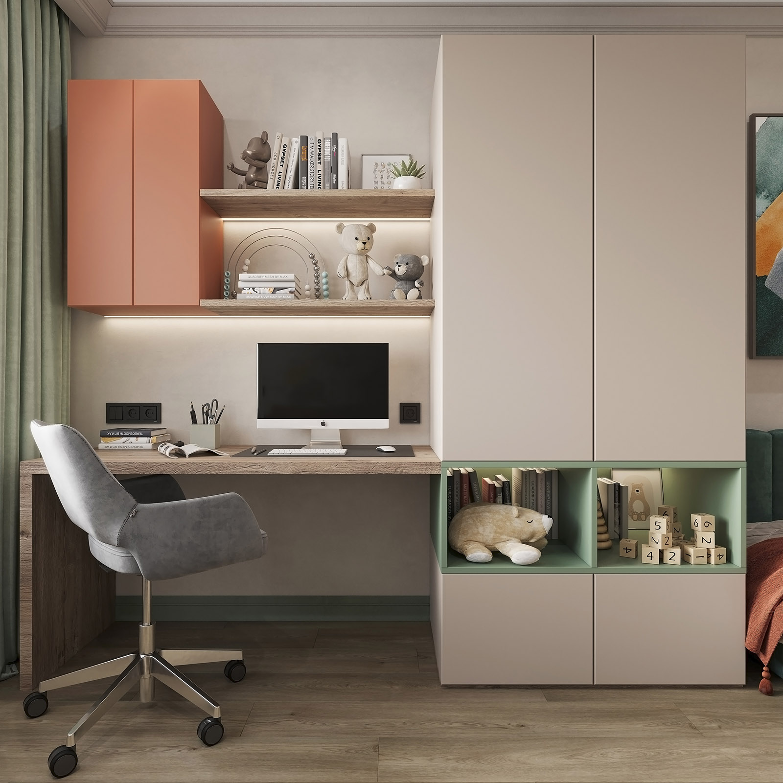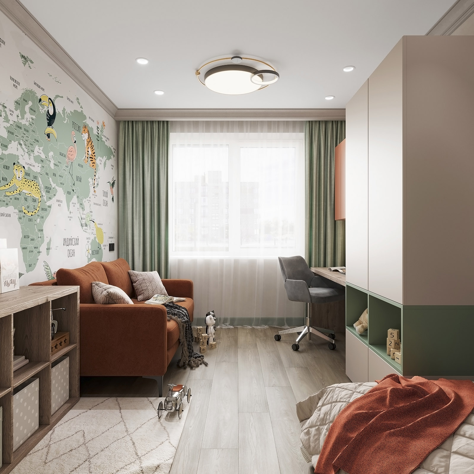 Дизайн детской комнаты площадью 14,3 м² для мальчика 7 лет, г. Абакан. Основными пожеланиями заказчиков были яркое цветовое решение и уместить максимум функционала: рабочая зона, лаунж-зона, система хранения для игрушек и гардероба. Фреска с картой мира из коллекции «Travel Kids», играющая развивающую роль, отлично вписалась в интерьер по цветовому решению.
