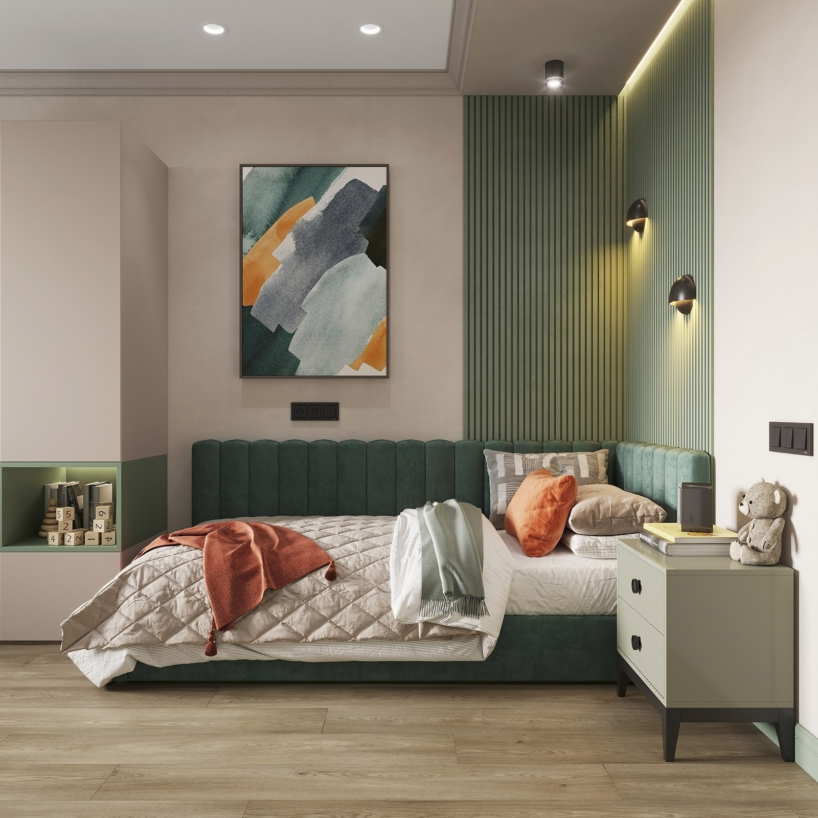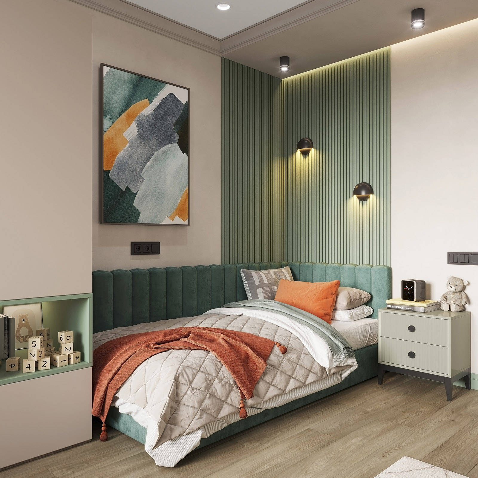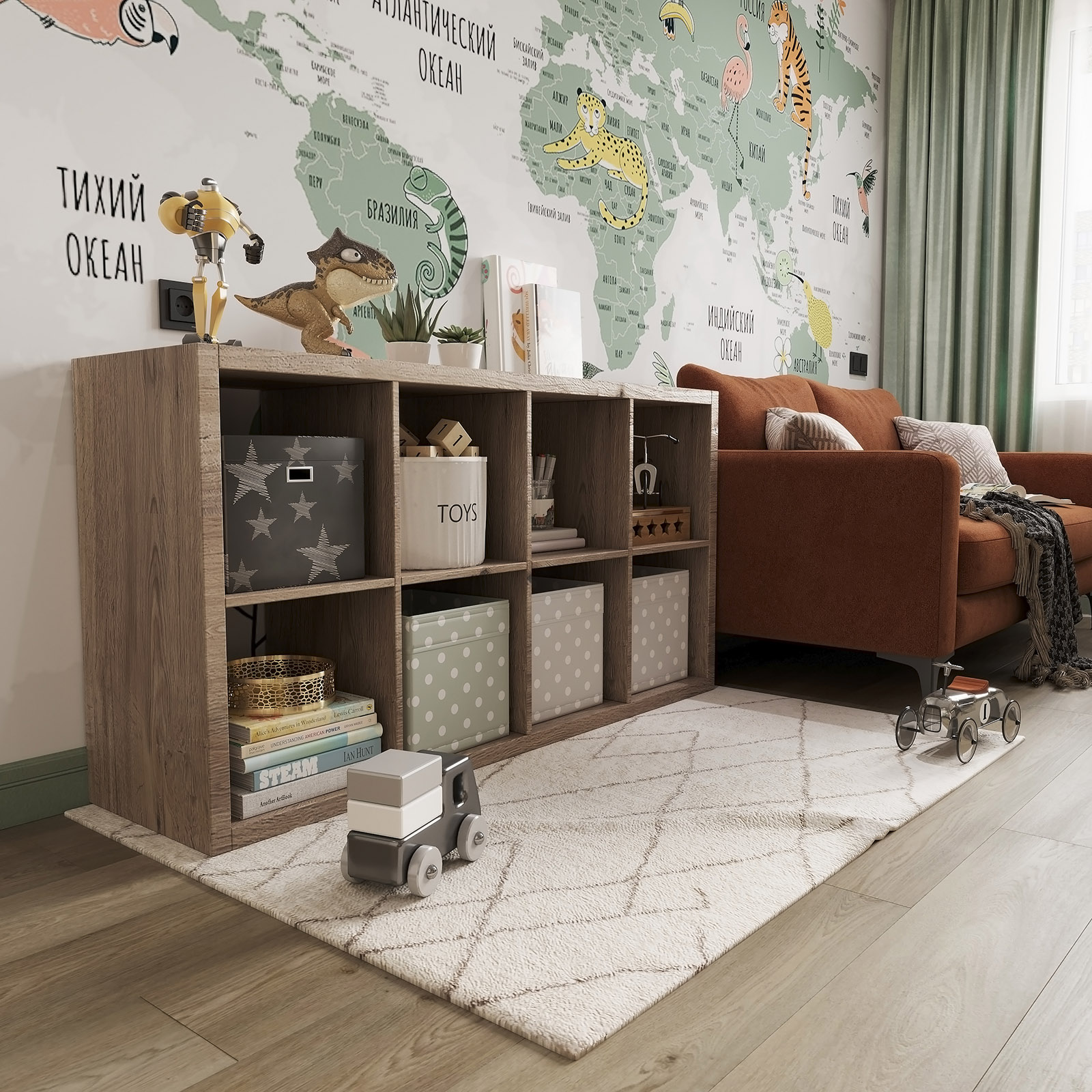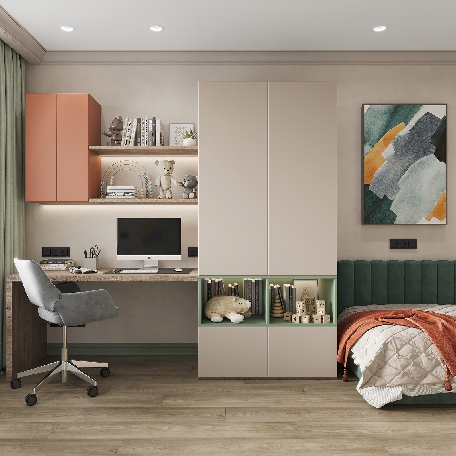 Дизайн детской комнаты площадью 14,3 м² для мальчика 7 лет, г. Абакан. Основными пожеланиями заказчиков были яркое цветовое решение и уместить максимум функционала: рабочая зона, лаунж-зона, система хранения для игрушек и гардероба. Фреска с картой мира из коллекции «Travel Kids», играющая развивающую роль, отлично вписалась в интерьер по цветовому решению.