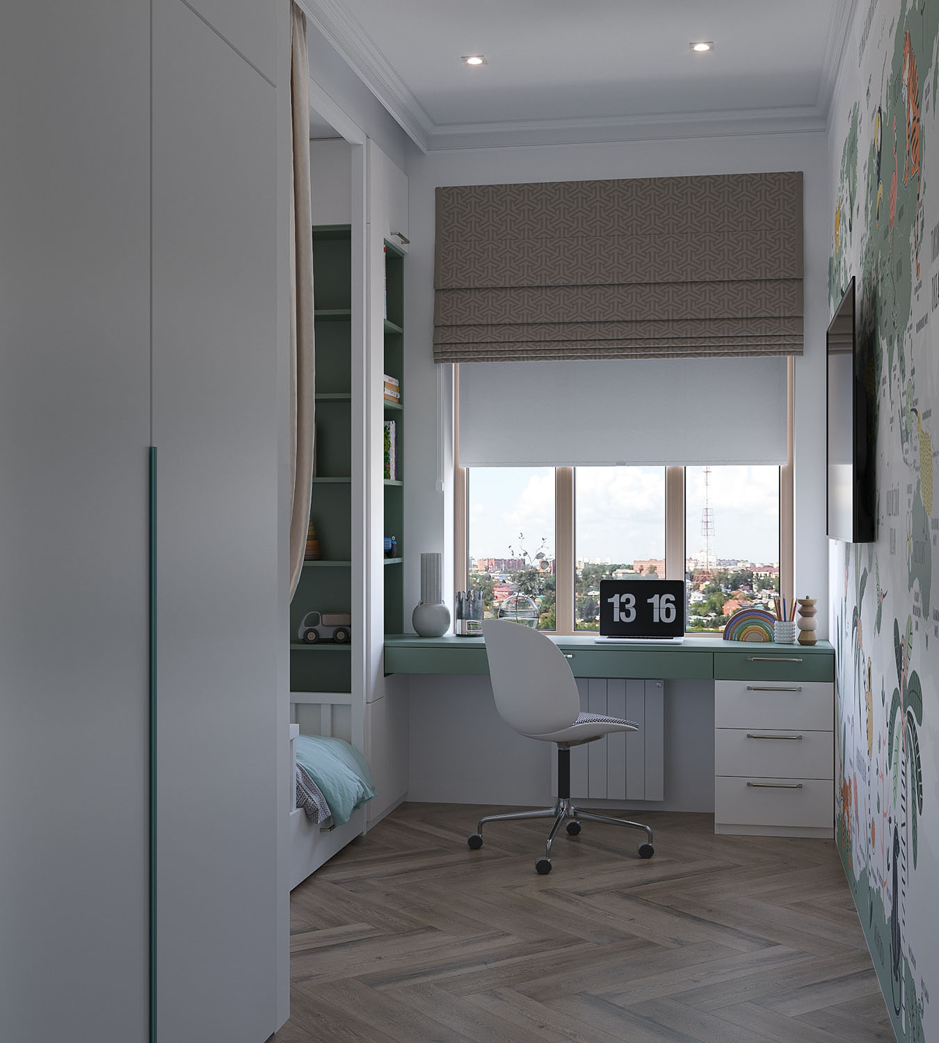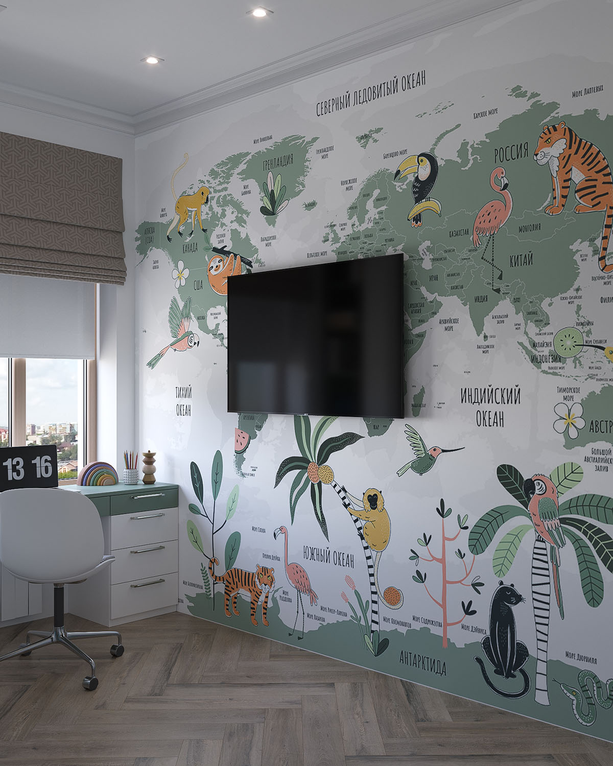 Для первого подобрали обои из коллекции TRAVEL KIDS. Карта мира – довольно частый атрибут в комнате ребенка, ведь благодаря ей он может учиться легко и играючи. Карта мира в коллекции TRAVEL KIDS – это не просто точное отображение стран и городов, но и яркое тематическое оформление! Стиль можно подобрать под интересы и вкусы юного первооткрывателя: рисованные принты с динозаврами, которые показывают Землю в доисторический период, или стилизованные изображения достопримечательностей – Эйфелевой и Пизанской башен, Биг Бена, Статуи Свободы и других.