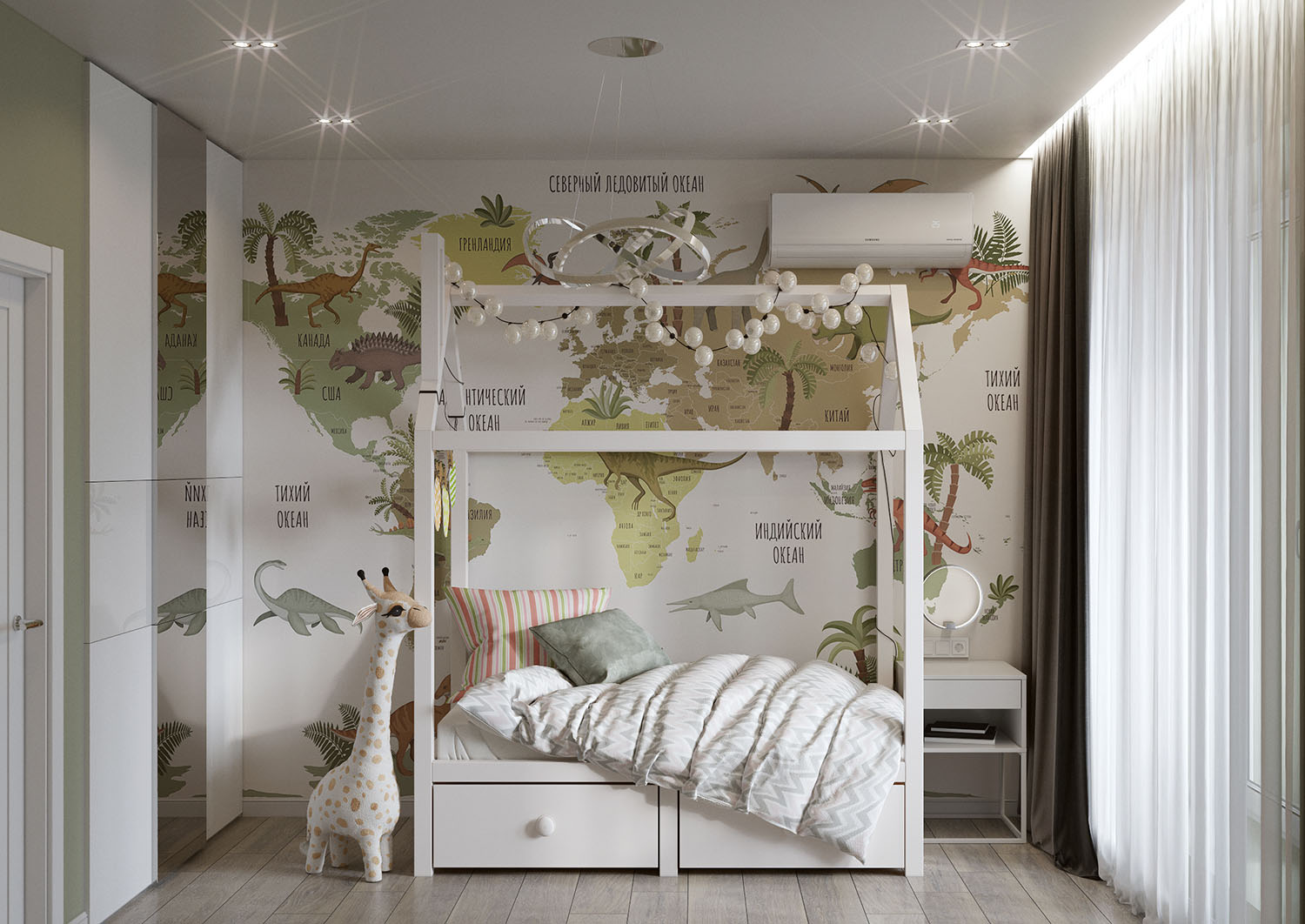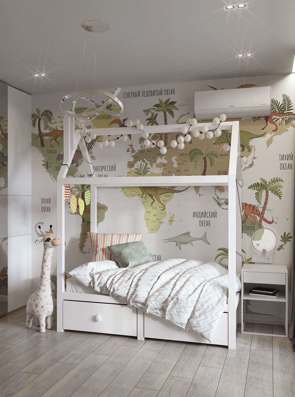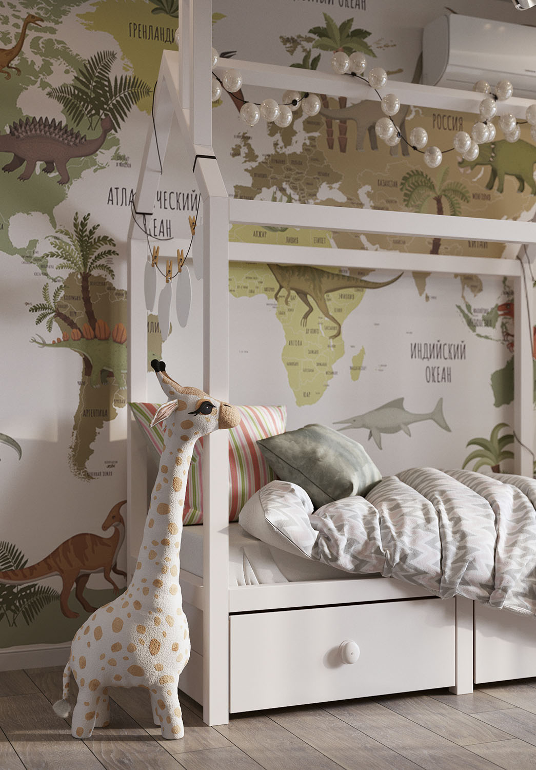 Детская комната площадью 12,5 м² для маленького мальчика, который увлекается изучением животных и стран. Поэтому для оформления акцентной стены была выбрана коллекция TRAVEL KIDS. Это не просто точное отображение стран и городов, но и яркое тематическое оформление! Стиль можно подобрать под интересы и вкусы юного первооткрывателя: рисованные принты с динозаврами, которые показывают Землю в доисторический период, или стилизованные изображения достопримечательностей – Эйфелевой и Пизанской башен, Биг Бена, Статуи Свободы и других.