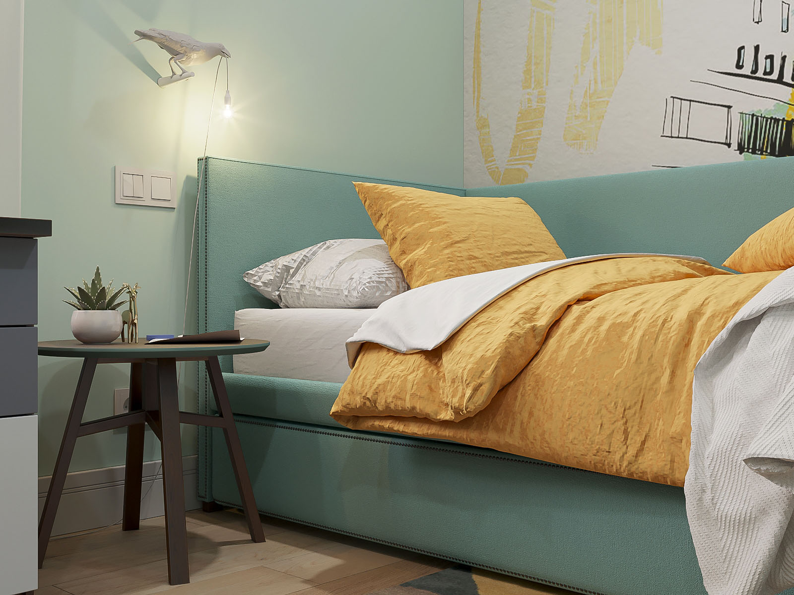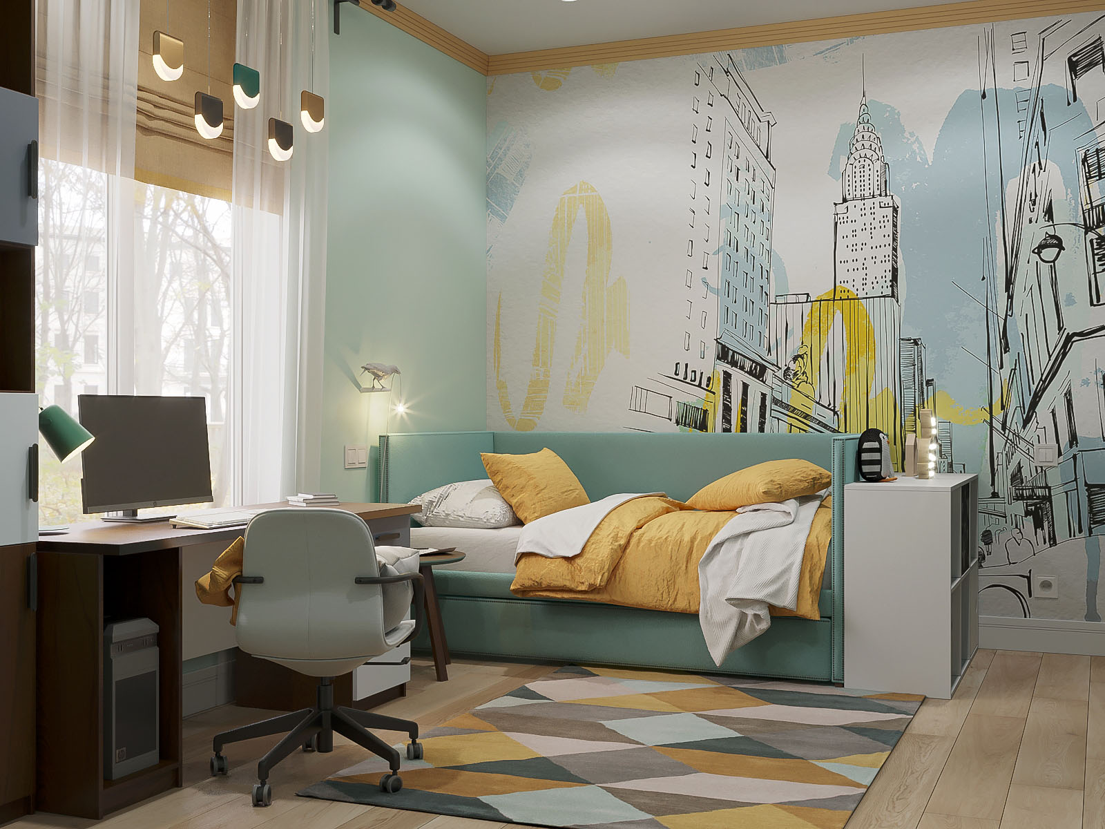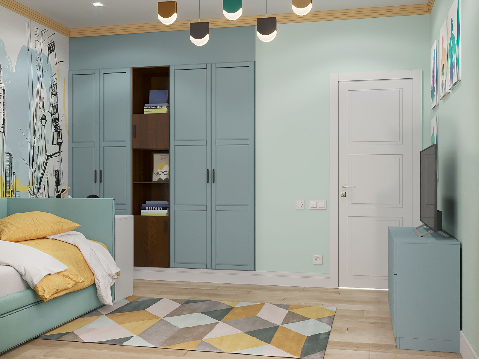 Яркая детская комната для мальчика 6 лет в ЖК «Big Time» города Москвы. У заказчика были самые стандартные пожелания: кровать, письменный стол, места хранения и пространство для игр на ковре. Дизайнер решил не скромничать с цветовой гаммой и выбрал нестандартную палитру для мебели, отделки и декора. Обои выполнены в той же цветовой гамме.