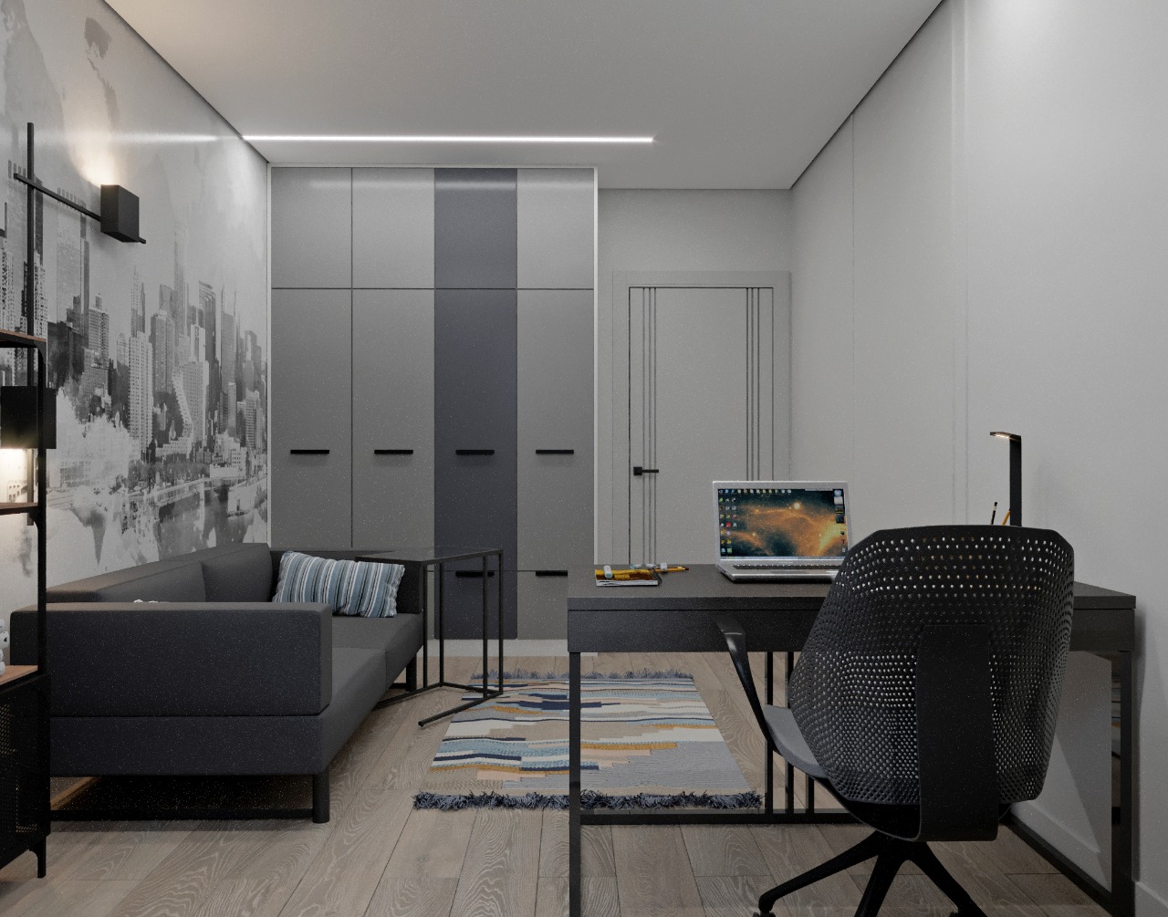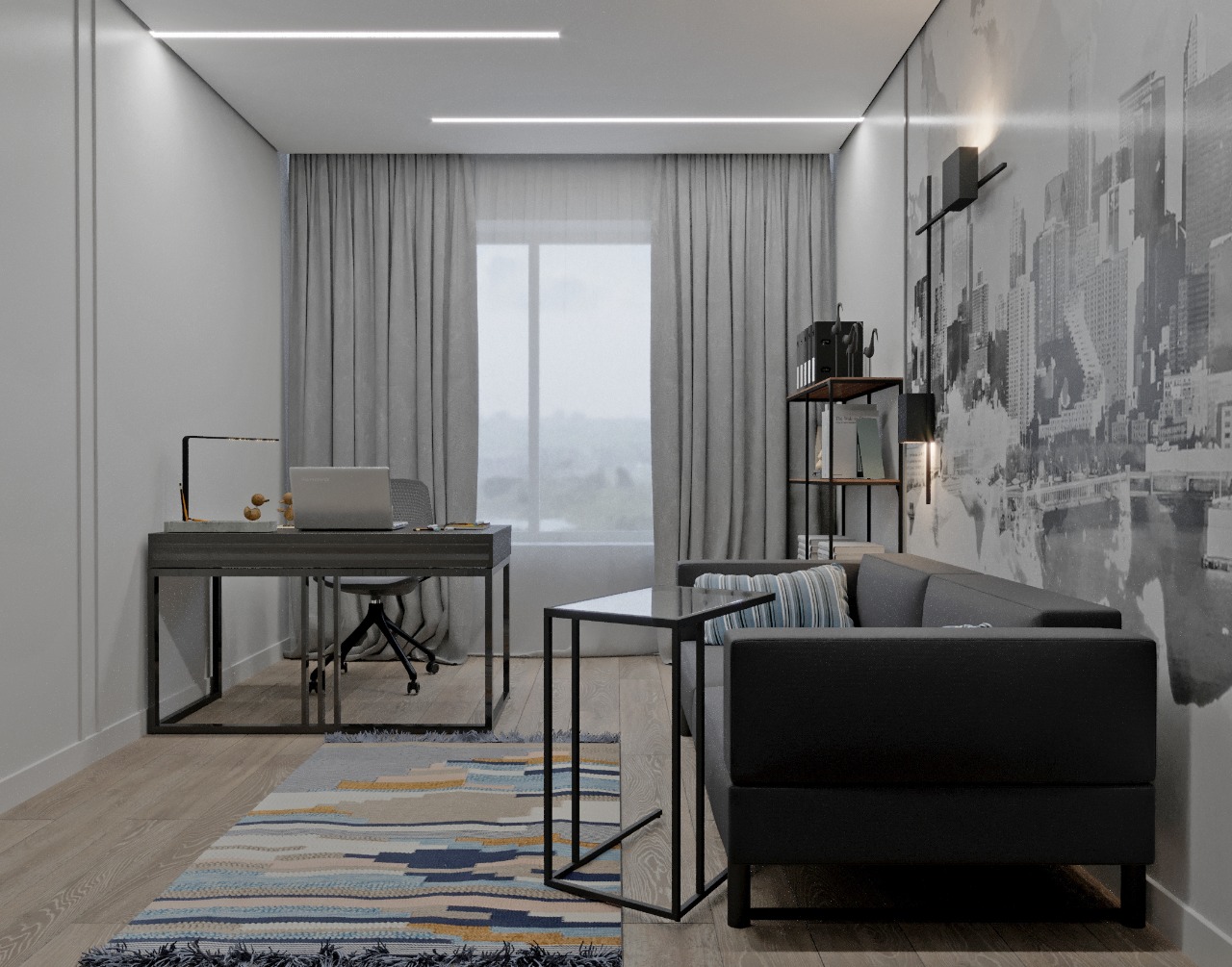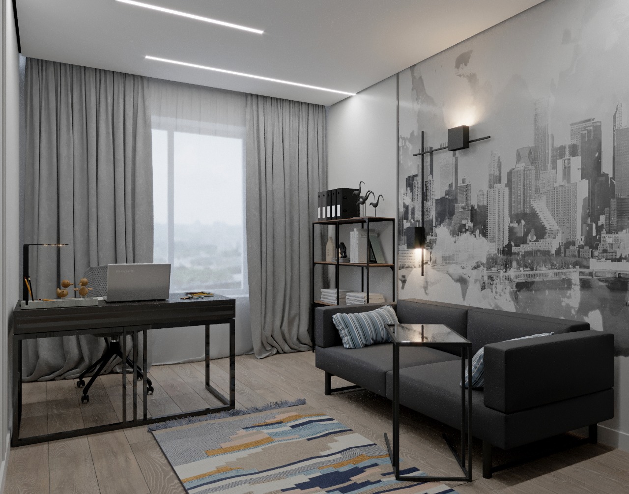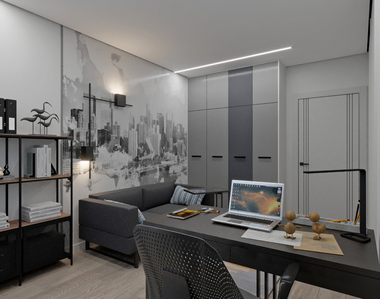 Проект кабинета, для которого в качестве акцента была выбрана фреска из коллекции Urban. Современная и ультрамодная, коллекция передаёт настроение большого города всем, кто ценит простор и свободу.