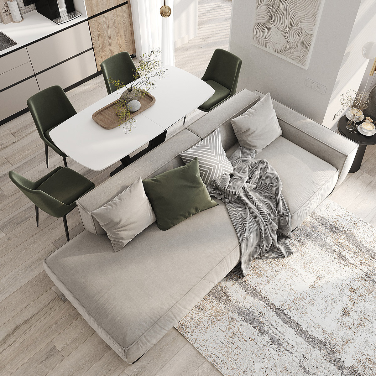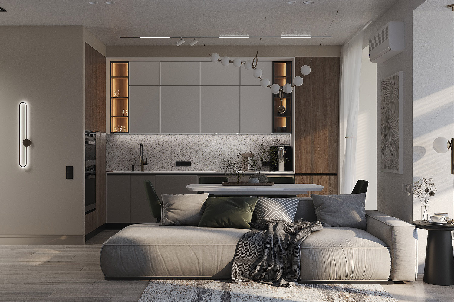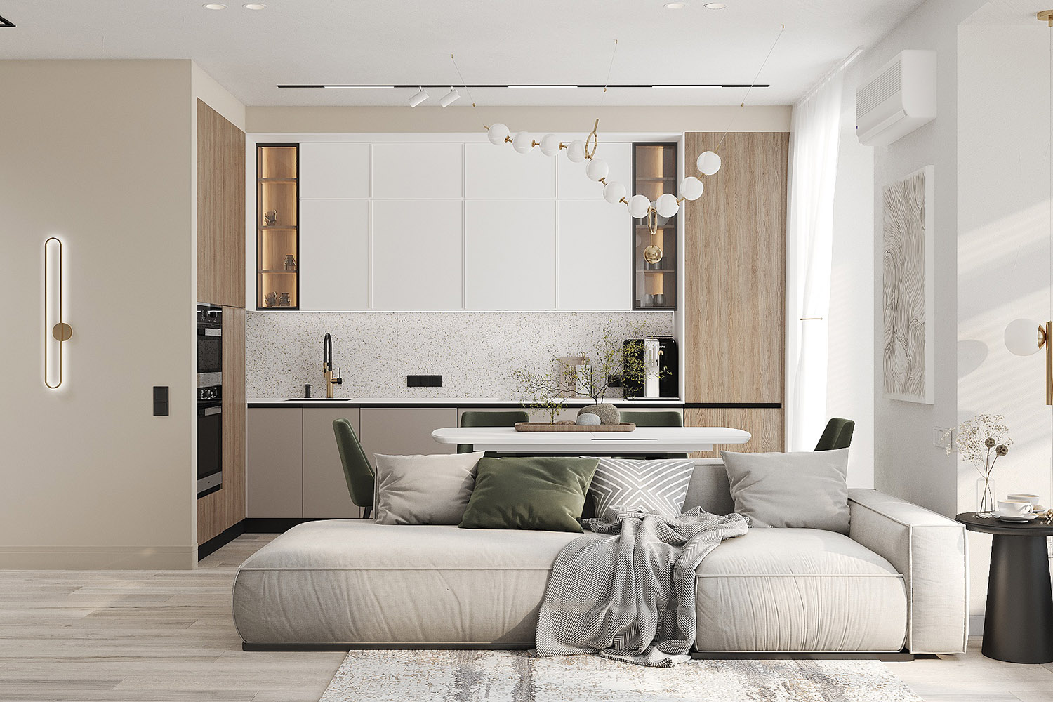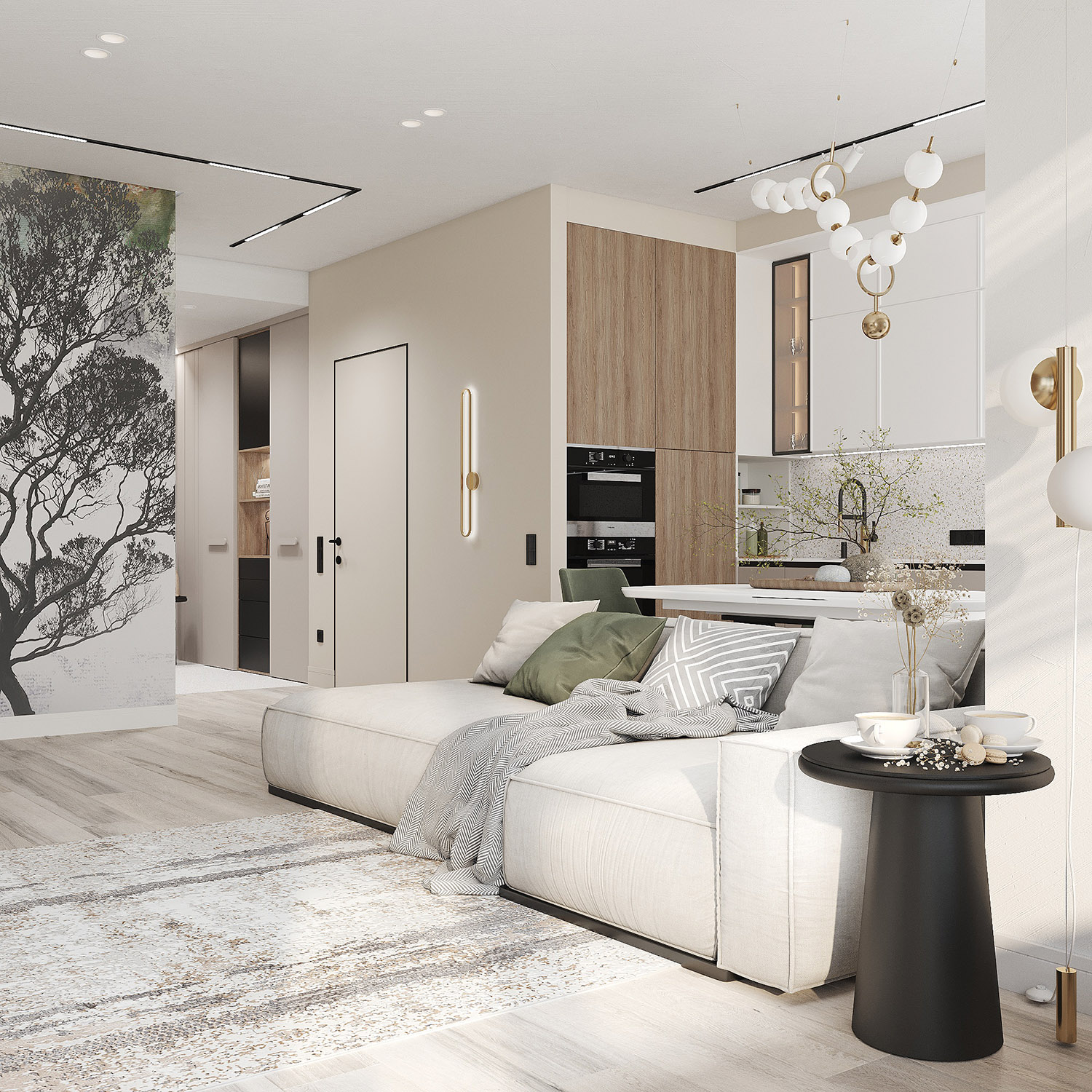 Проект кухни-гостиной в ЖК «Scandis ozero» города Красноярска для взрослой пары. Это микрорайон для тех, кто не готов расстаться с детской мечтой о жизни на природе у воды, даже в формате мегаполиса. Во дворе этого ЖК создано искусственное озеро. Дизайнер захотел привнести атмосферу жизни на природе и в интерьер этой квартиры. Он выполнен в современном стиле с нотами природных оттенков и изображений на стенах в виде дизайнерских обоев VETVE 21.