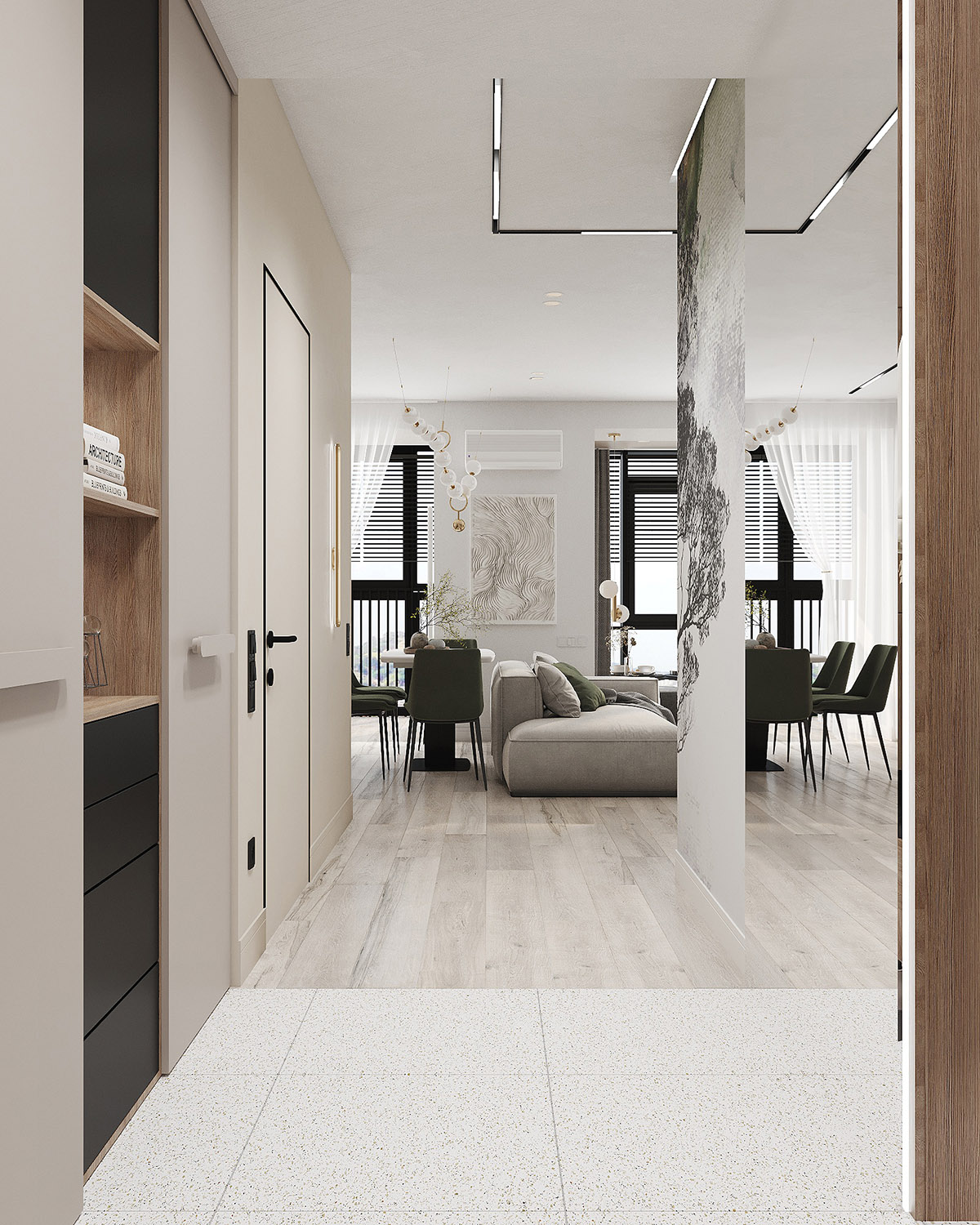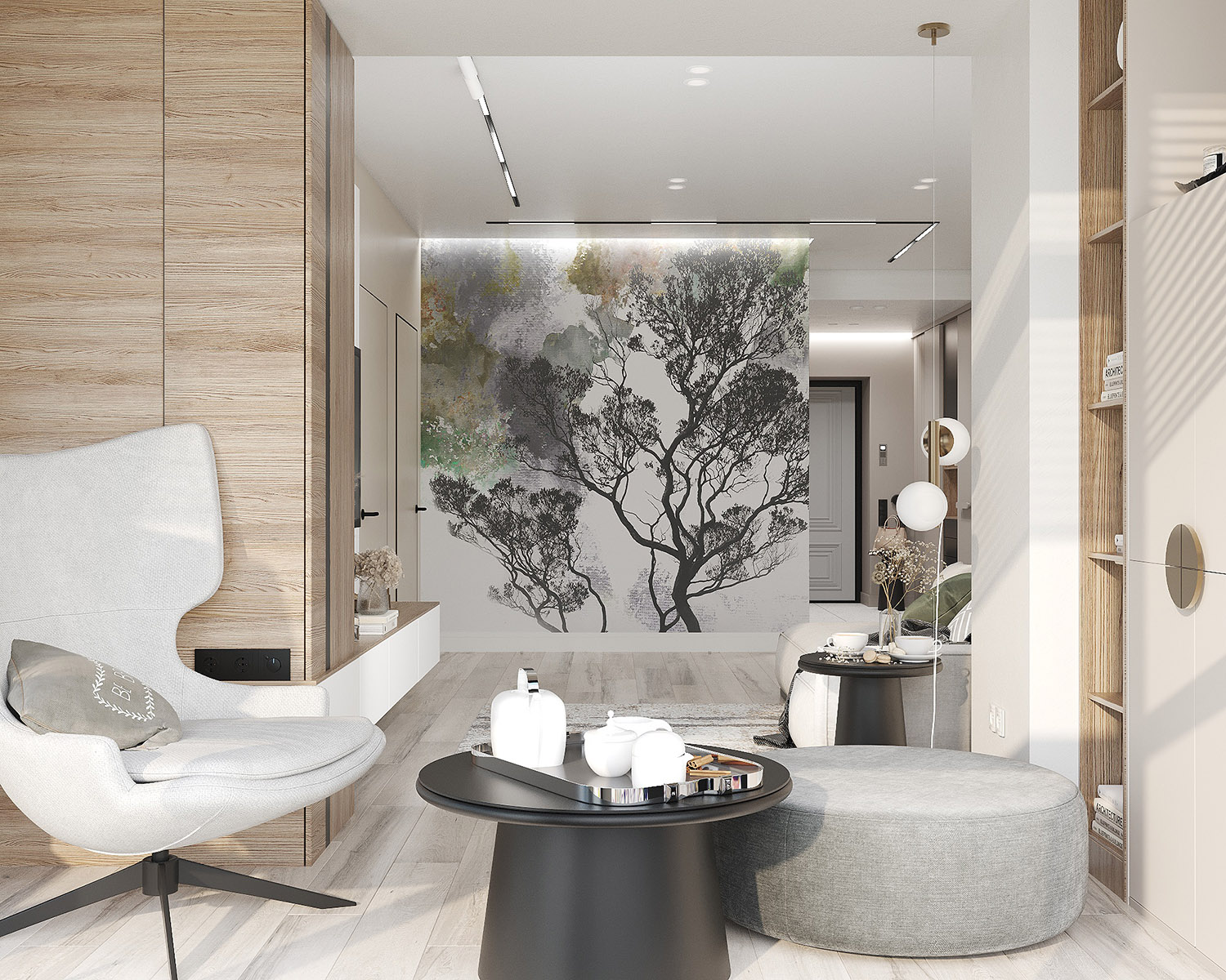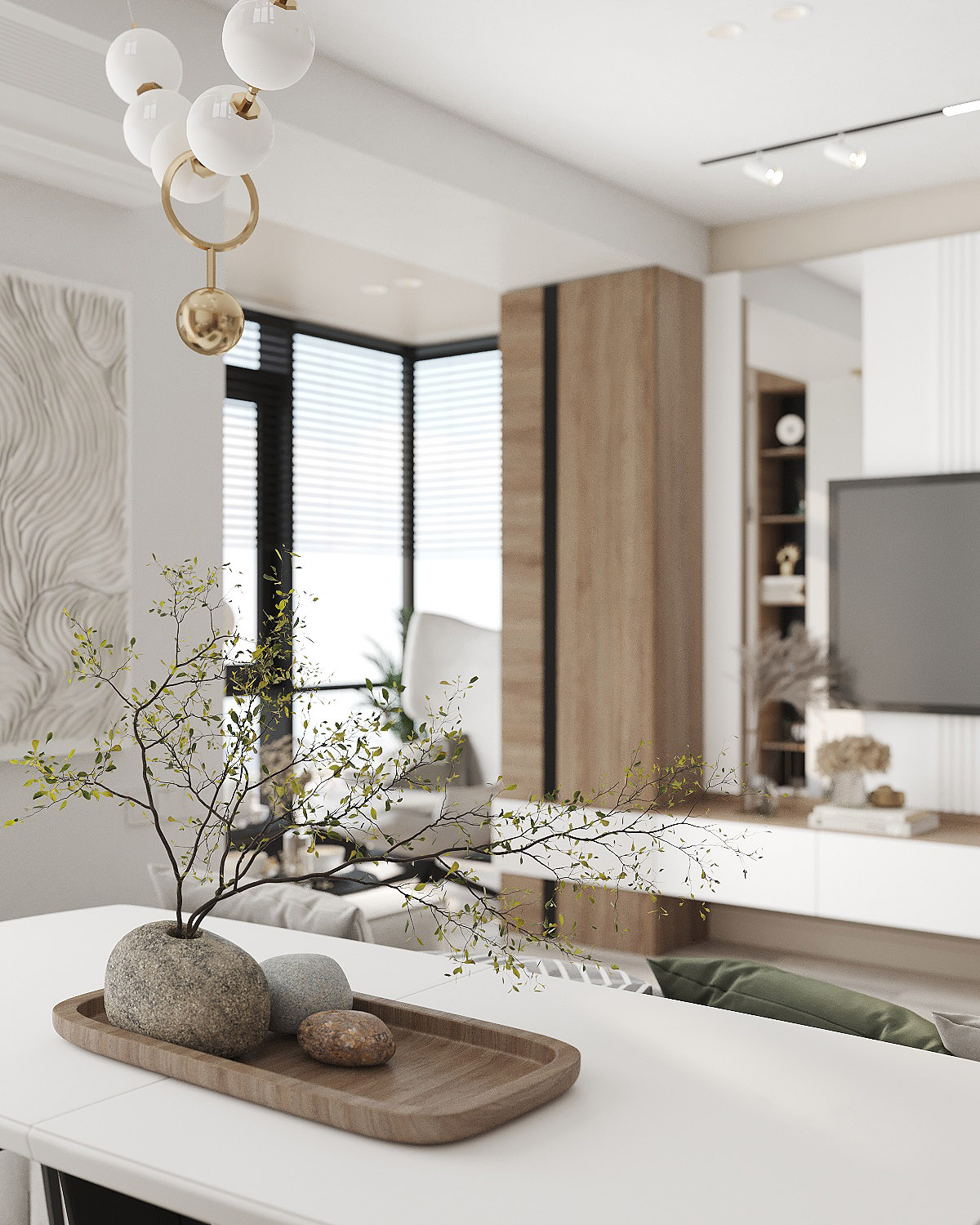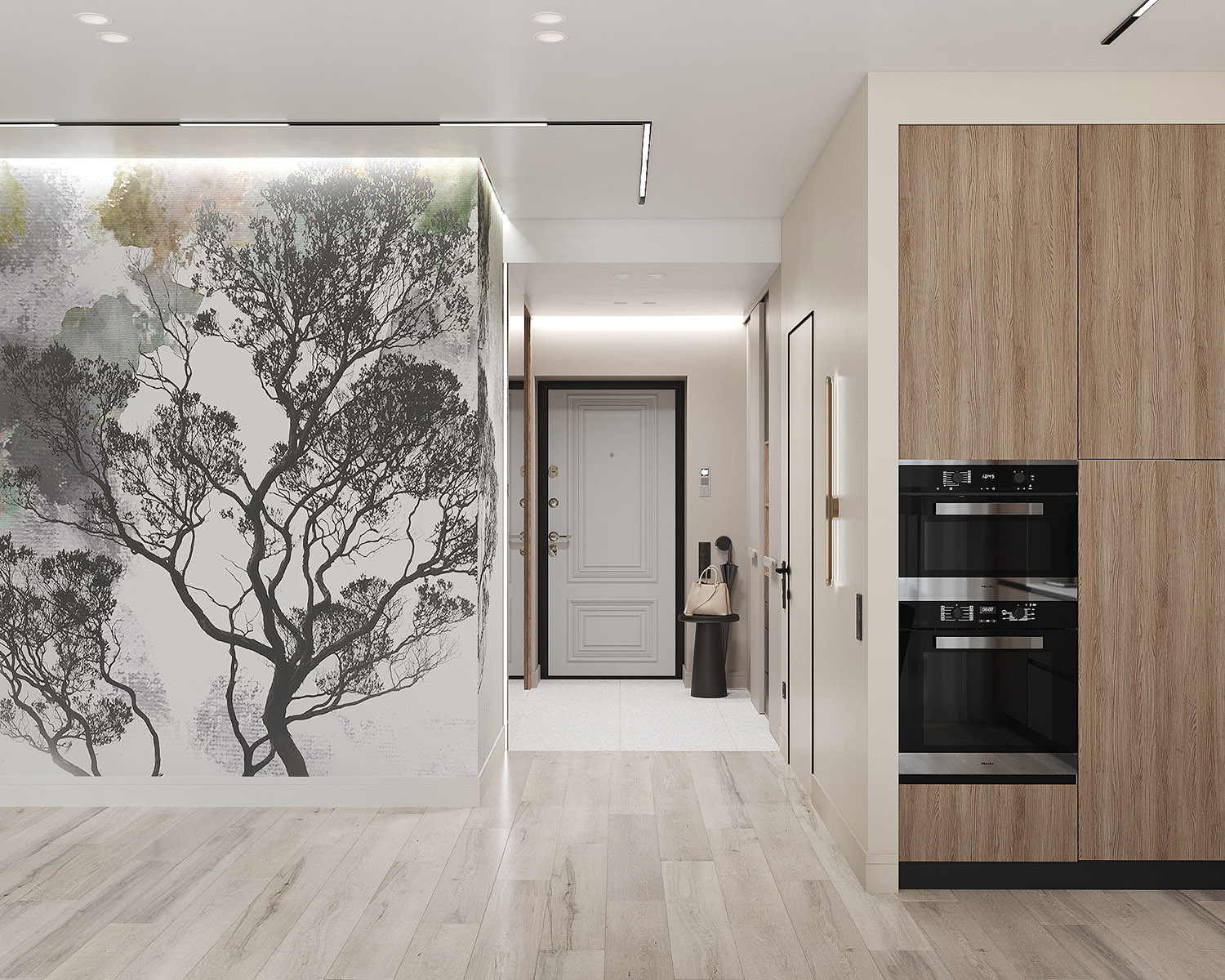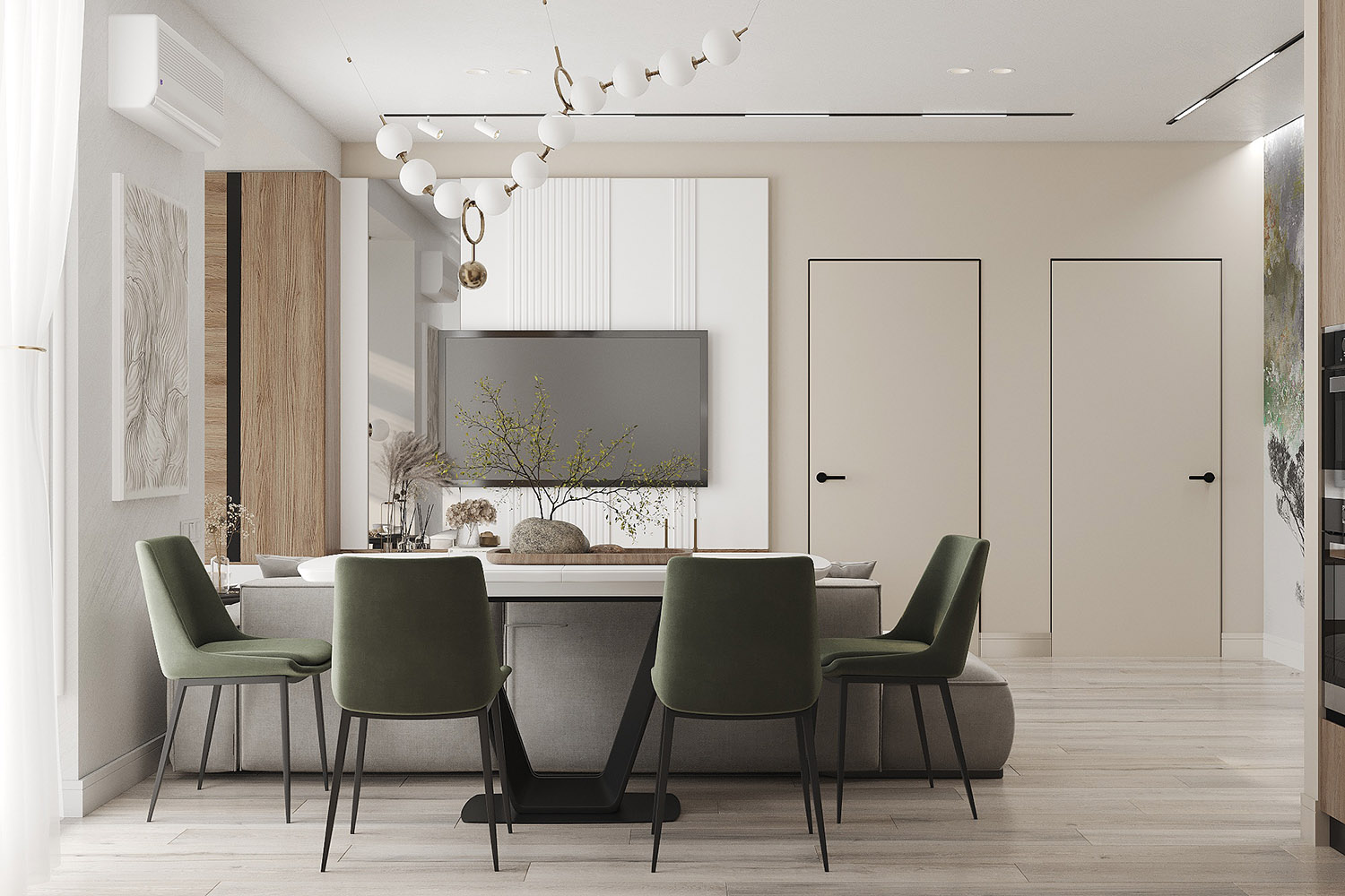 Проект кухни-гостиной в ЖК «Scandis ozero» города Красноярска для взрослой пары. Это микрорайон для тех, кто не готов расстаться с детской мечтой о жизни на природе у воды, даже в формате мегаполиса. Во дворе этого ЖК создано искусственное озеро. Дизайнер захотел привнести атмосферу жизни на природе и в интерьер этой квартиры. Он выполнен в современном стиле с нотами природных оттенков и изображений на стенах в виде дизайнерских обоев VETVE 21.