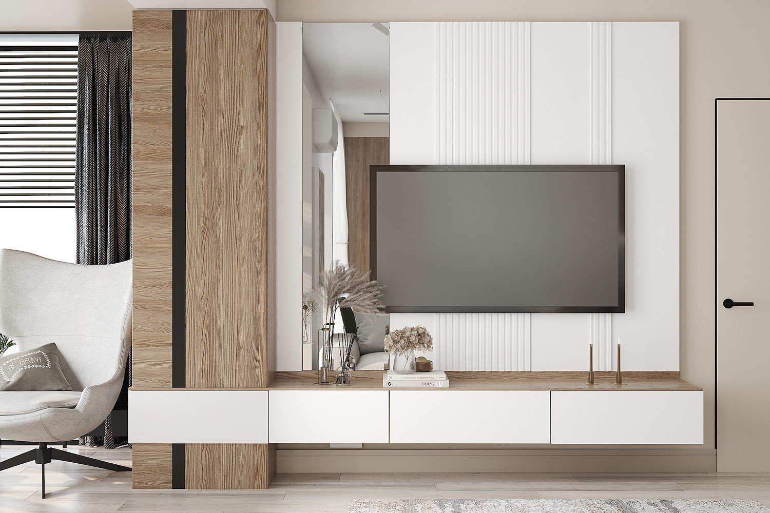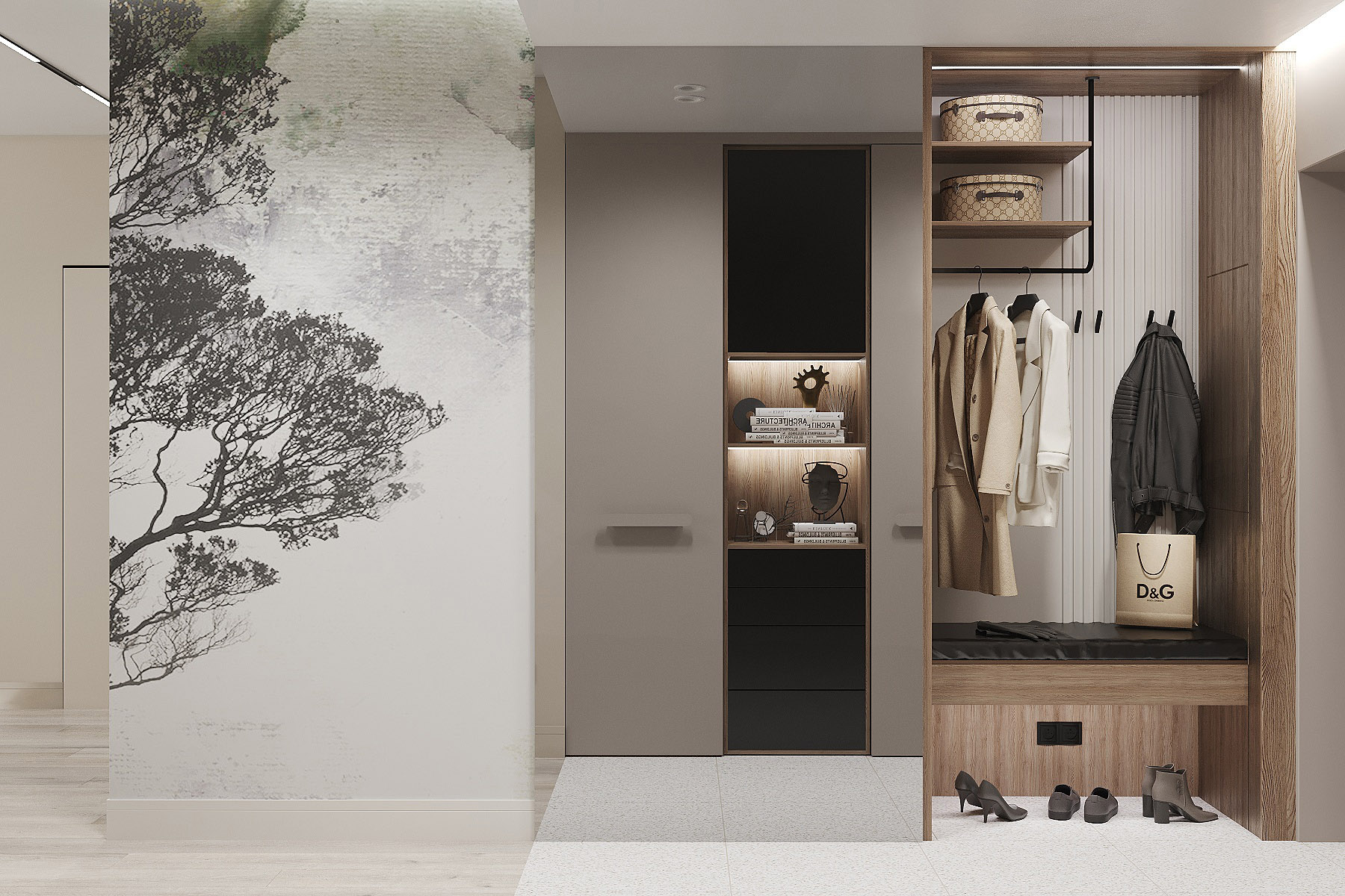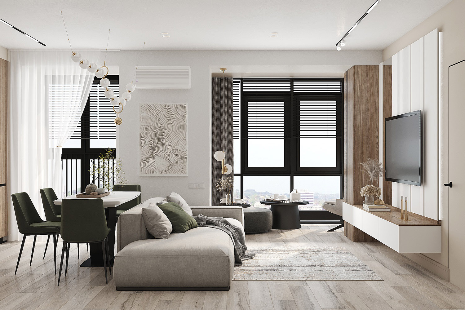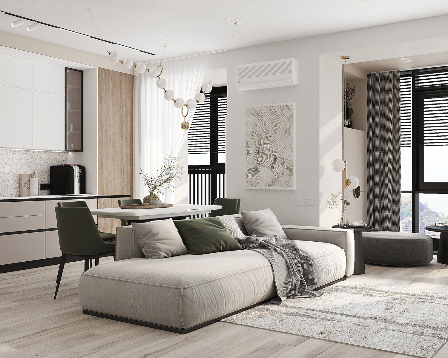 Проект кухни-гостиной в ЖК «Scandis ozero» города Красноярска для взрослой пары. Это микрорайон для тех, кто не готов расстаться с детской мечтой о жизни на природе у воды, даже в формате мегаполиса. Во дворе этого ЖК создано искусственное озеро. Дизайнер захотел привнести атмосферу жизни на природе и в интерьер этой квартиры. Он выполнен в современном стиле с нотами природных оттенков и изображений на стенах в виде дизайнерских обоев VETVE 21.
