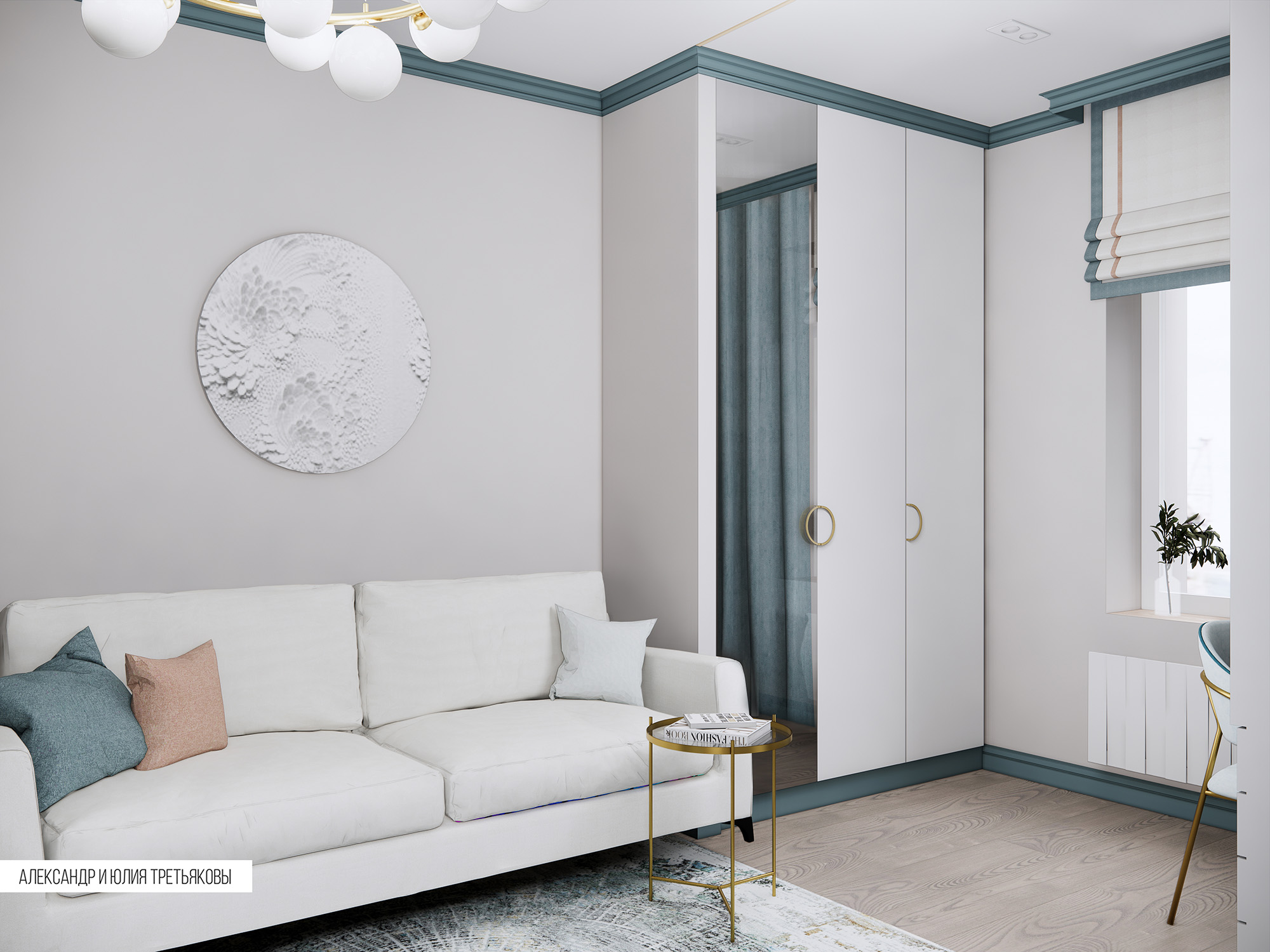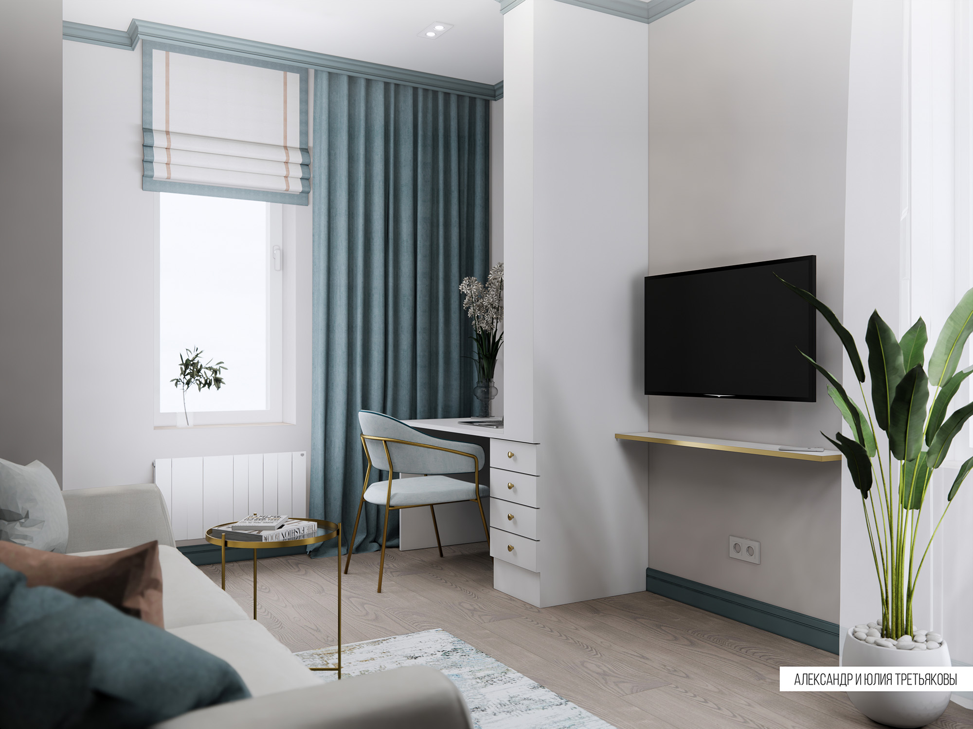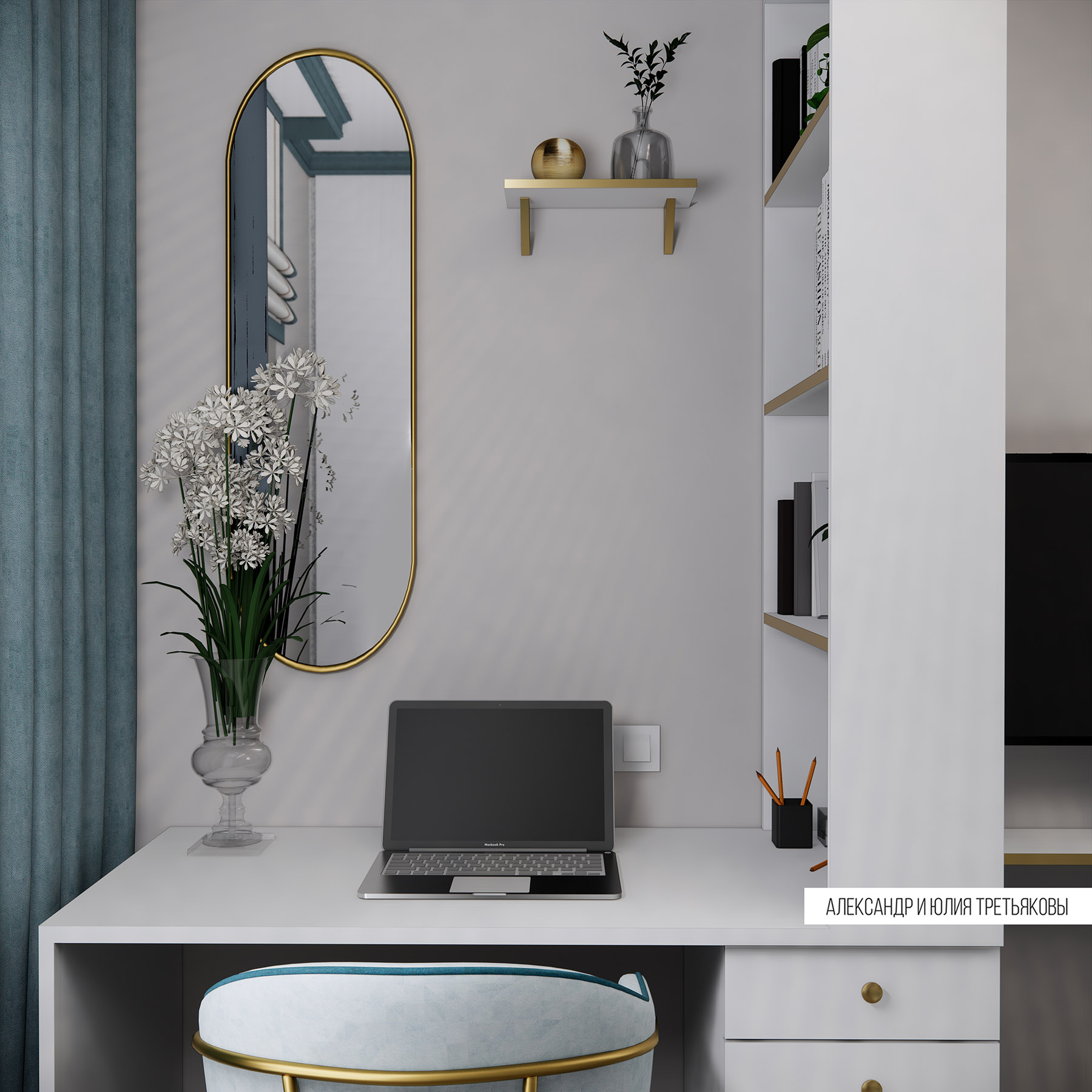 Сейчас у заказчиков нет детей, но пожеланием было сделать такой дизайн, чтобы в будущем эта комната стала детской. Пока что она будет использоваться как кабинет, отсюда и гамма была выбрана нейтральная с яркими акцентами цвета морской волны, который подчеркивает геометрию помещения через цветной плинтус и карниз, поддерживается в текстиле. Обои «Vetve 22» использовались на акцентной стене с ещё одним эффектом: над обоями находится зеркало, образовывая таким образом некий портал, что придает пространству легкость, глубину и интересный оптический эффект.