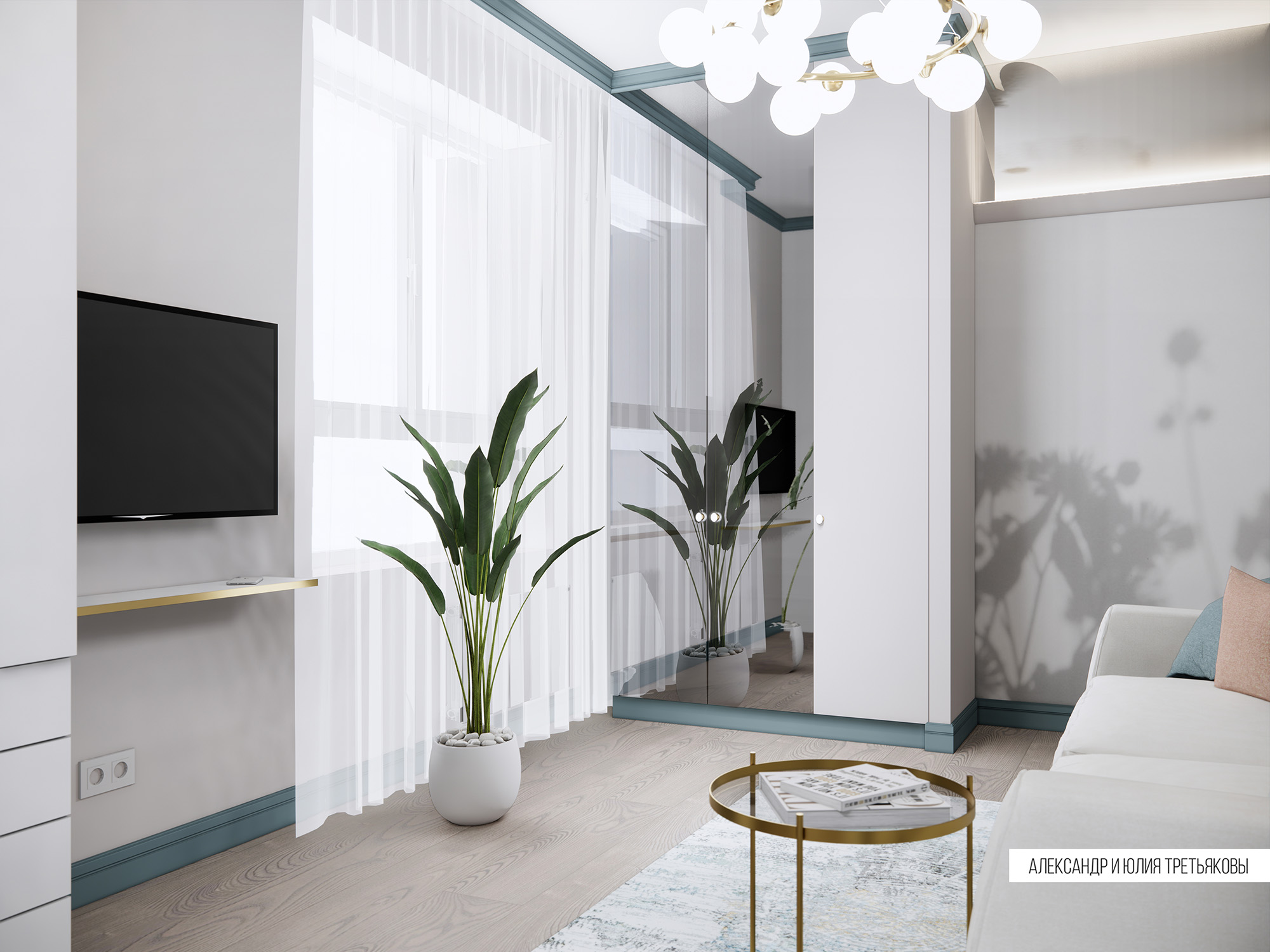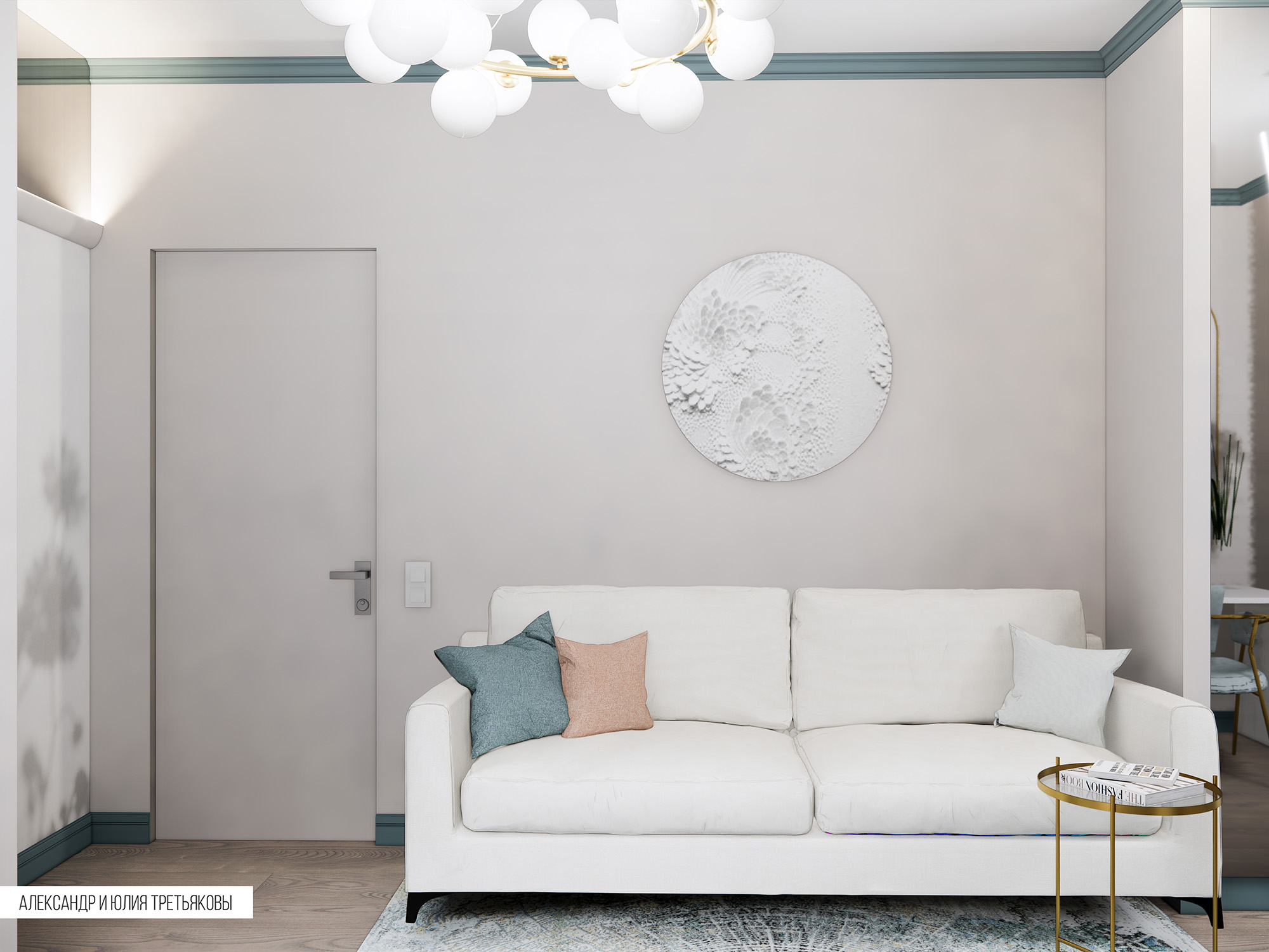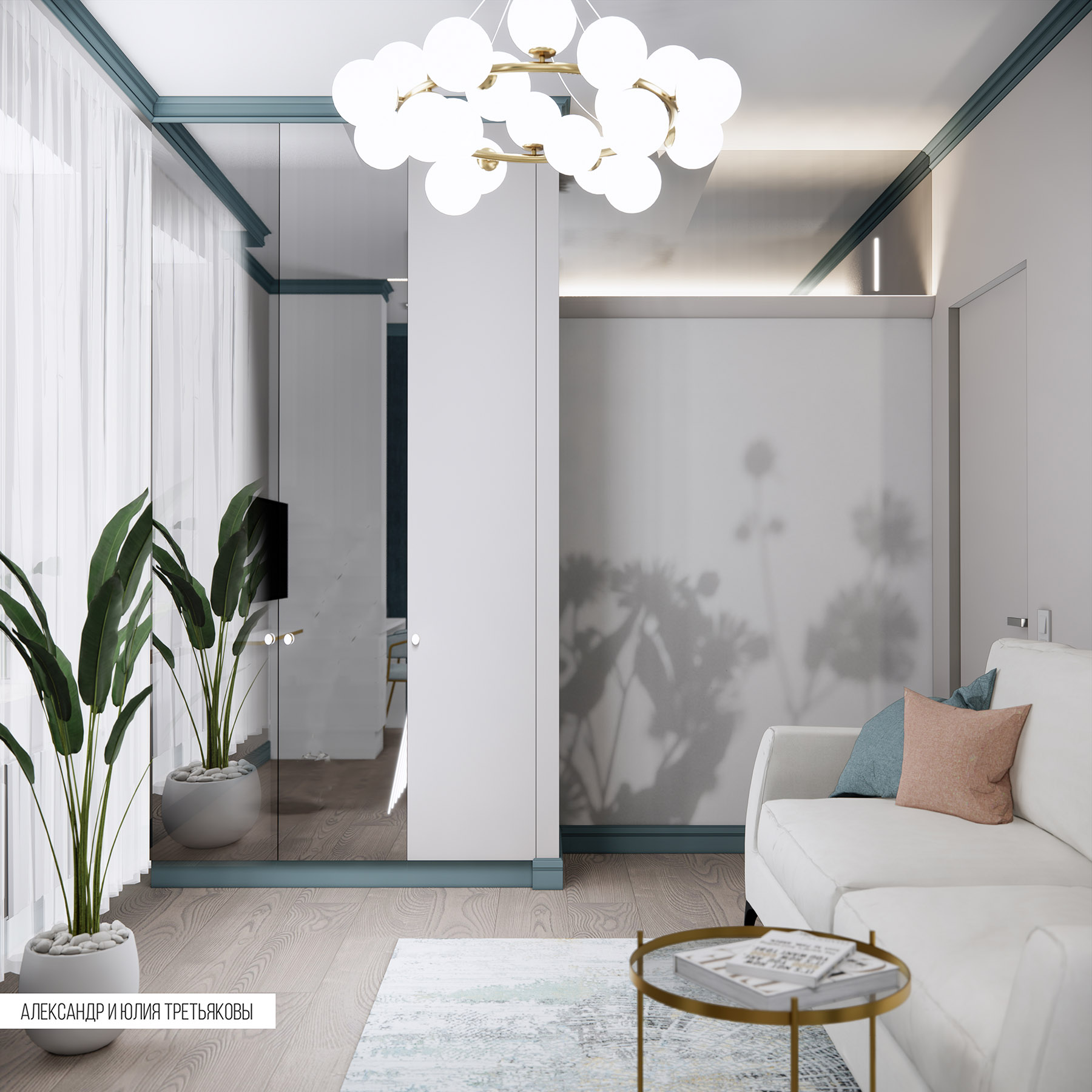 Сейчас у заказчиков нет детей, но пожеланием было сделать такой дизайн, чтобы в будущем эта комната стала детской. Пока что она будет использоваться как кабинет, отсюда и гамма была выбрана нейтральная с яркими акцентами цвета морской волны, который подчеркивает геометрию помещения через цветной плинтус и карниз, поддерживается в текстиле. Обои «Vetve 22» использовались на акцентной стене с ещё одним эффектом: над обоями находится зеркало, образовывая таким образом некий портал, что придает пространству легкость, глубину и интересный оптический эффект.