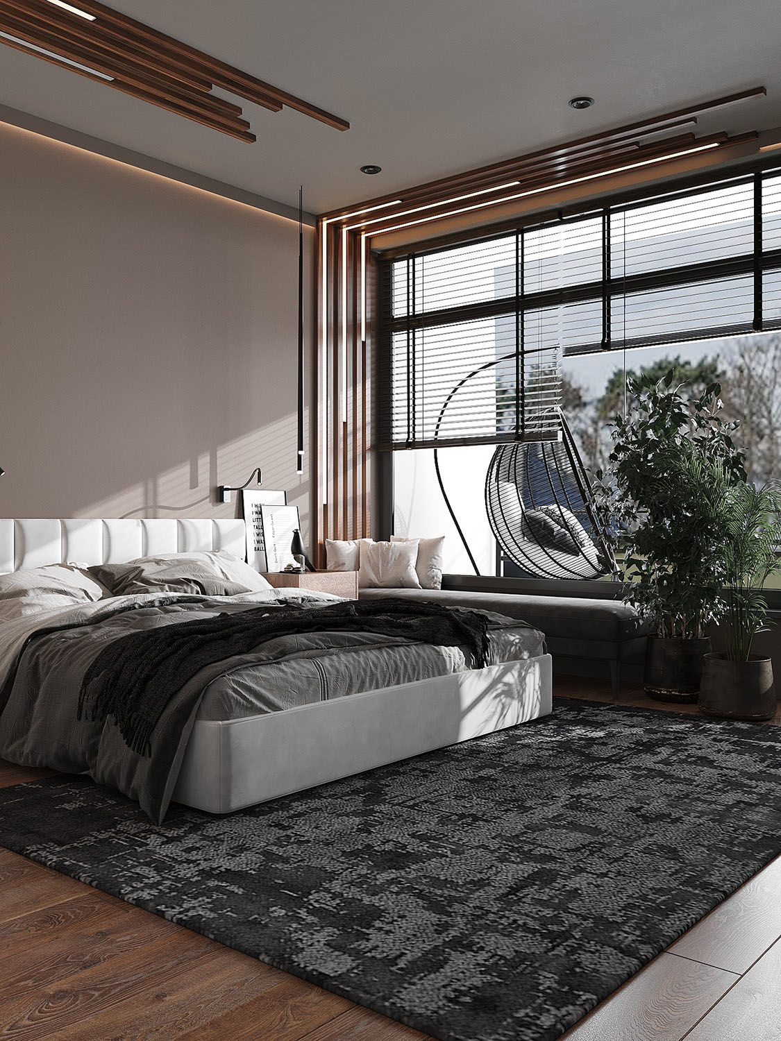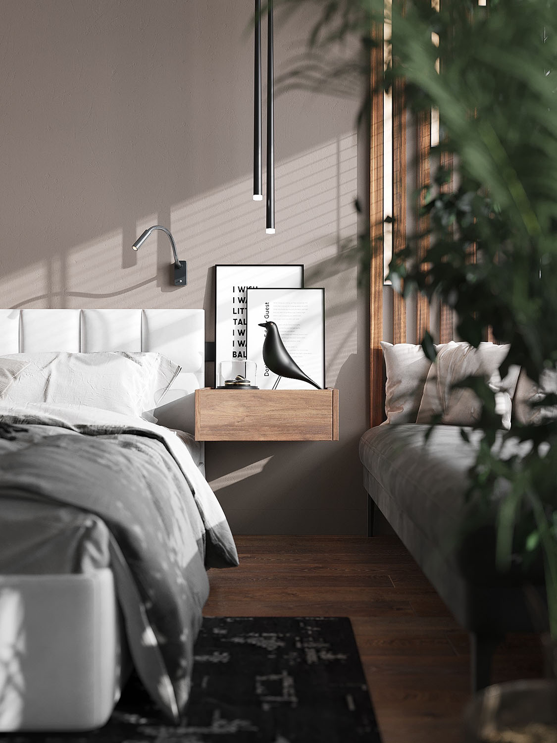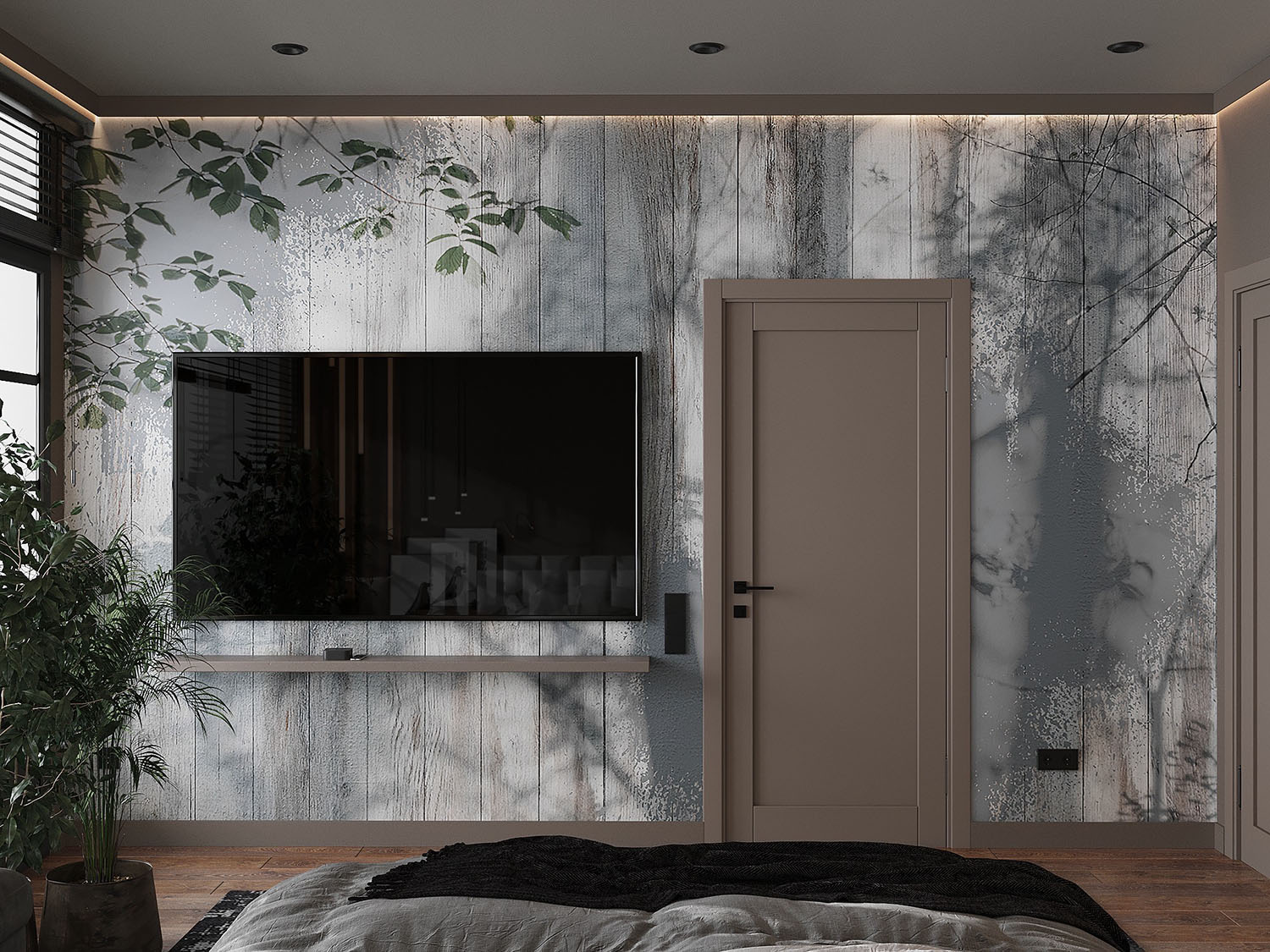 Дом в Куликово на первой линии берега Балтийского моря. Мастер-спальня для семьи докторов. Обои из коллекции VETVE 22. Тени цветов, пальмовых ветвей и других растений на стенах погрузят вас в бесконечное лето.