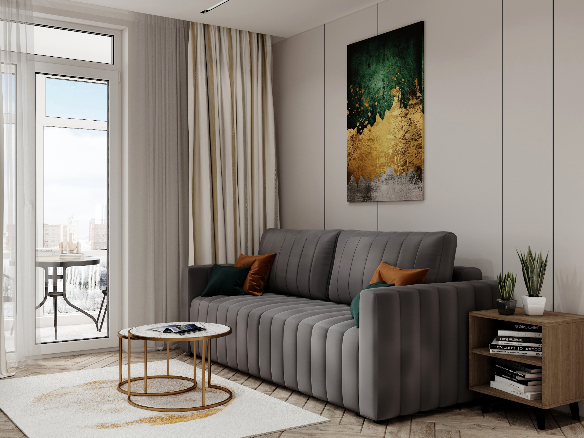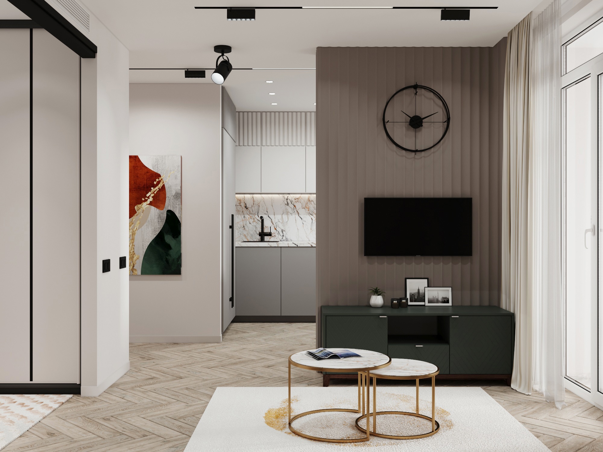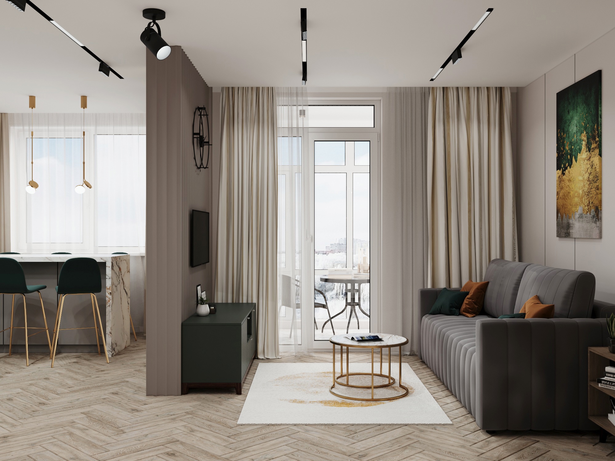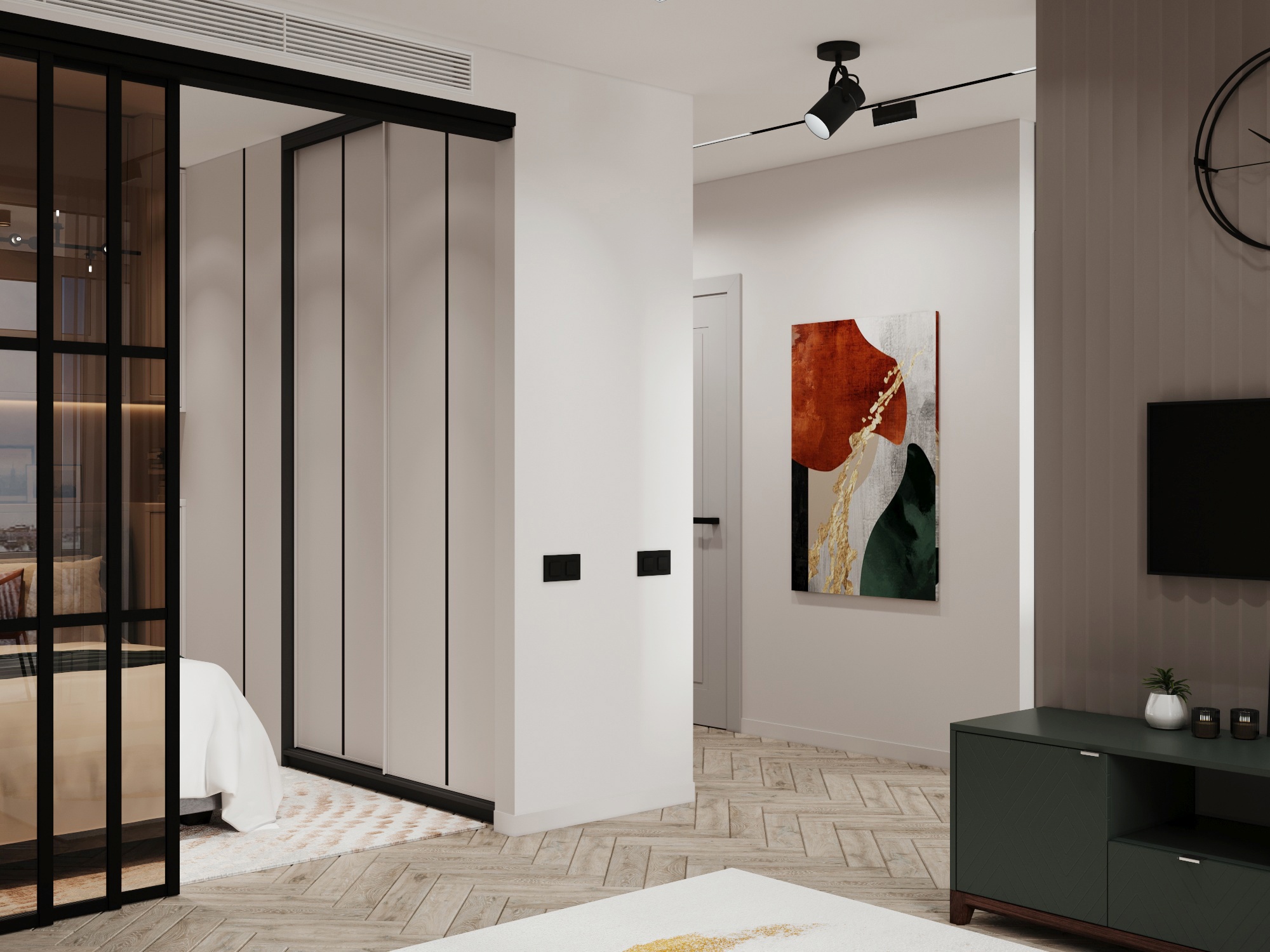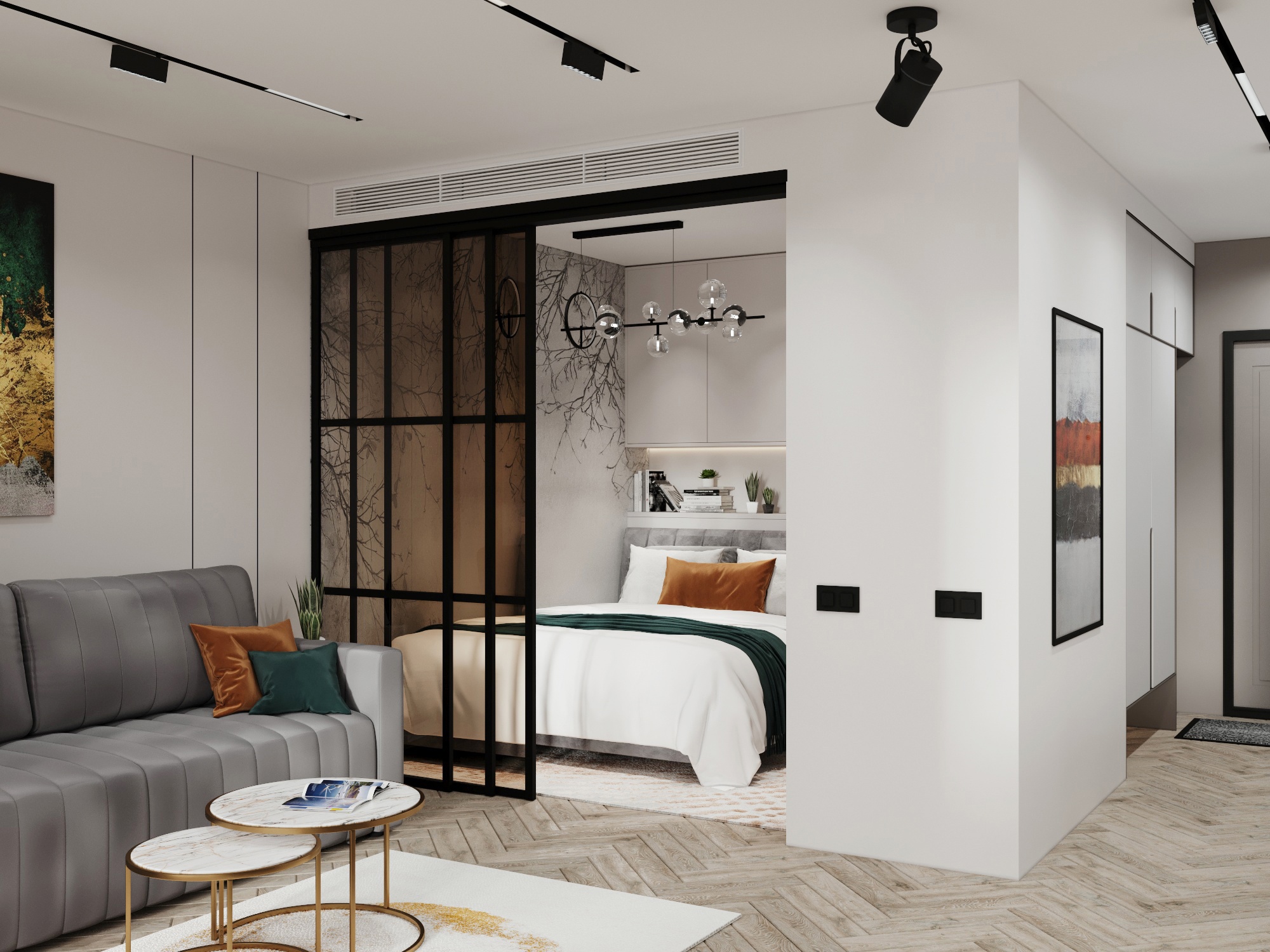 Проект однокомнатной квартиры площадью 45 м² в ЖК Форест. Задача была выделить спальную комнату или зону с хранением вещей, а также зону гостиной, где разместить раскладной диван и ТВ.
