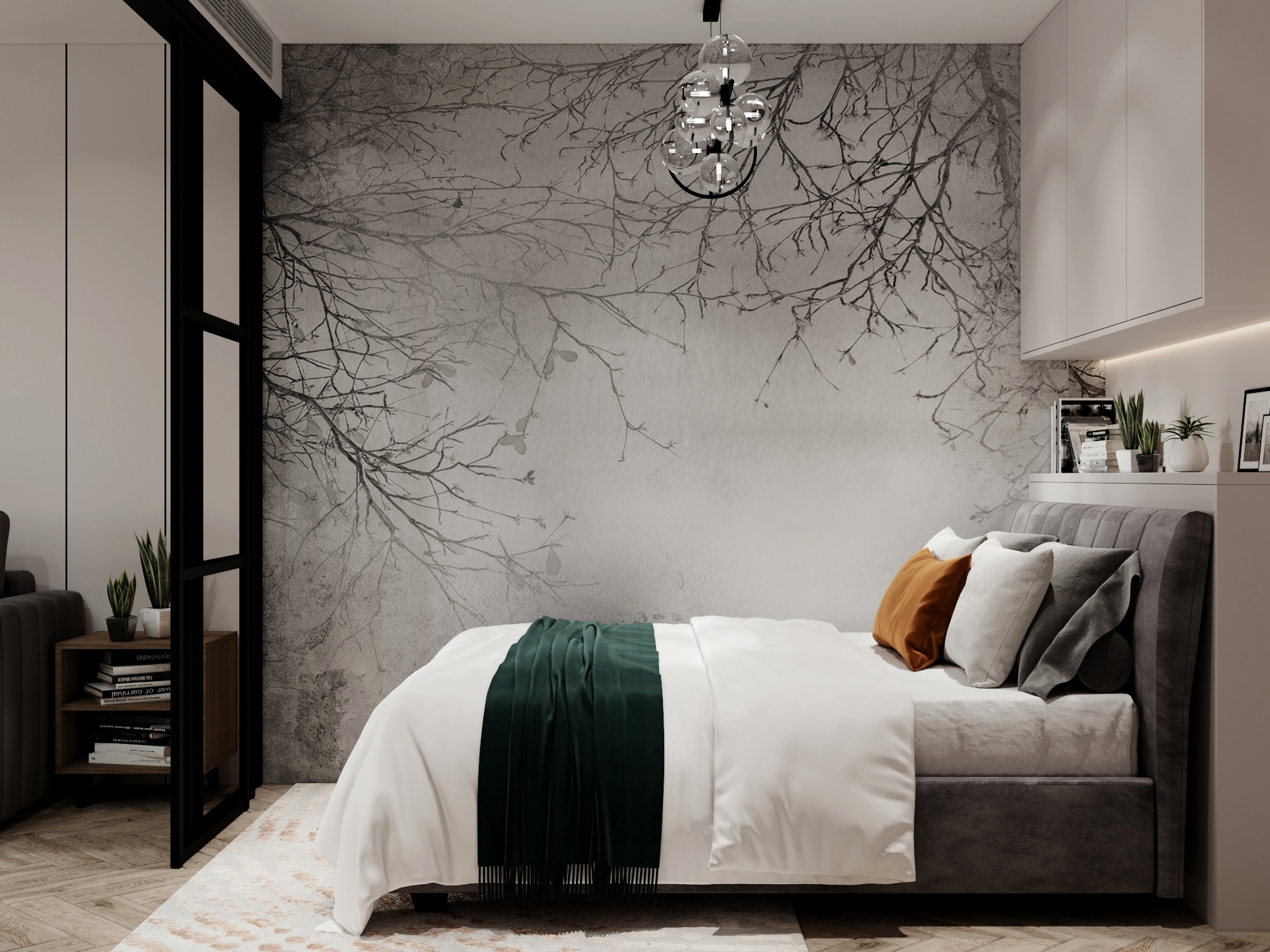дополнительное хранение. Обои на стене из коллекции Vetve придают уют и ощущение единения с природой.