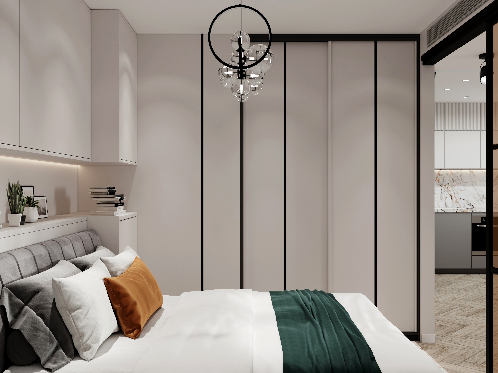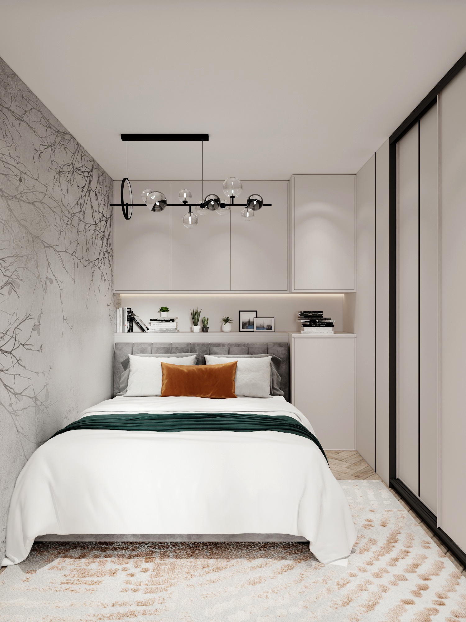 спальни. В спальне расположил максимум мест для хранения, за изголовьем