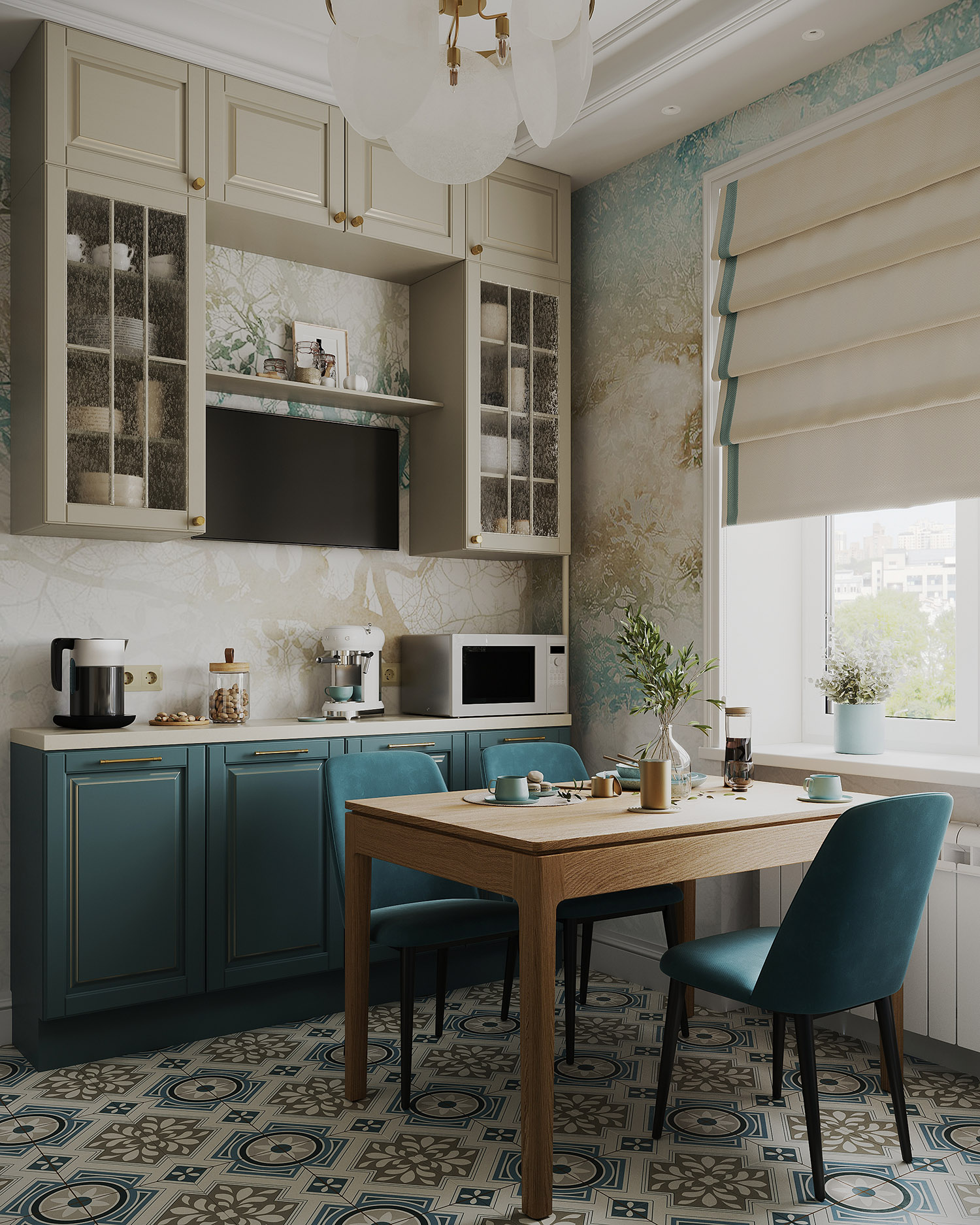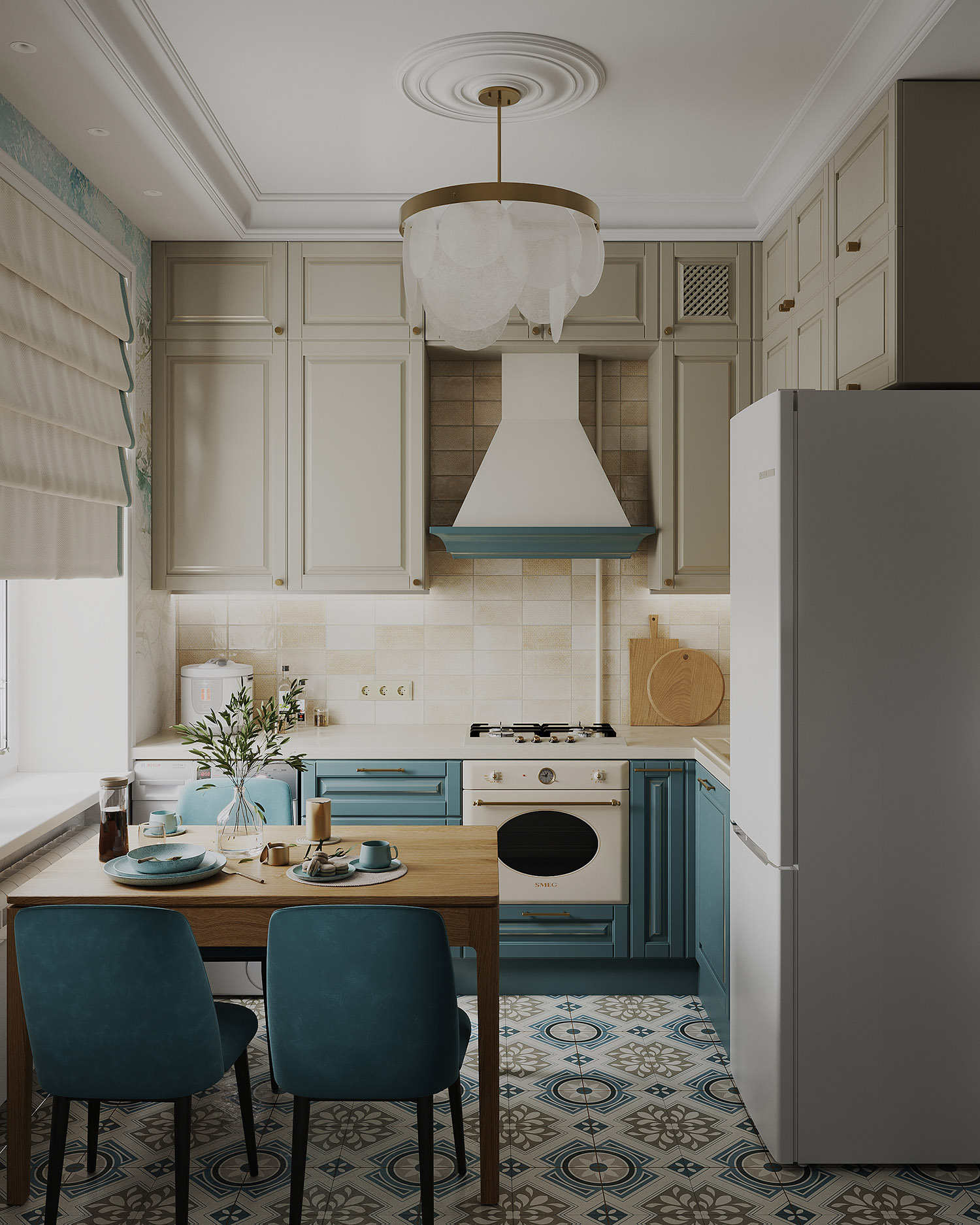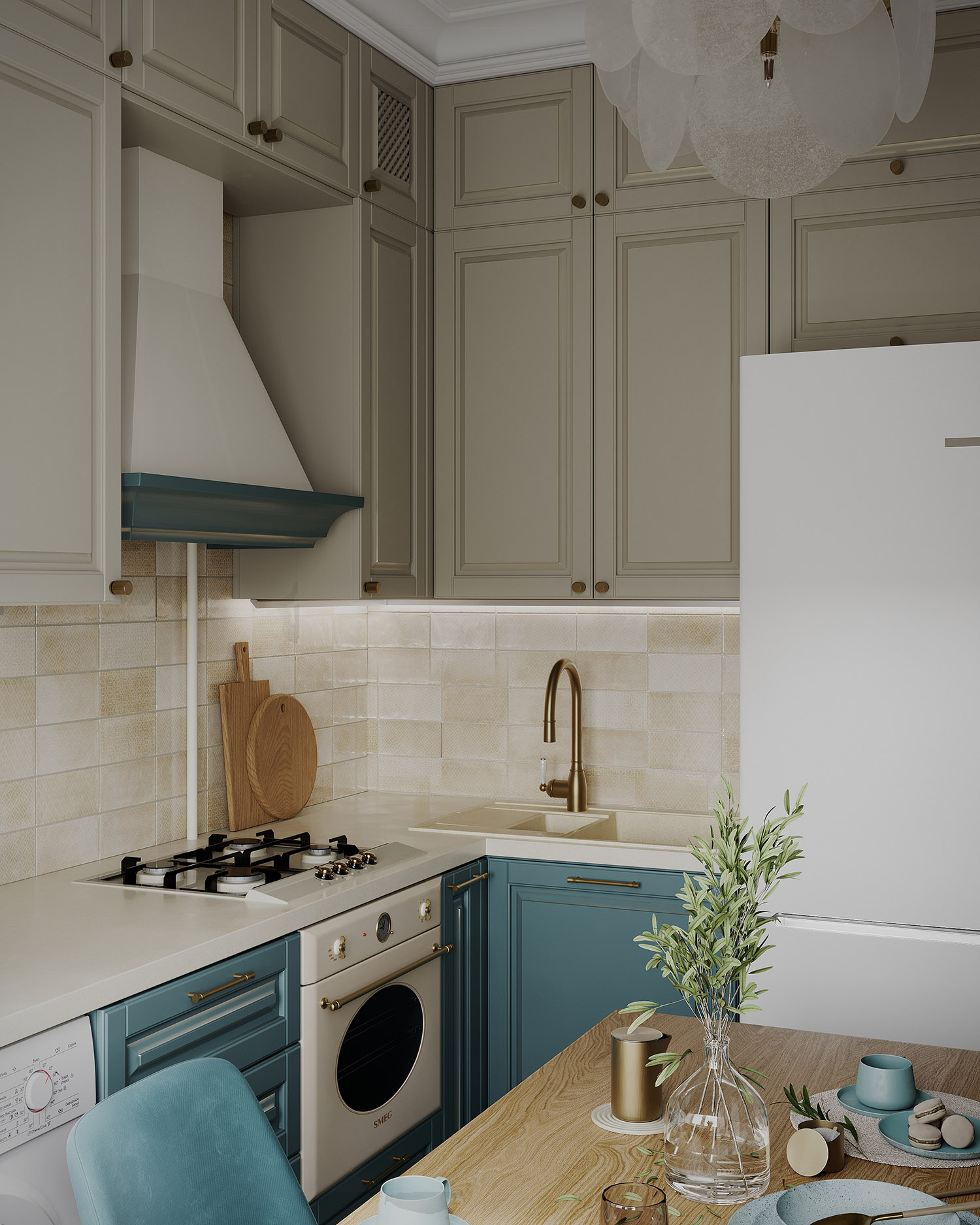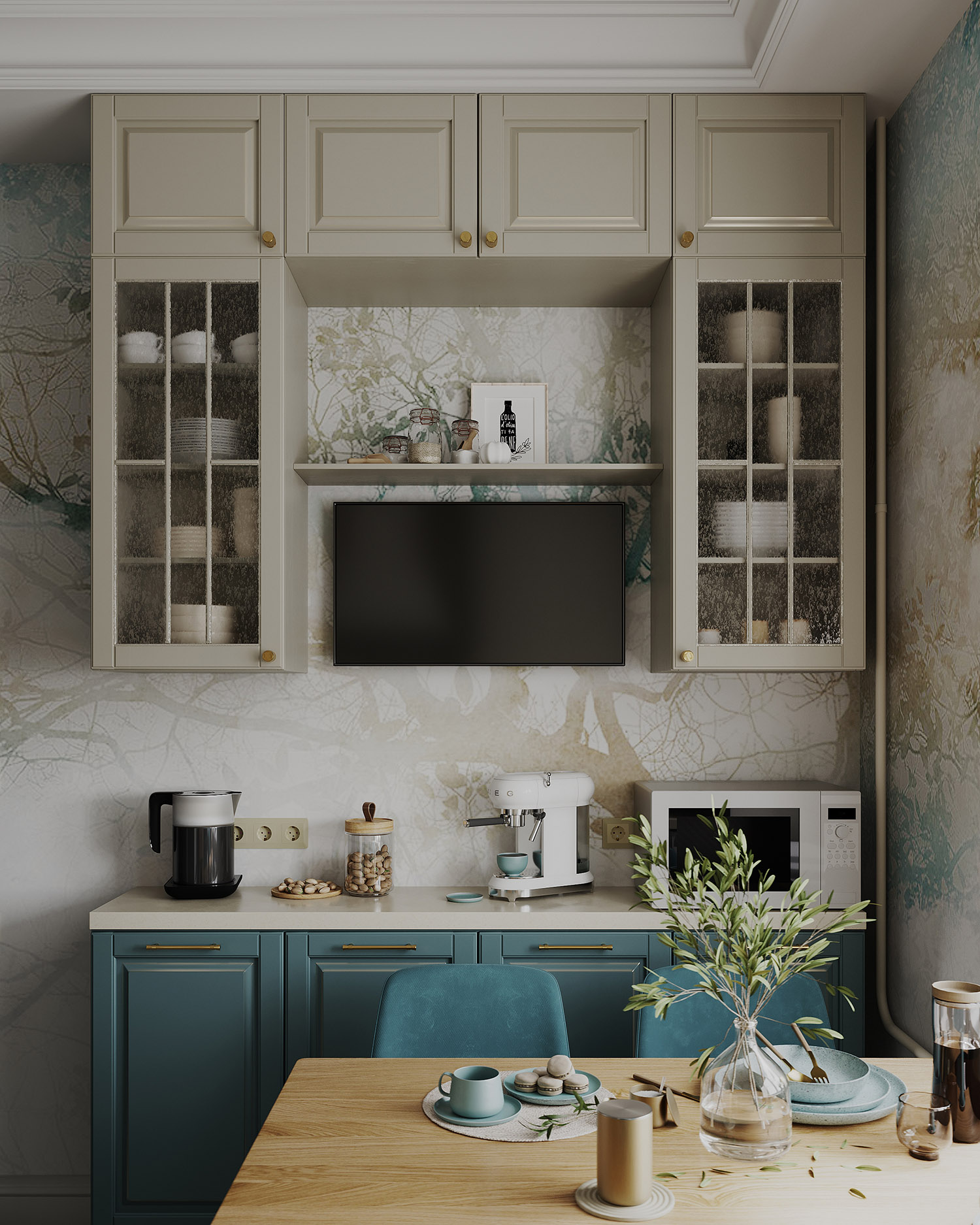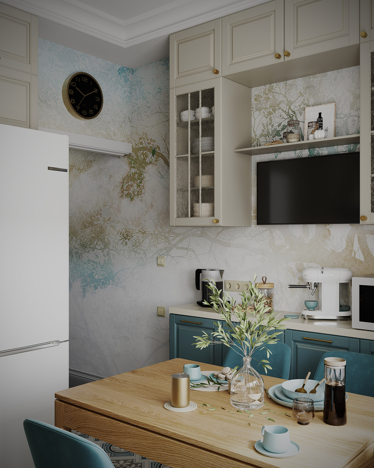На кухне, как и в продолжении стены коридора, использованы обои из коллекции «Vetve», они стали объединяющим элементом всего интерьера. Заказчики с первого раза утвердили визуализации, и сейчас уже во всю идет реализация проекта.