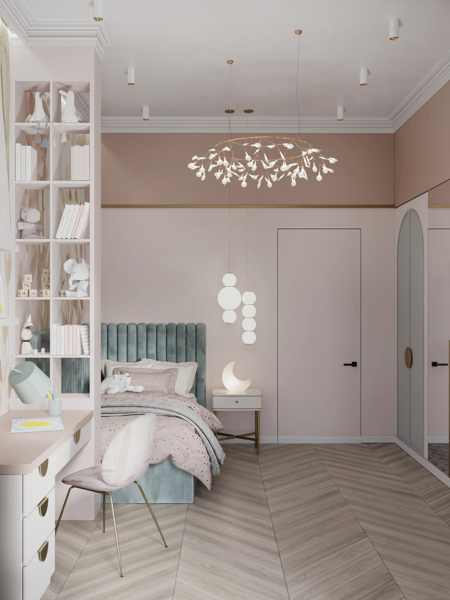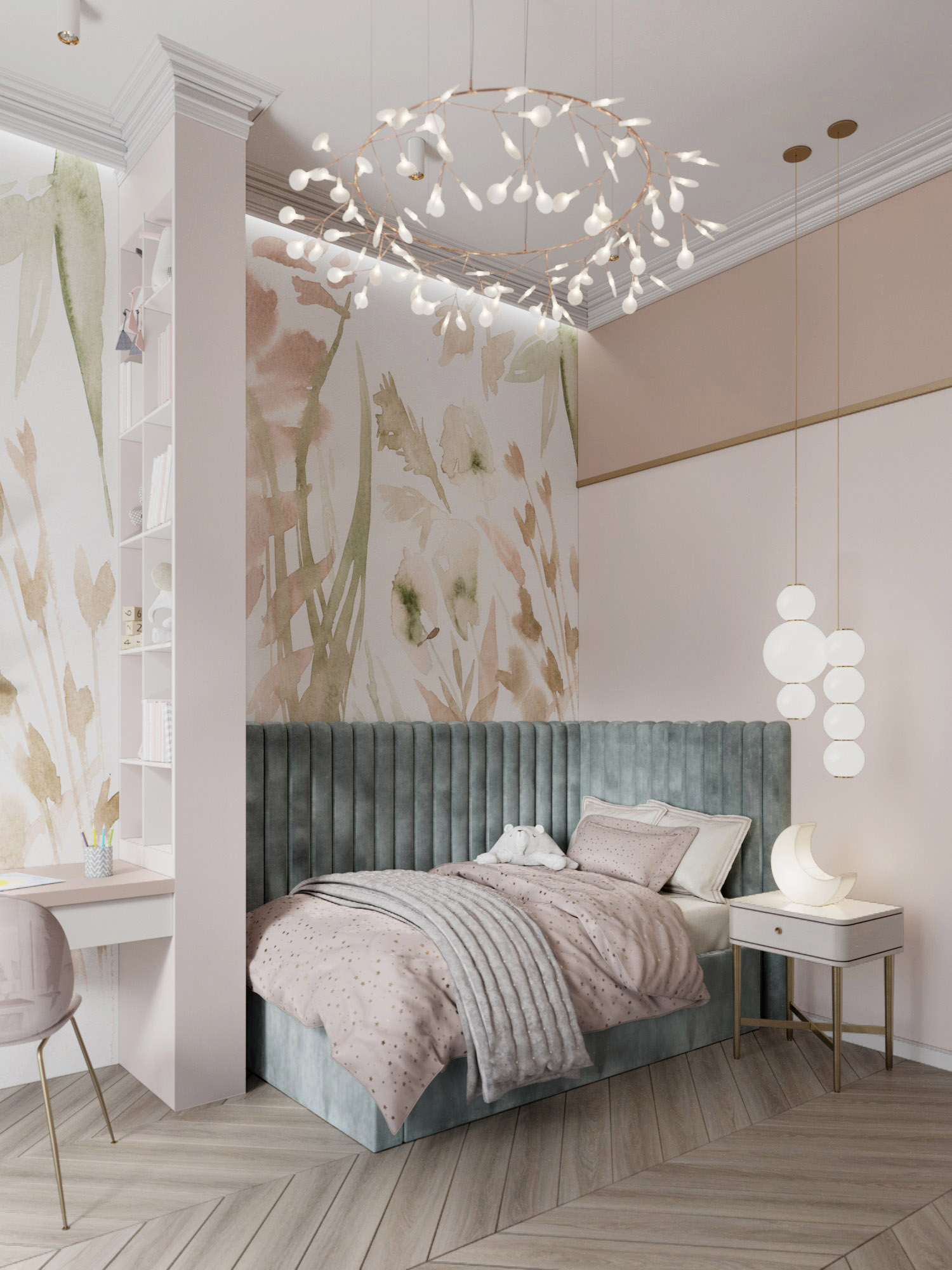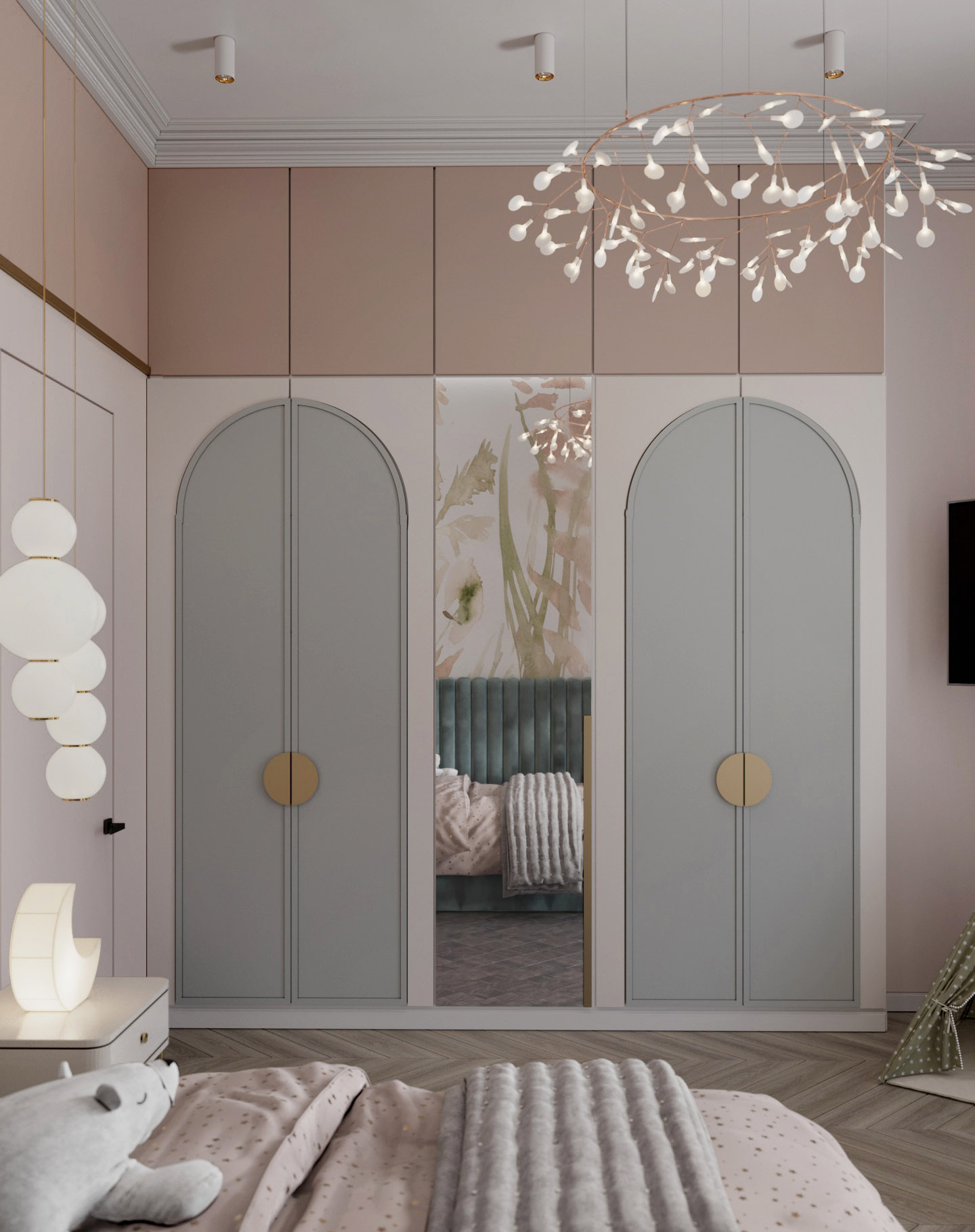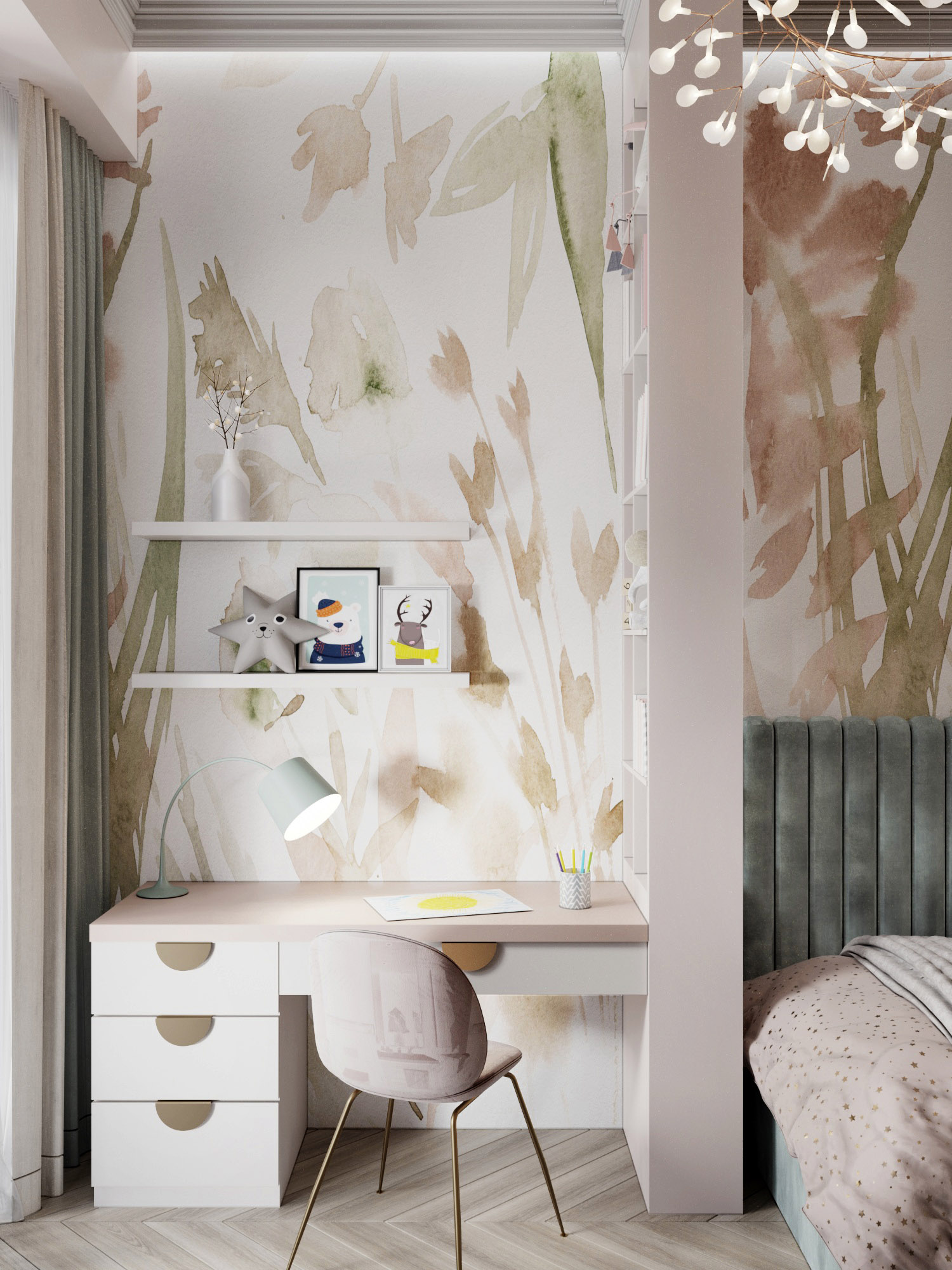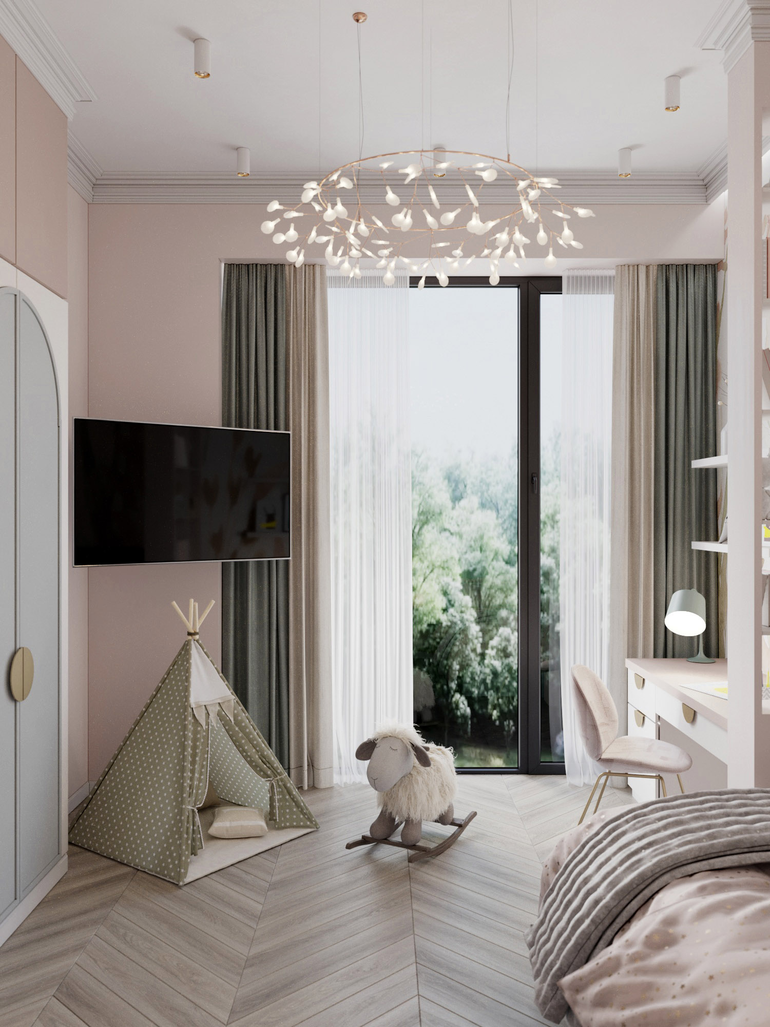 Проект выполнен в г. Сочи, в частном доме. Это детская площадью 15,6 м² для девочки. Задачей было создать пространство, которое будет придавать комнате настроение «сказочности». Но в то же время было важно, чтобы с взрослением ребенка интерьер не оказался слишком детским.