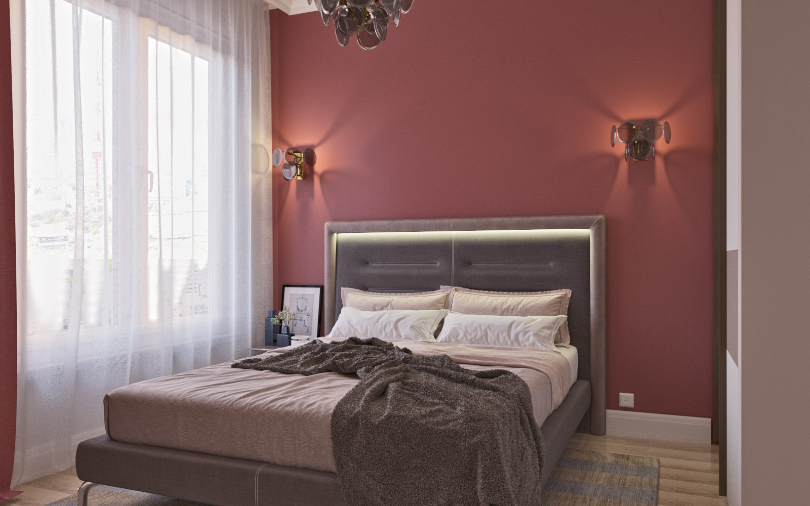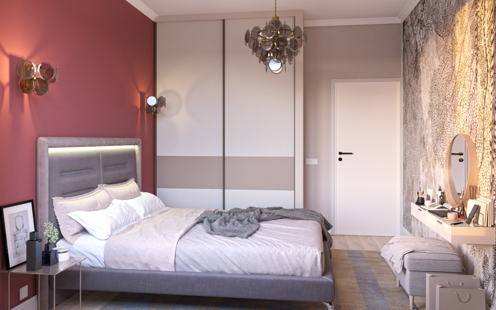 «Это проект квартиры для семьи с двумя сыновьями в г. Санкт-Петербург, спальня родителей. Комната небольшого размера — всего 12,2 м². Здесь отлично разместились двуспальная кровать, встроенный шкаф и туалетный столик», — делится с нами автор этого проекта Мария.