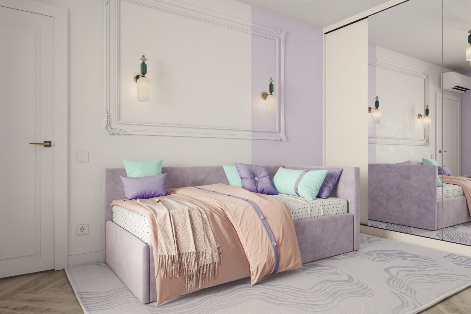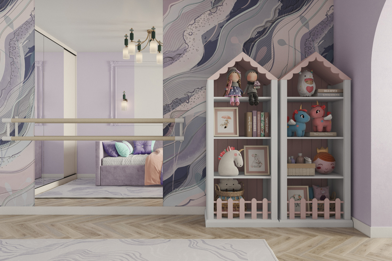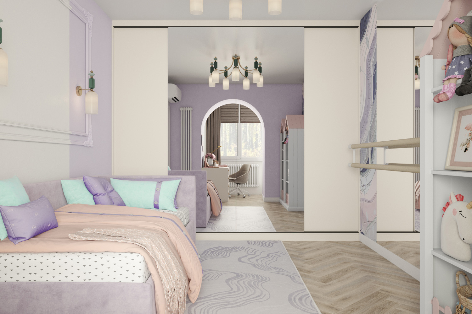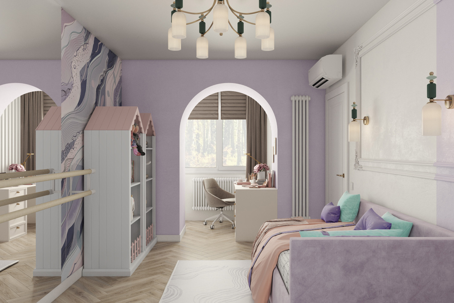 Сказочная детская комната площадью 15,8 м² для юной балерины из города Фролово, у которой любимый персонаж — Русалочка. Атмосферные бесшовные обои с принтом морских волн из коллекции «Waves» помогают окунуться в сказочный подводный мир и почувствовать себя настоящей русалкой.