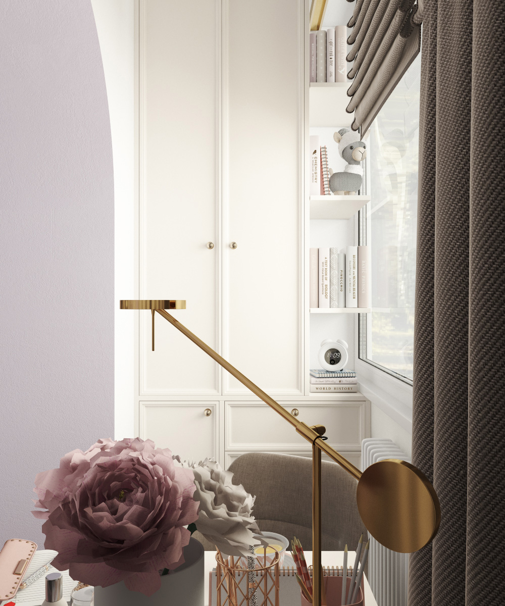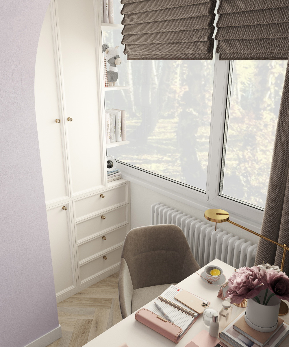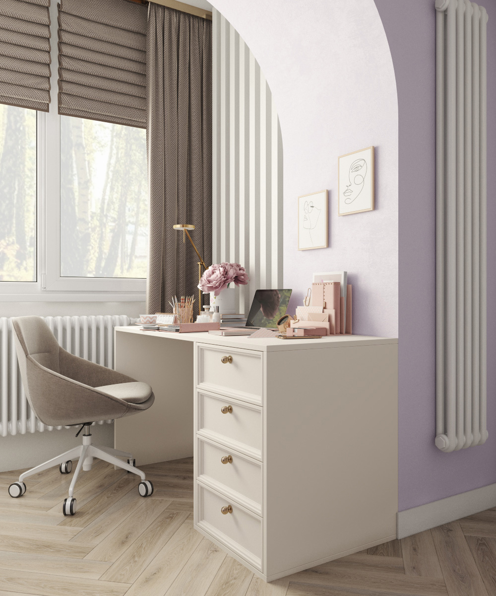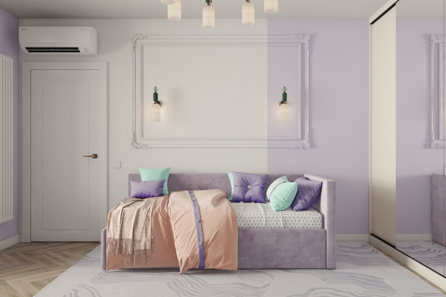 Сказочная детская комната площадью 15,8 м² для юной балерины из города Фролово, у которой любимый персонаж — Русалочка. Атмосферные бесшовные обои с принтом морских волн из коллекции «Waves» помогают окунуться в сказочный подводный мир и почувствовать себя настоящей русалкой.